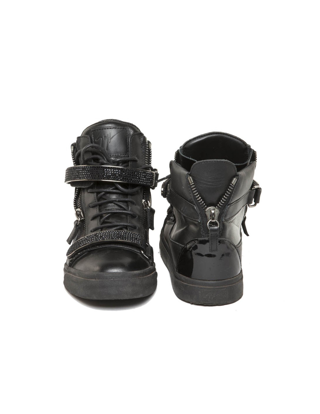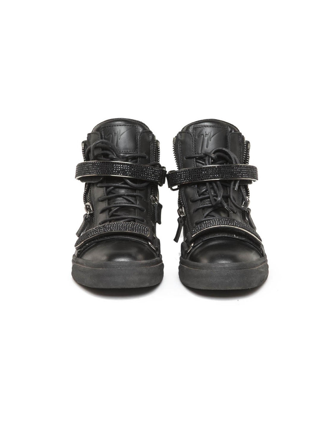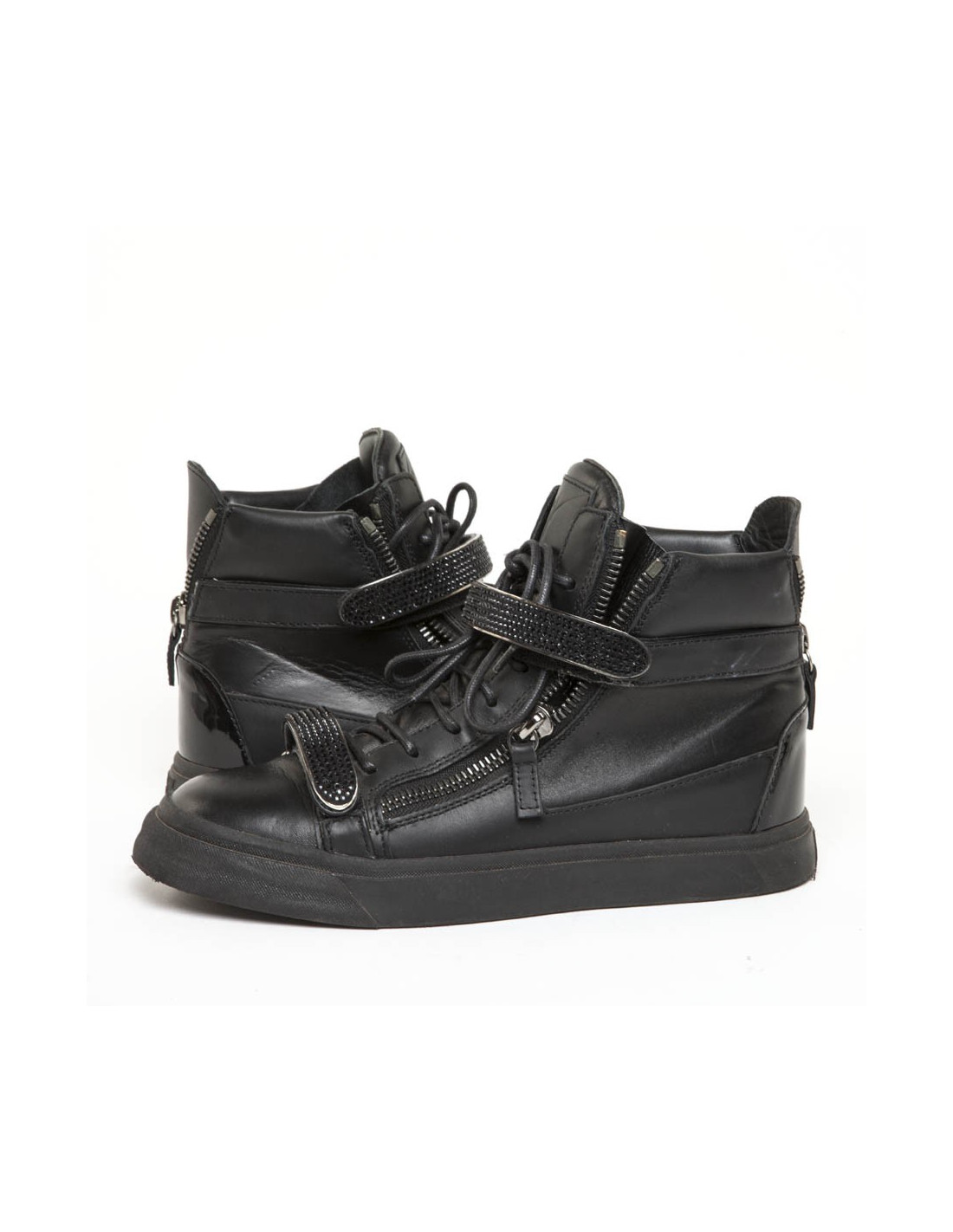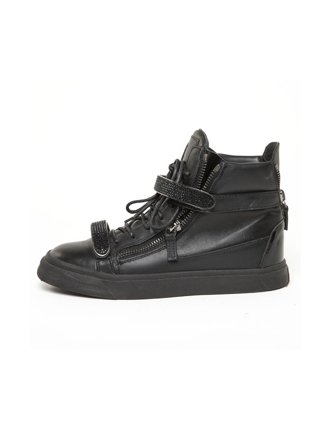 Basket montantes Giuseppe Zanotti en cuir et strass noir. Fermeture à lacets, par un zip et avec deux scratch.
