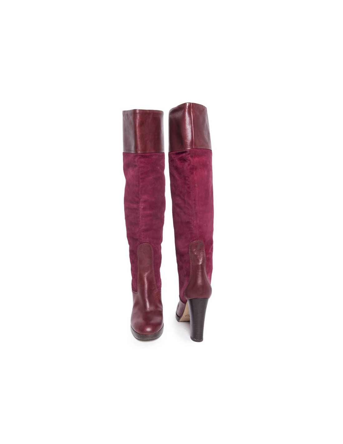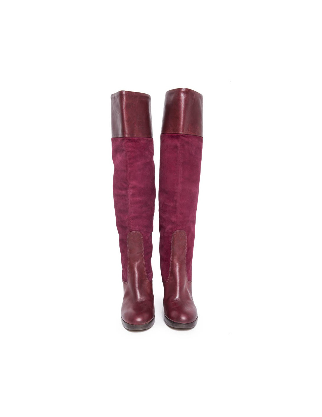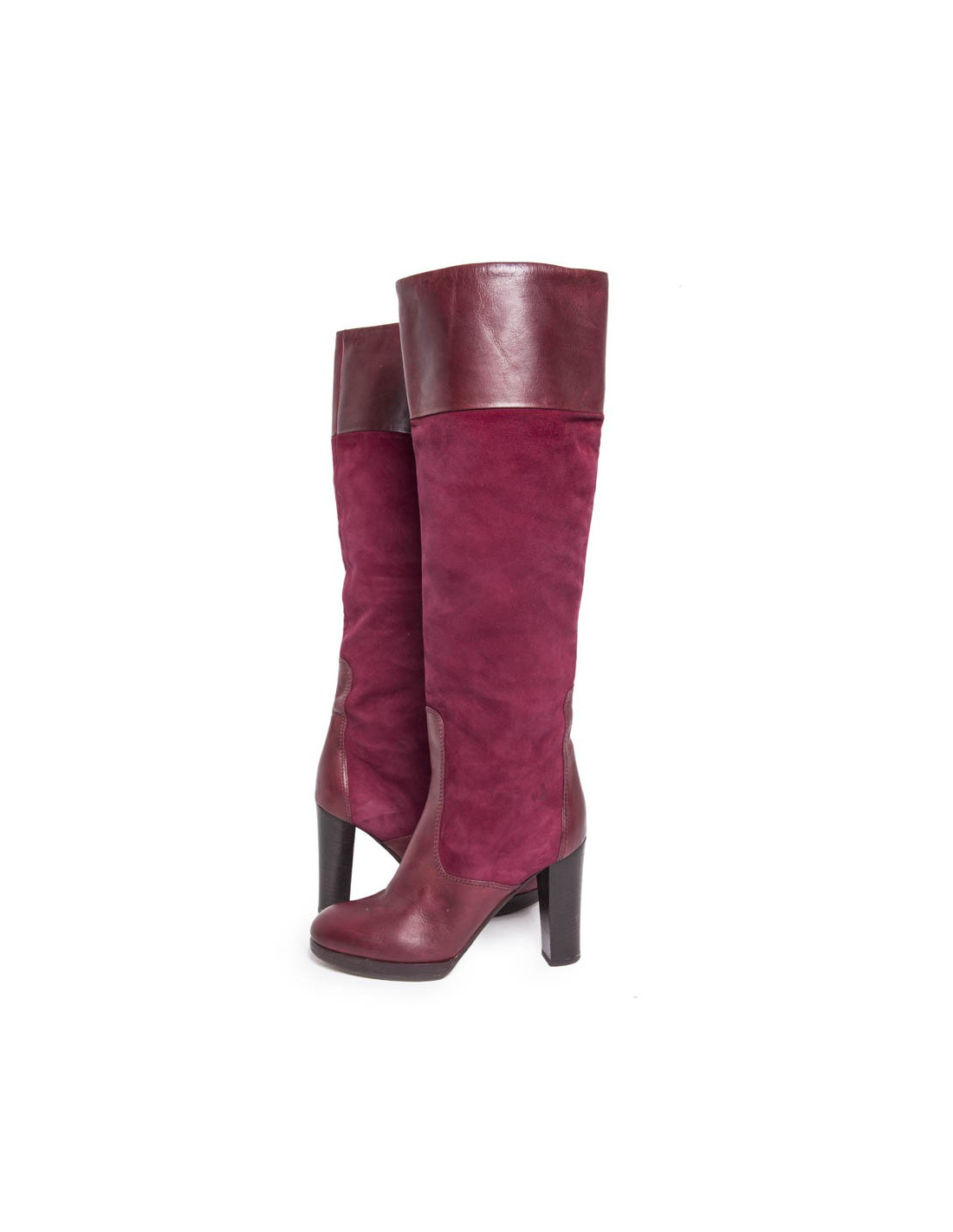 Une paire de bottes T 36.5 CHLOE en veau velours cerise et cuir bordeaux :