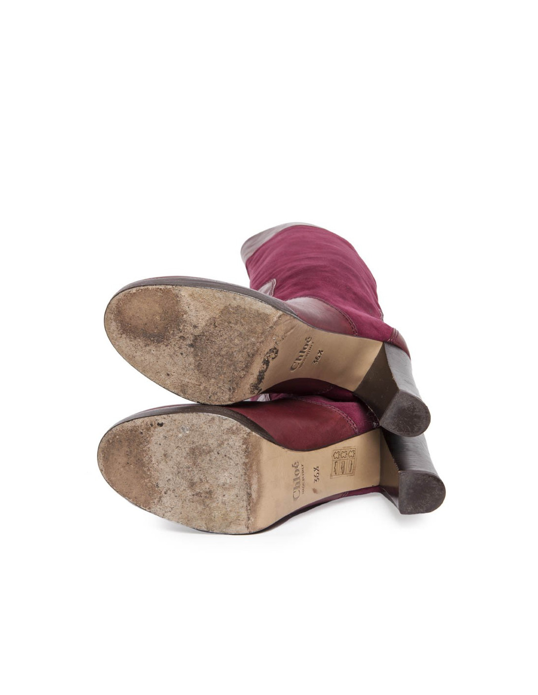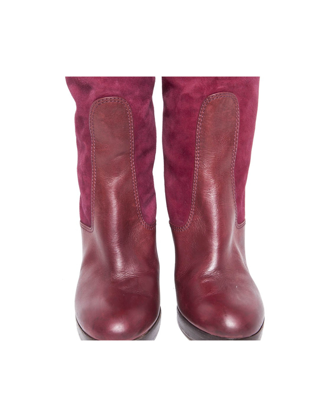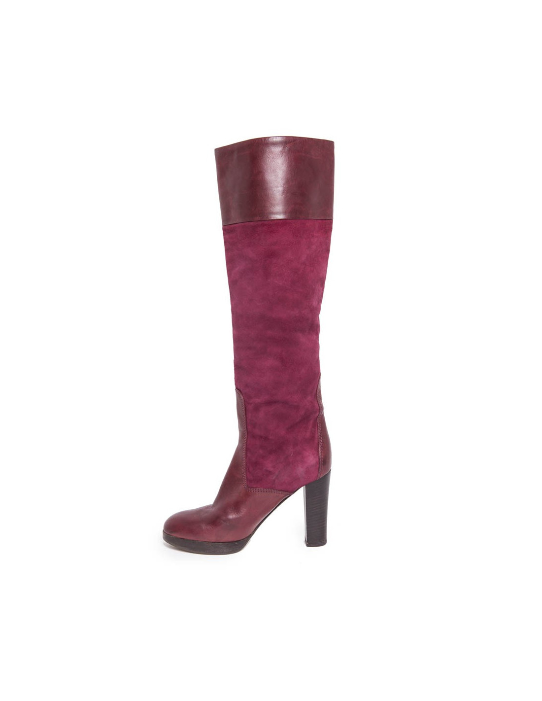 Une paire de bottes T 36.5 CHLOE en veau velours cerise et cuir bordeaux :