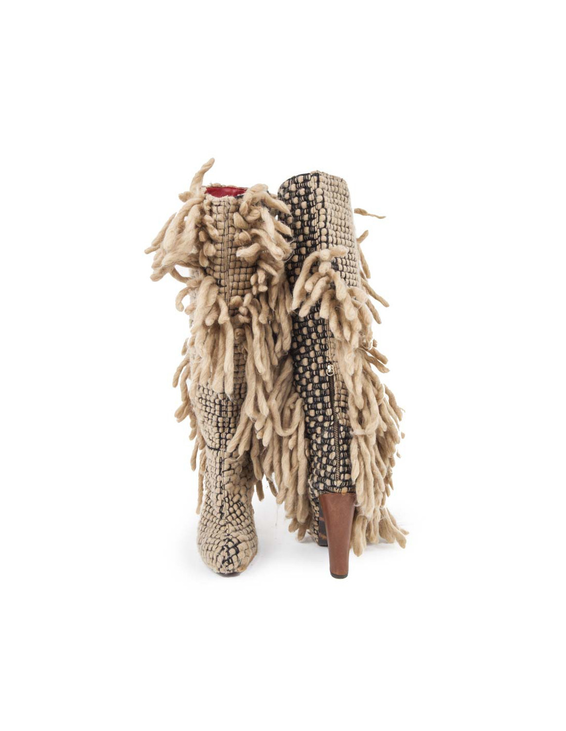 Ces Bottes CUSTO sont à franges en laine bicolore noir et beige clair. C'est une taille 39 Fr. L'intérieur est en cuir rouge monogram. Une fermeture zippée à l'arrière facilite l'enfilage de la botte. la semelle est en cuir marron. Elles sont en très bon état. La laine peluche à certains endroits. Quelques tâches de cirage marron au dessus du talon est visible mais est caché sous les franges.