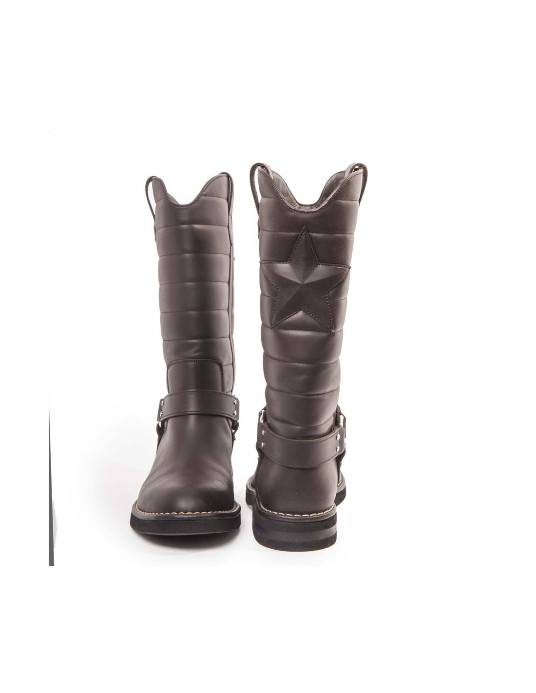 Ces bottes d'occasion issues de la collection " Paris-Dallas " de la Maison CHANEL sont en cuir marron. C'est une taille 40,5 Fr. L' accastillage en métal argenté palladié. Sur L'arrière de la boots une étoile en relief dans le cuir de la chaussure est dessinée. la semelle de la chaussure est en caoutchouc. Elles ont une style motard. On les adore. Elles n'ont jamais étaient portées.