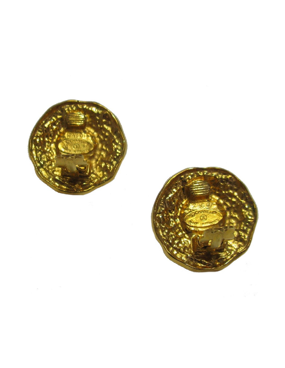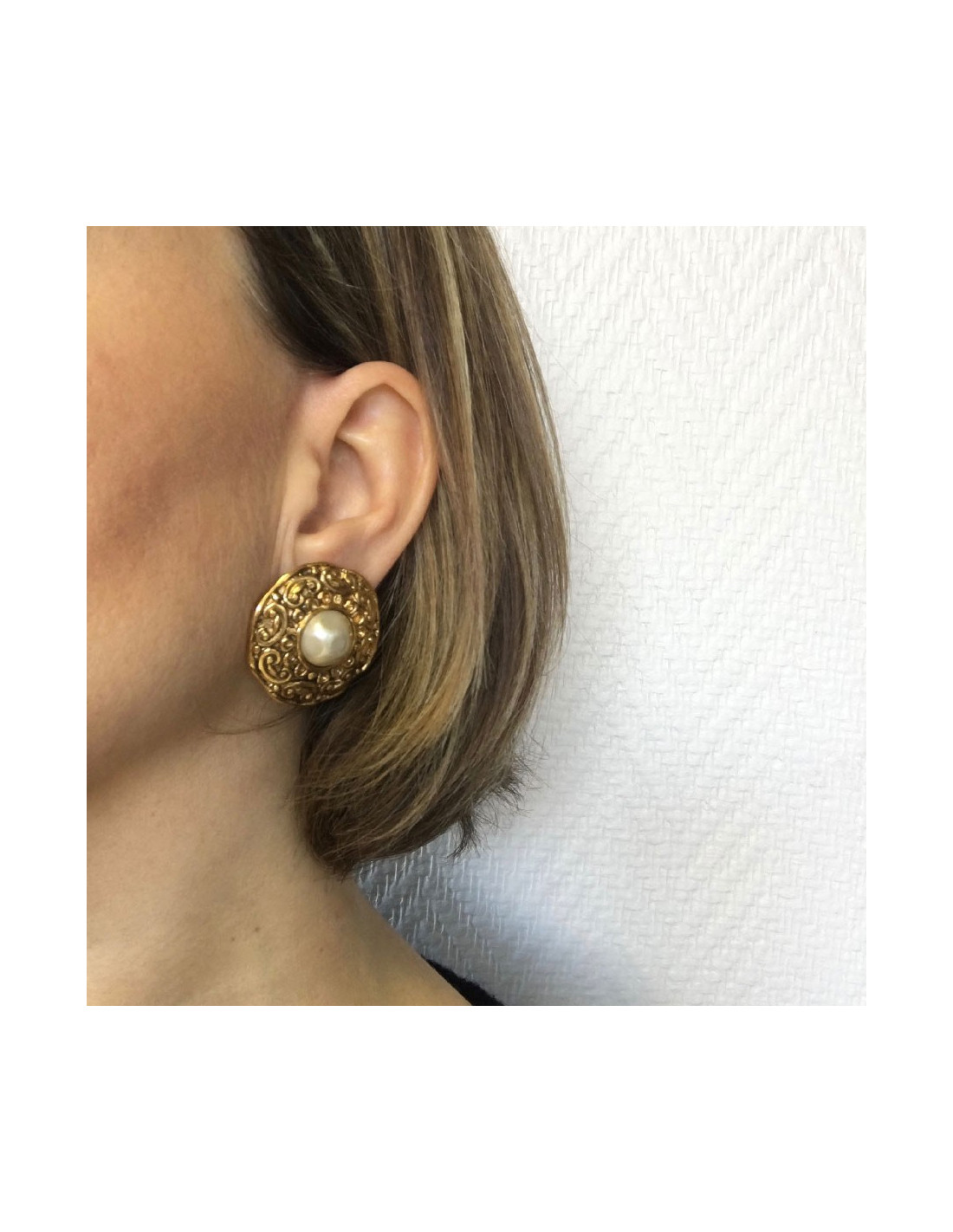 Boucles d'oreille Chanel clips ronds en métal filigrané doré et une perle nacrée au centre.