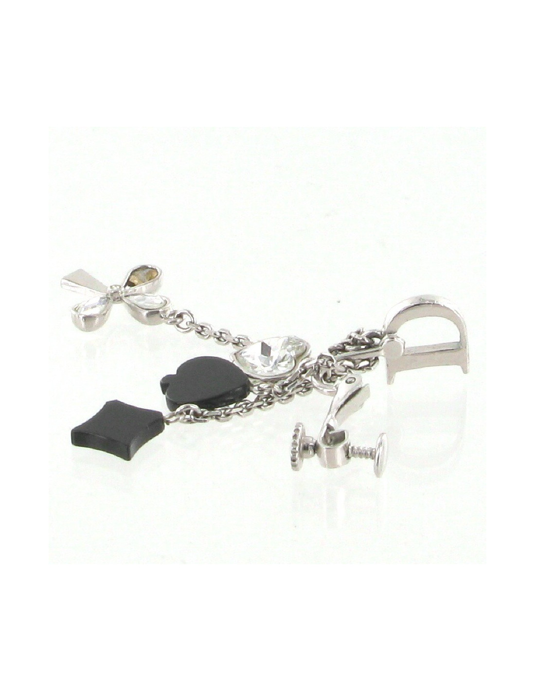 Magnifiques clips d'oreilles DIOR en métal argent palladié. "D" en métal argent palladié paré de 4 pendants représentants les 4 enseignes que l'on trouve habituellement sur les cartes à jouer. Il y a un coeur argent palladié sertie d'un strass, 1 trèfle argent palladié sertie de strass, 1 pique en résine noire, 1 carreau en résine noire. Le fermoir clip est réglable grâce à une petite visse. Quelques rayures sur le "D". (un petit accident sur un carreau très peu visible)