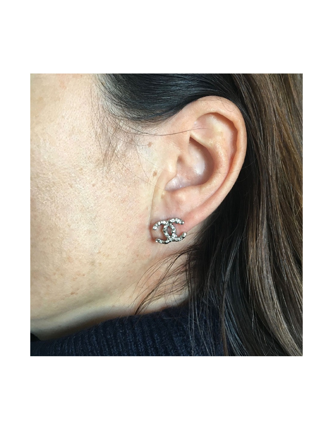 Boucles d'oreille clous Chanel CC argenté et strass