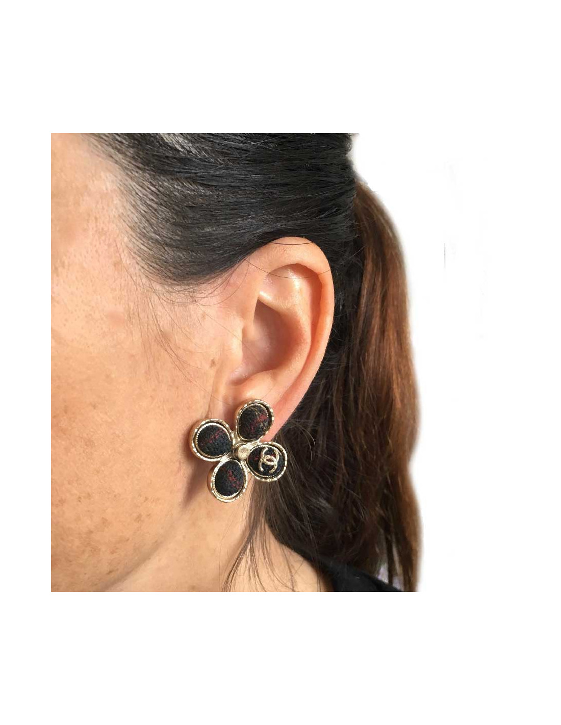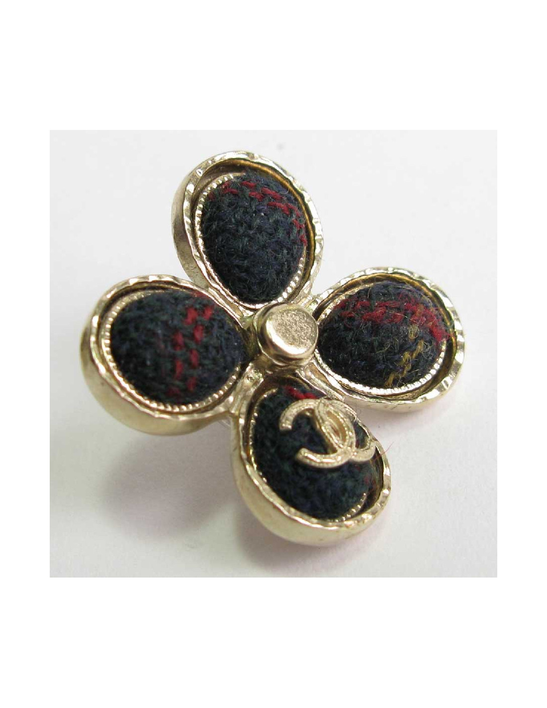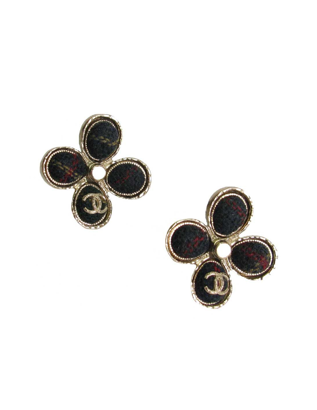 Boucles d'oreille clous Chanel trèfle 'Paris Edimbourg' en métal doré et tweed multicolore à dominante de rouge.