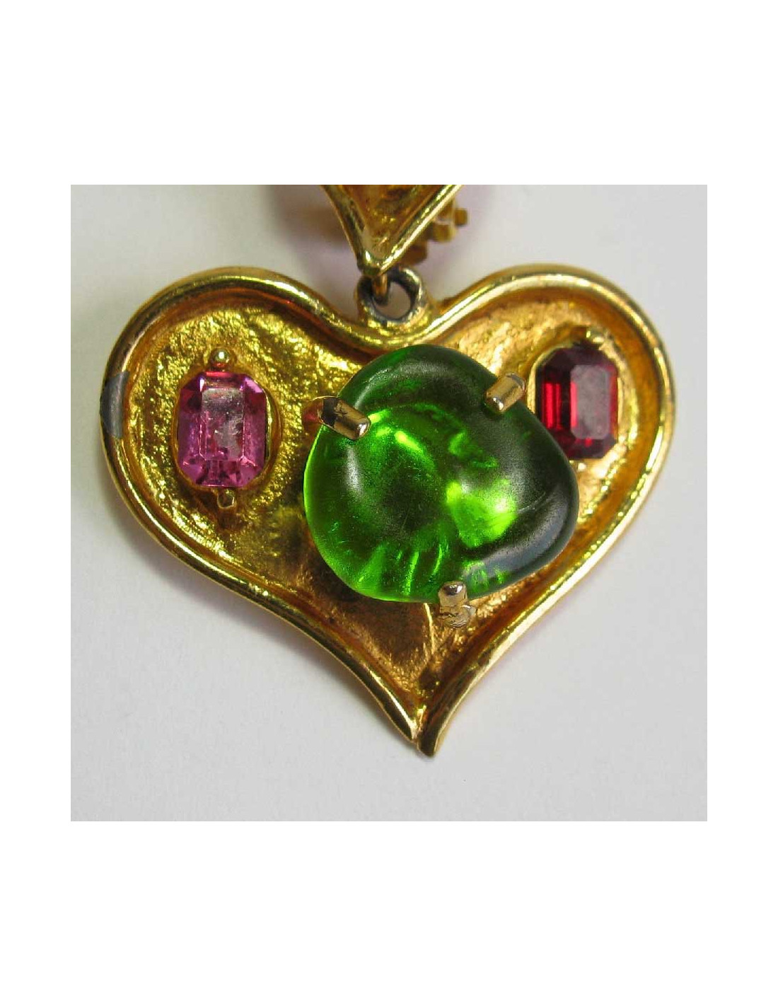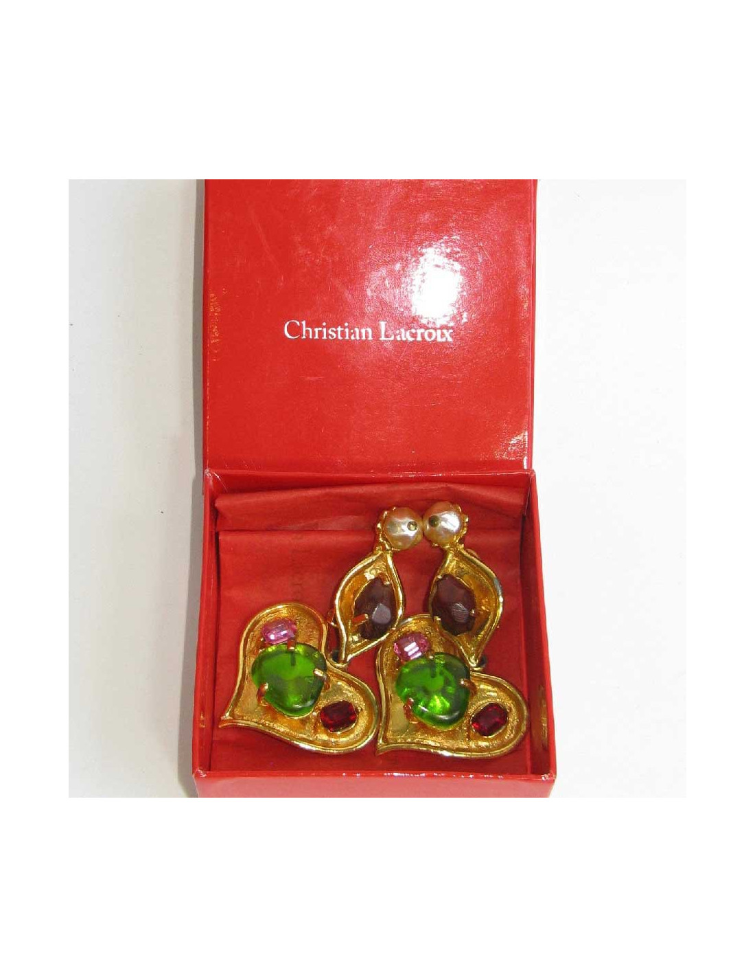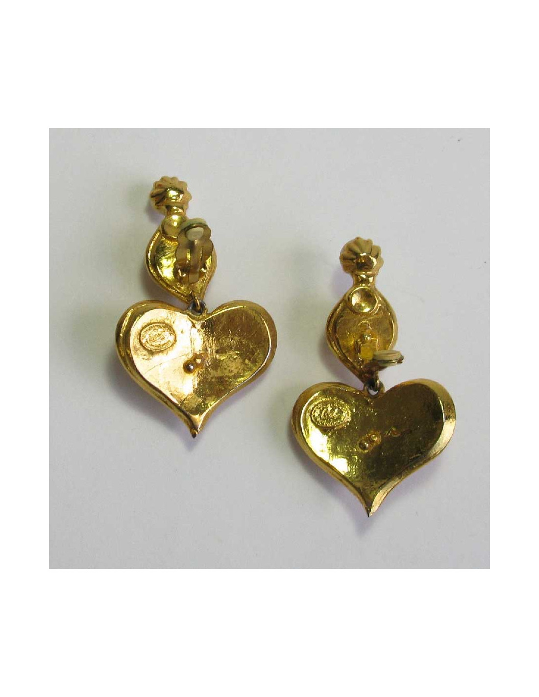Boucles d'oreille clips Christian Lacroix coeur pendant en métal doré et pierres fantaisies.
