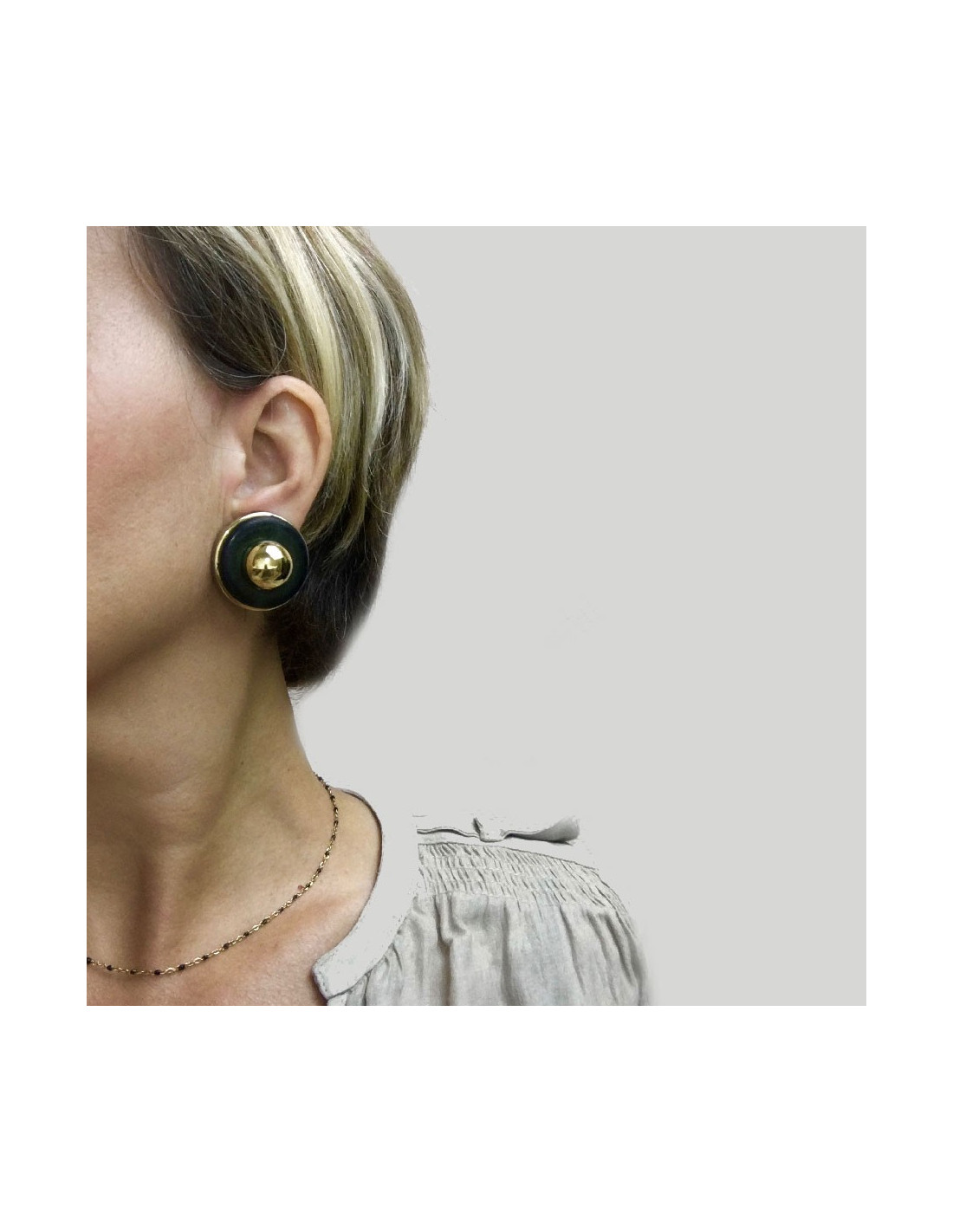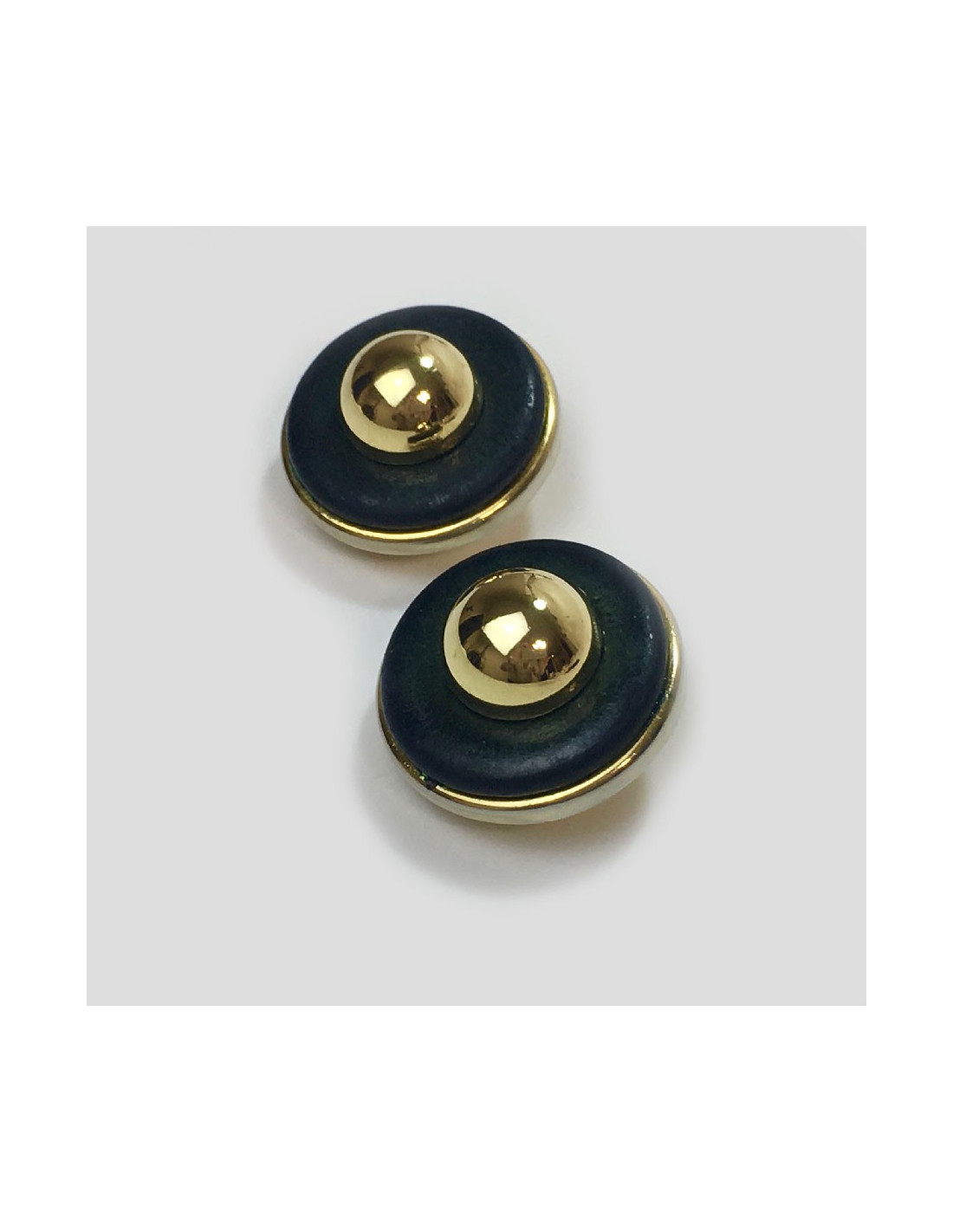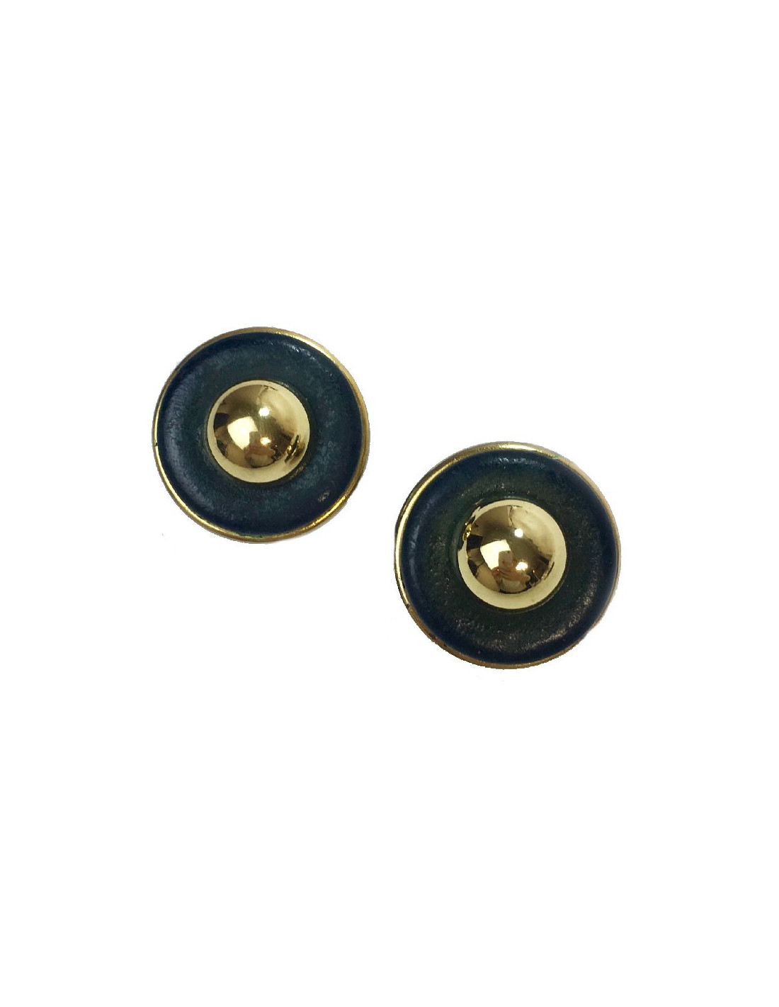 Boucles d'oreille clips Hermès vintage en métal doré, perle dorée et cuir kaki.