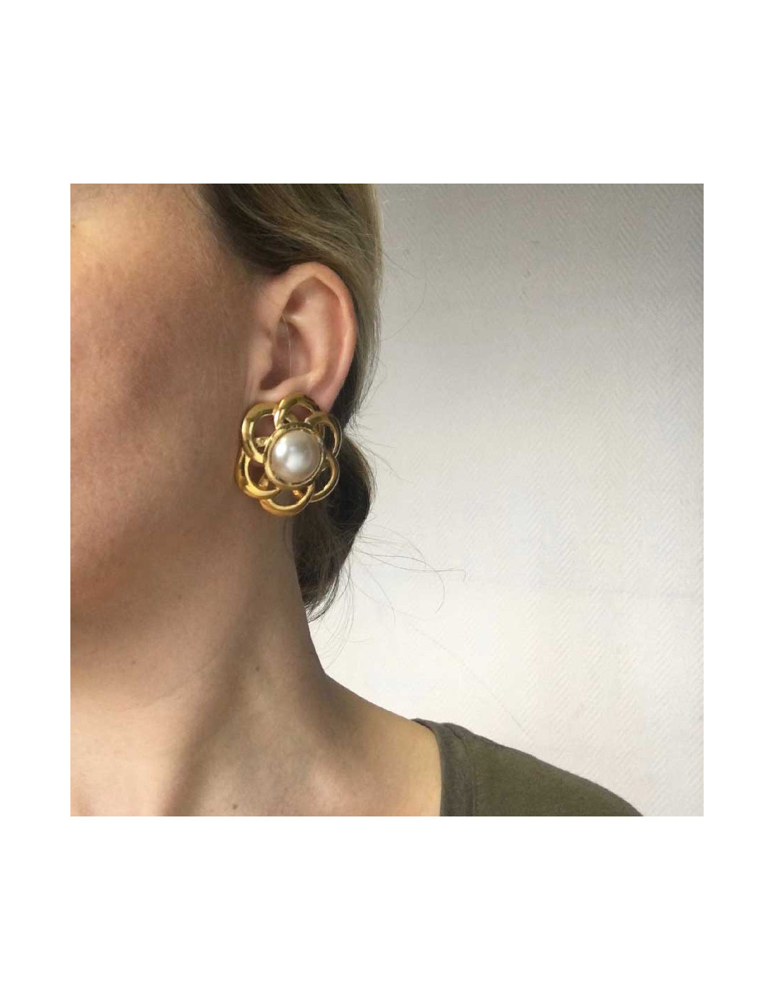 Boucles d'oreille clips CHANEL Couture vintage en métal doré et perle nacrée