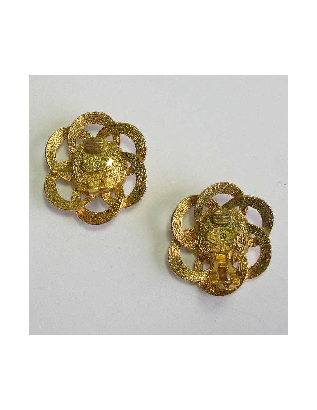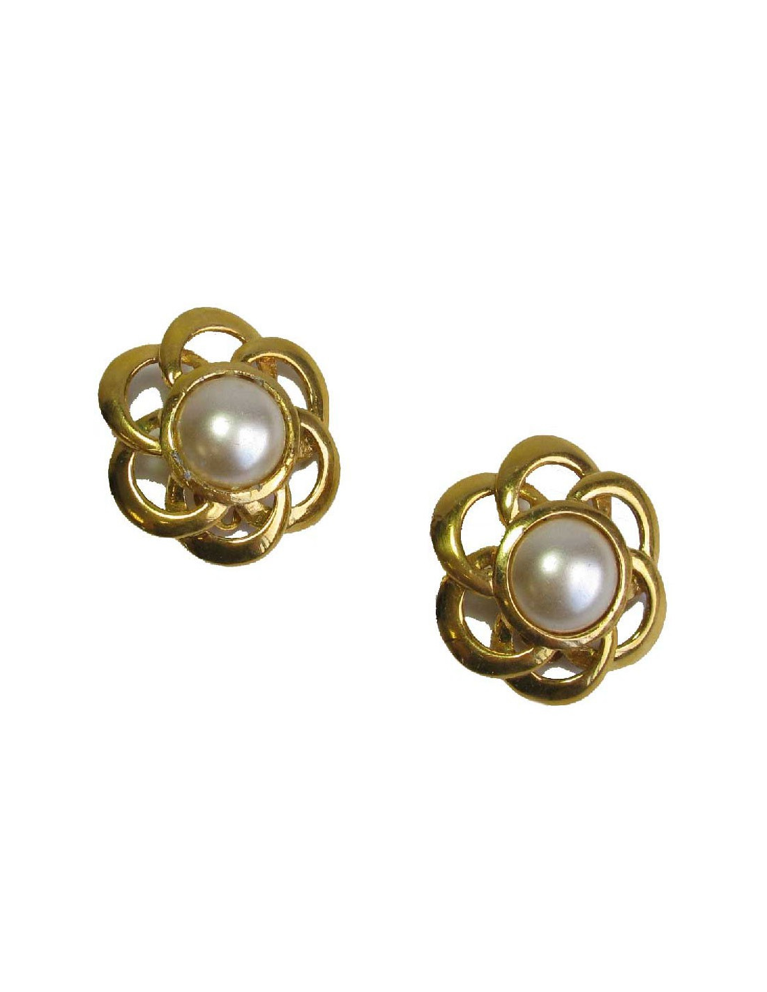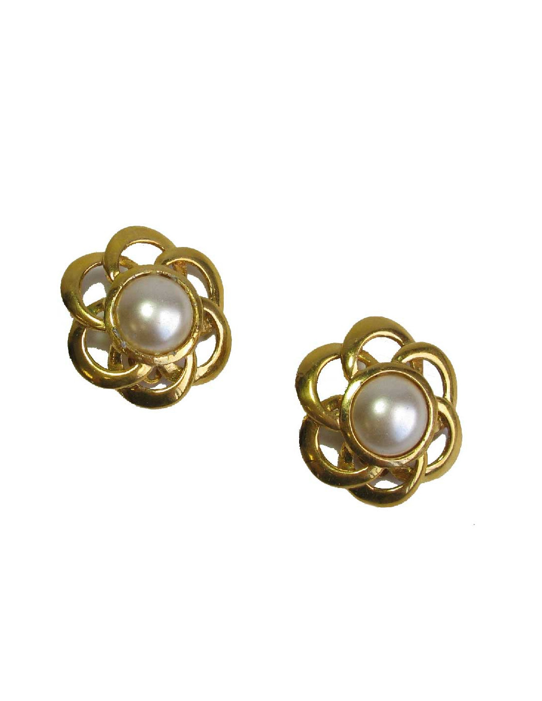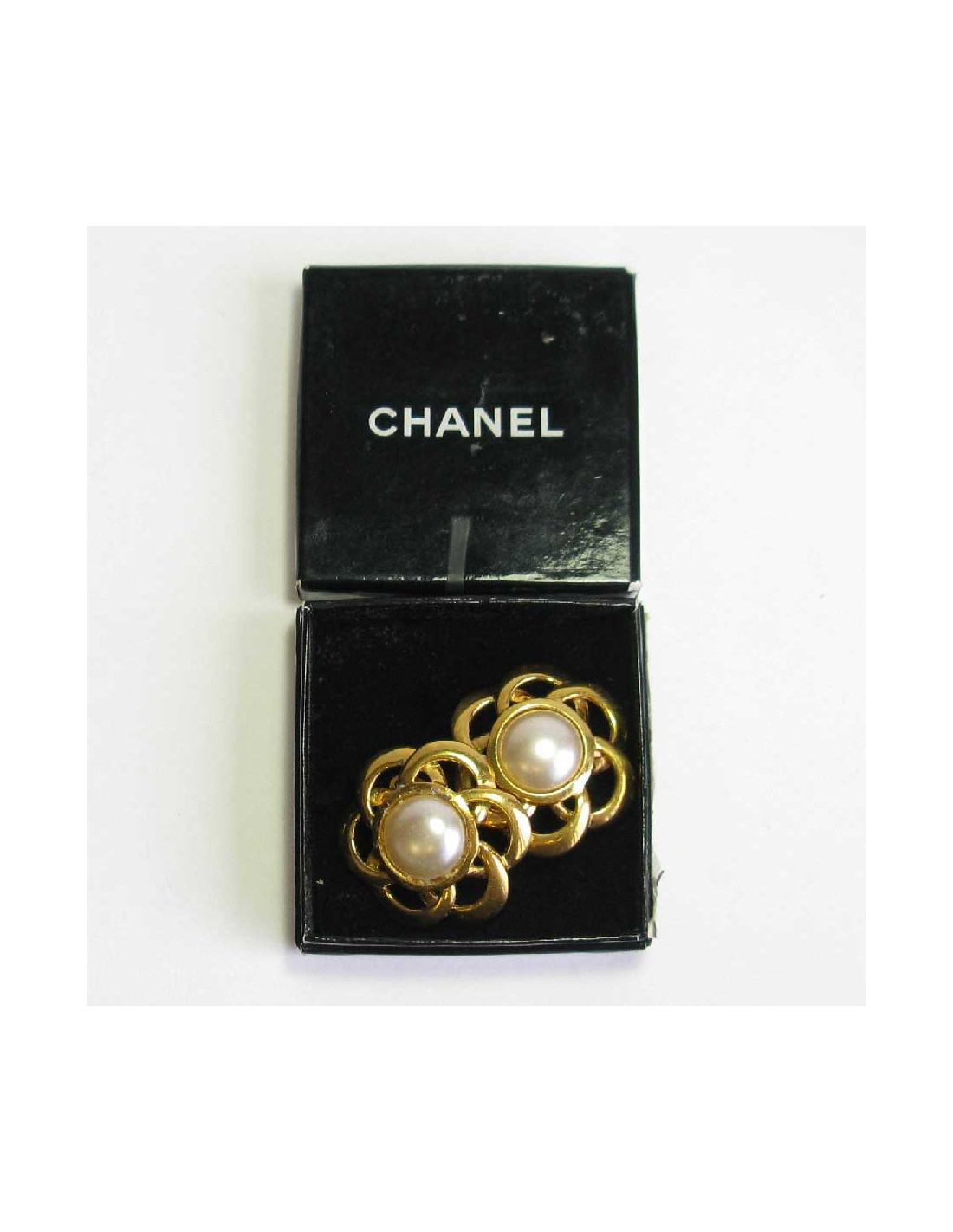 Couture! Boucles d'oreille clips Chanel vintage en métal doré et perle nacrée au centre.