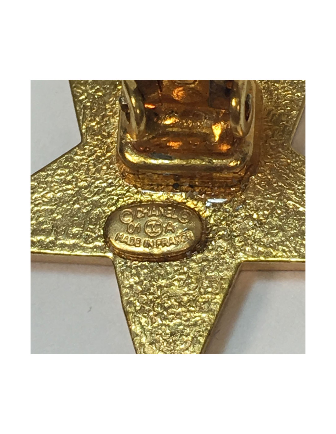 Boucles d’oreilles clips Chanel en forme d’étoile en métal doré émaillé ivoire. Elles sont ornées d’un CC. Elles sont issues de la Collection Automne/Hiver 2001 (pastille Chanel à l’arrière). De légères marques sur la partie ivoire des boucles d'oreille.