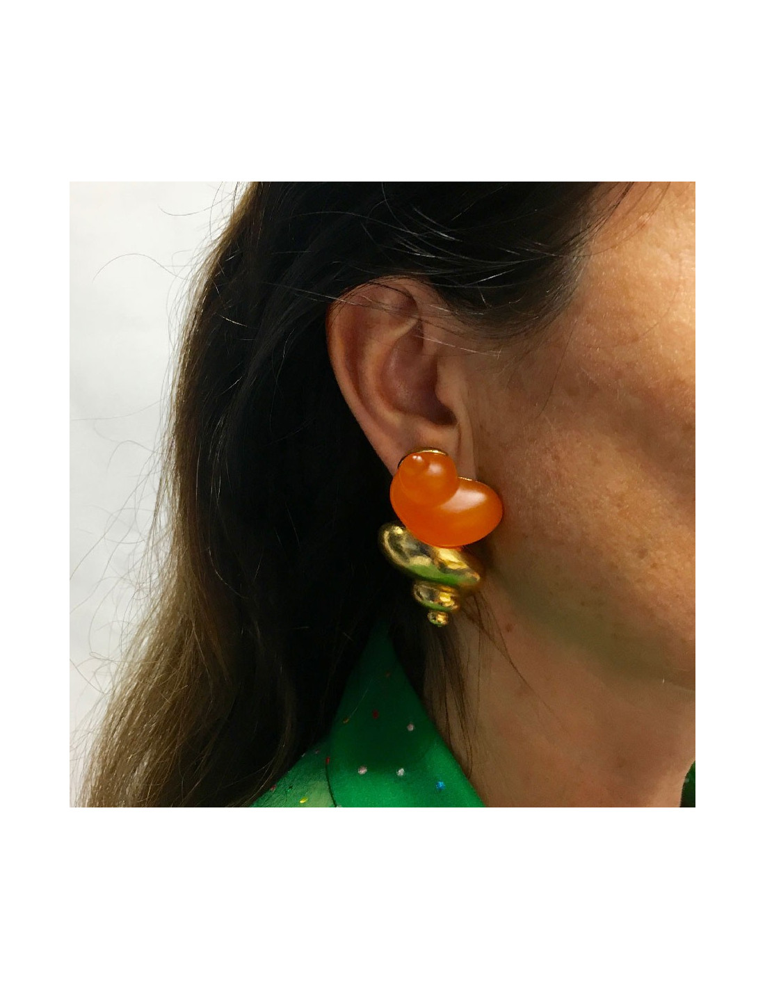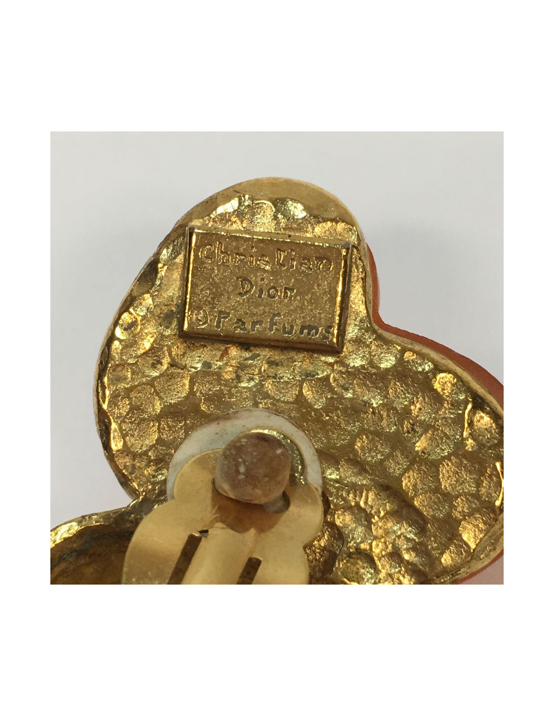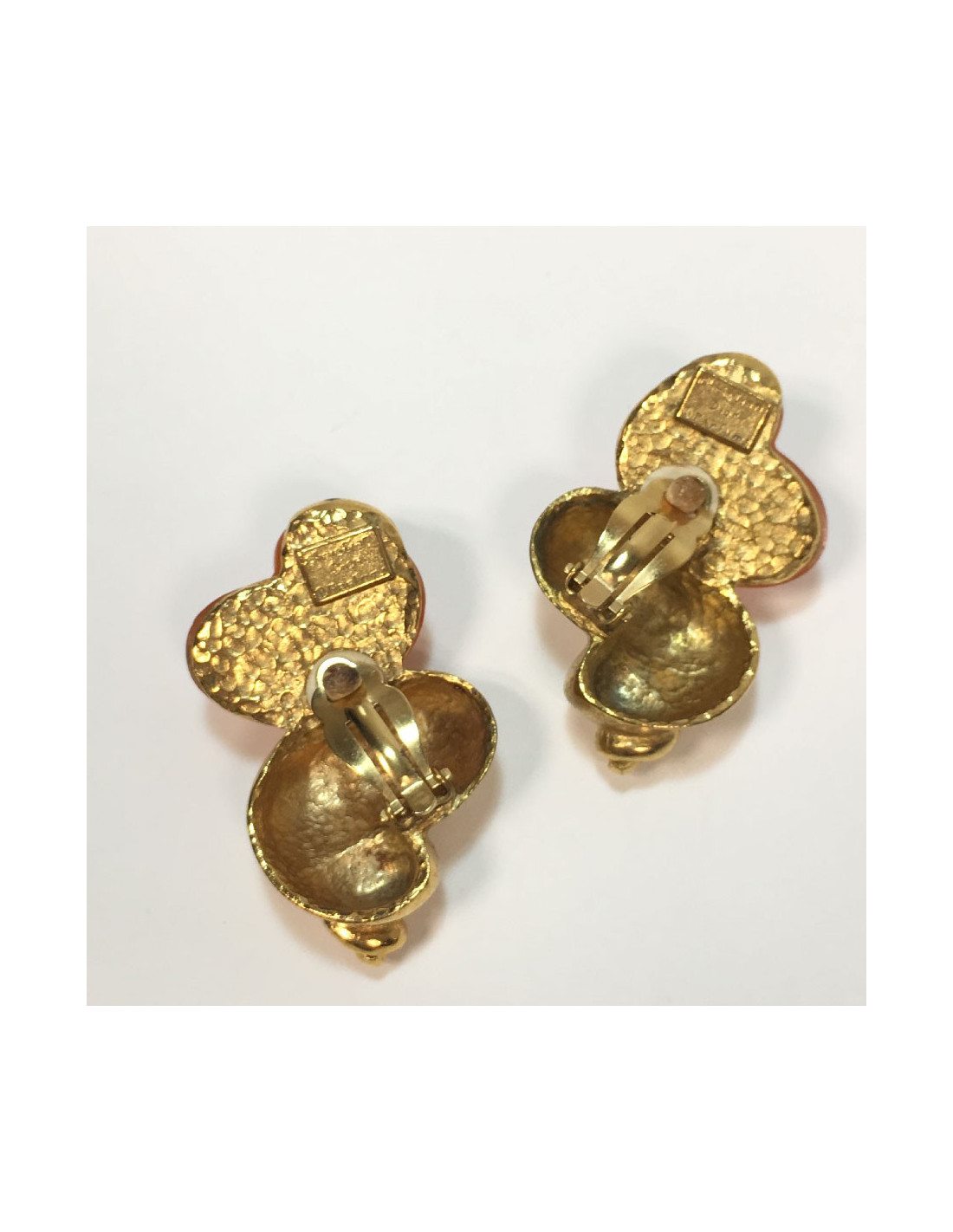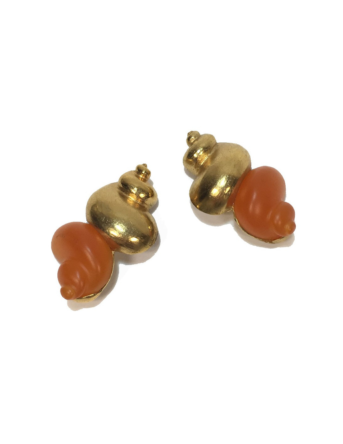 Clips d’oreille en forme de coquillage métal doré et résine corail. État parfait. Réalisés par Robert Goossens, pour le lancement d'un parfum