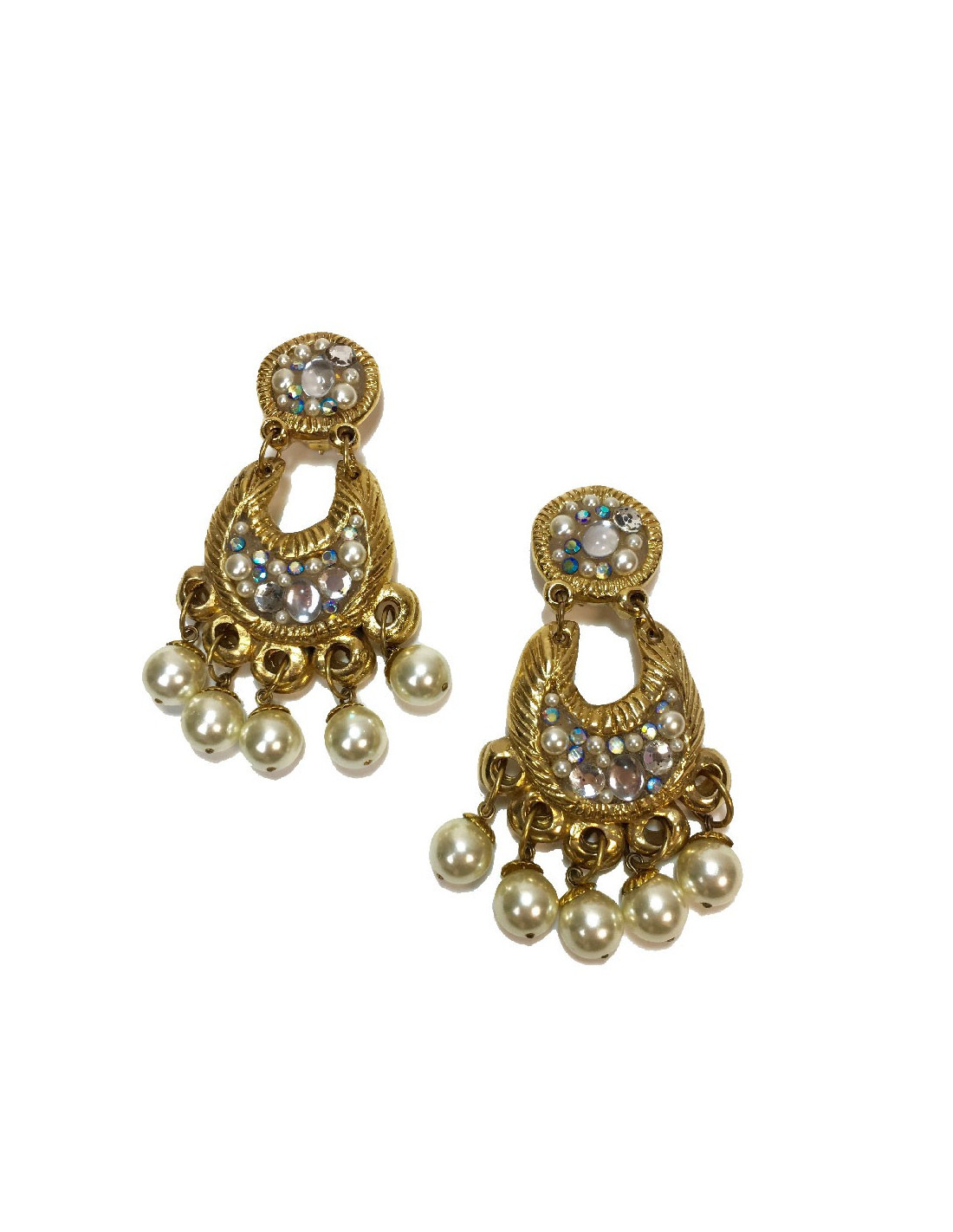 Boucles d'oreille clips Jacky de G en métal doré serti de strass et perles nacrées.