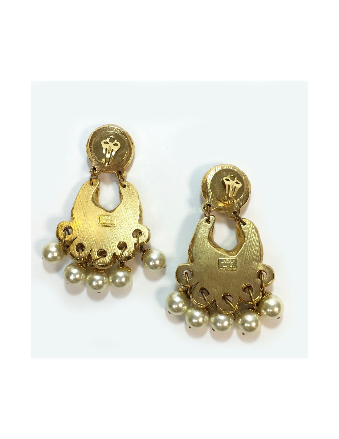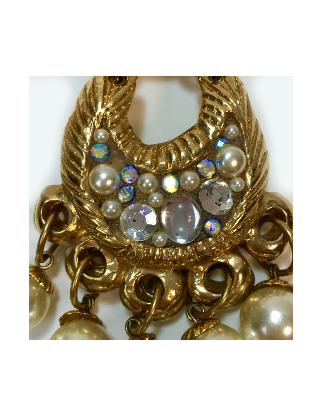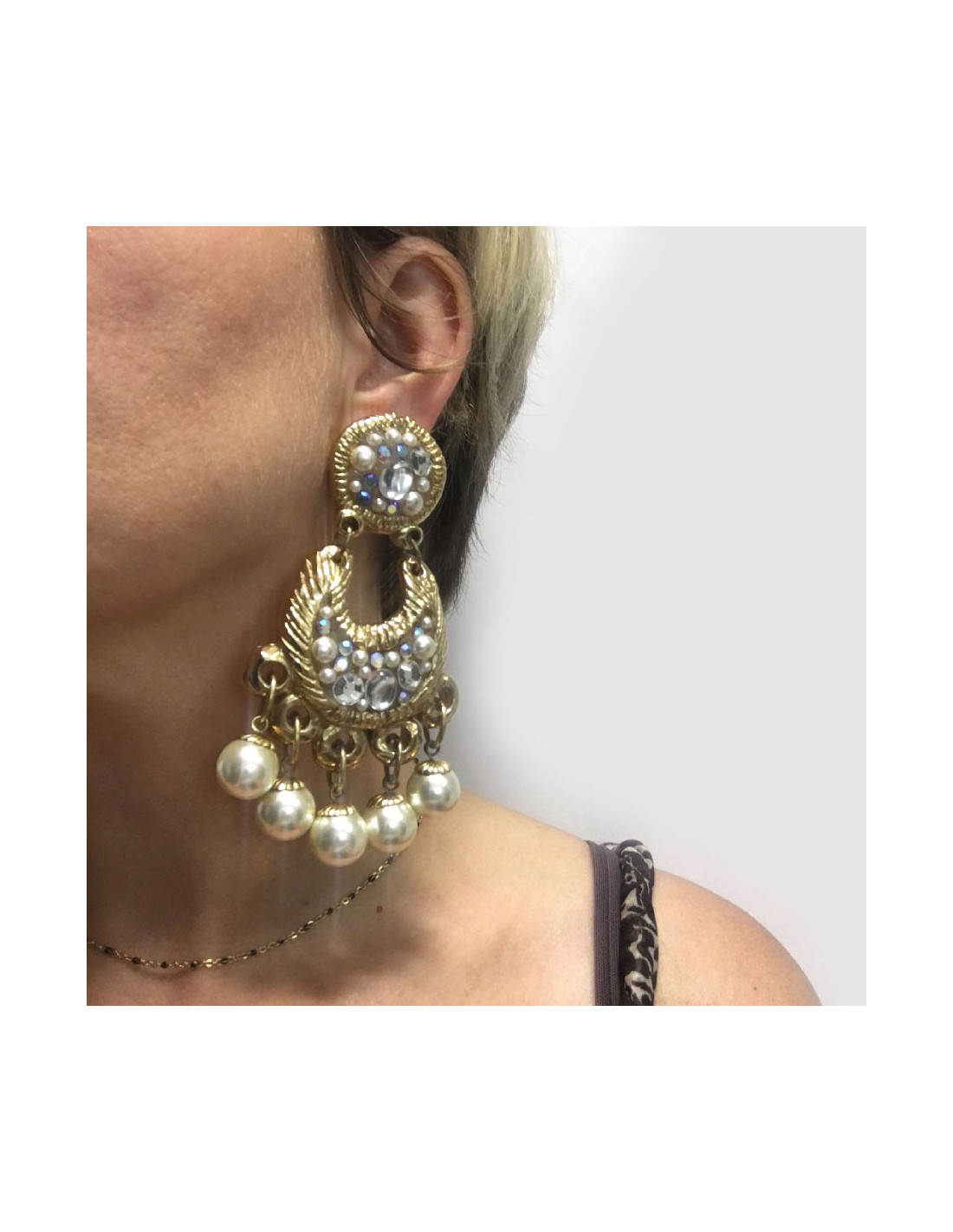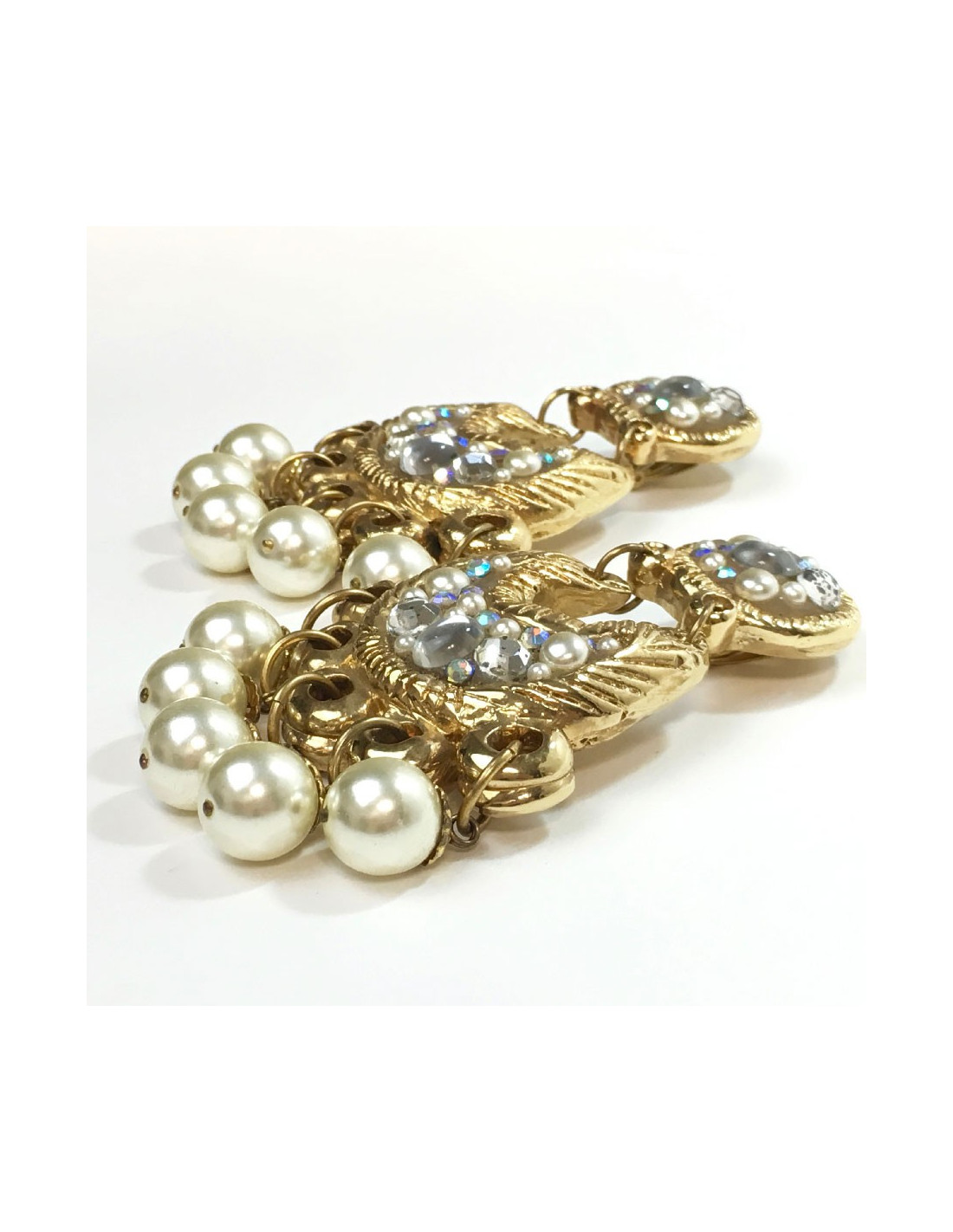 Clips imposants Jacky de G en métal doré, strass et perles nacrées