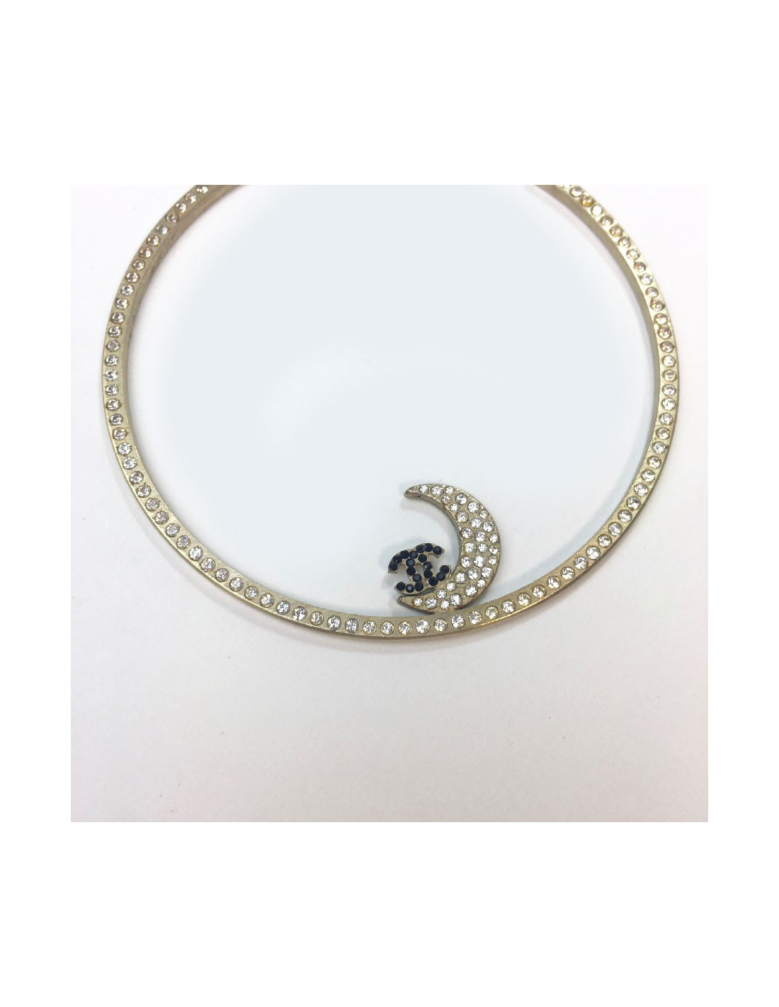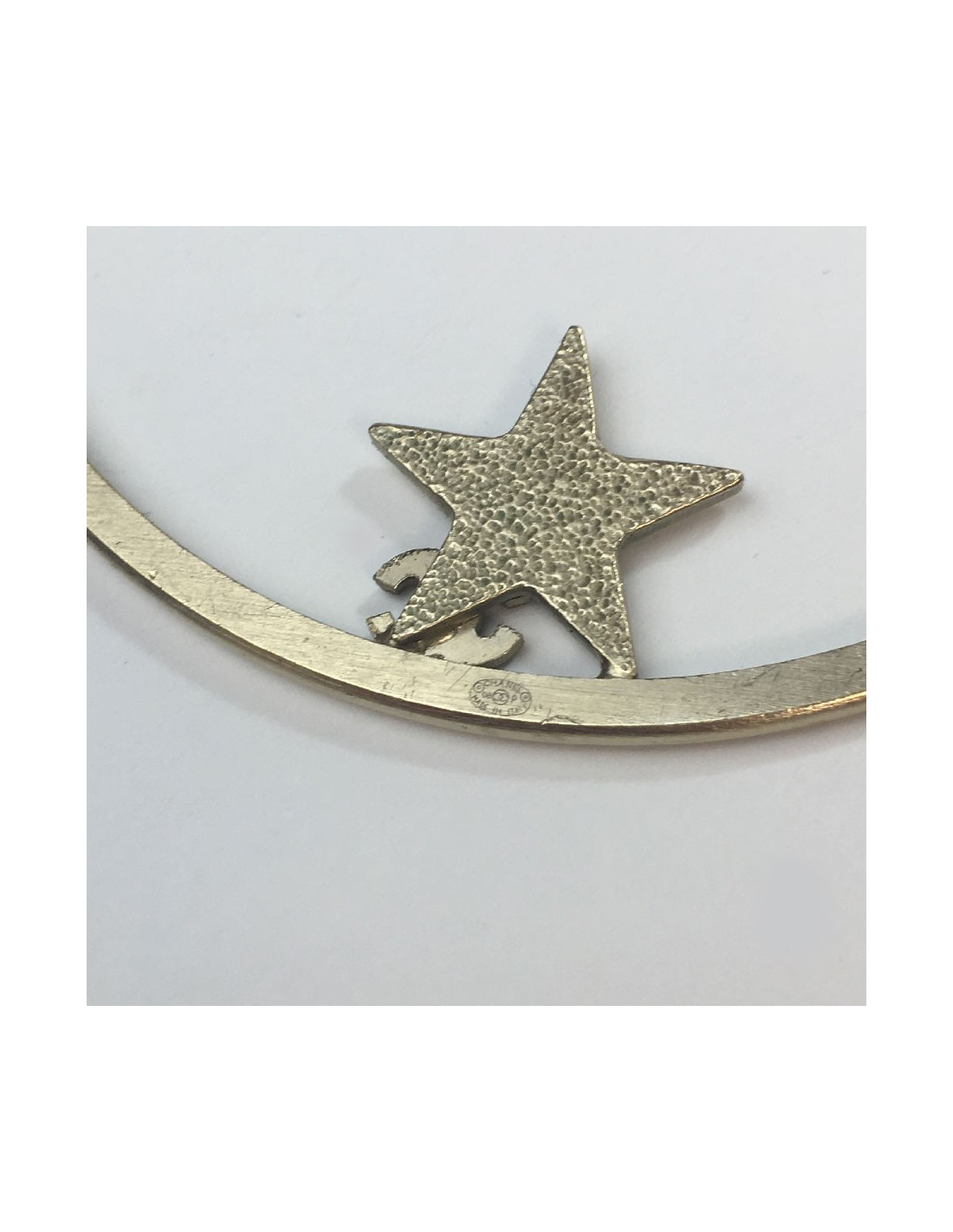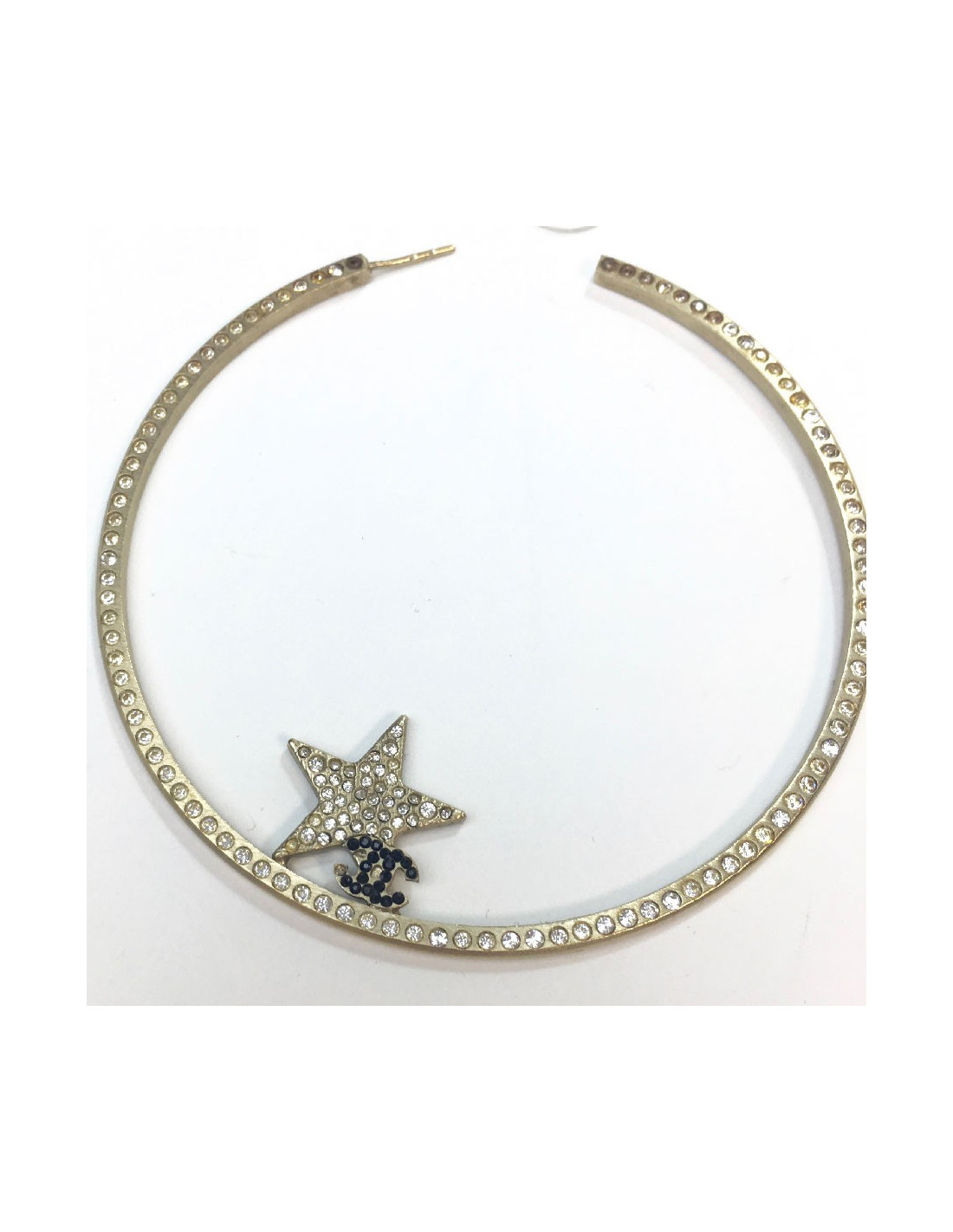 Créoles Chanel en métal or pâle et strass, lune et étoile entièrement serti de strass.