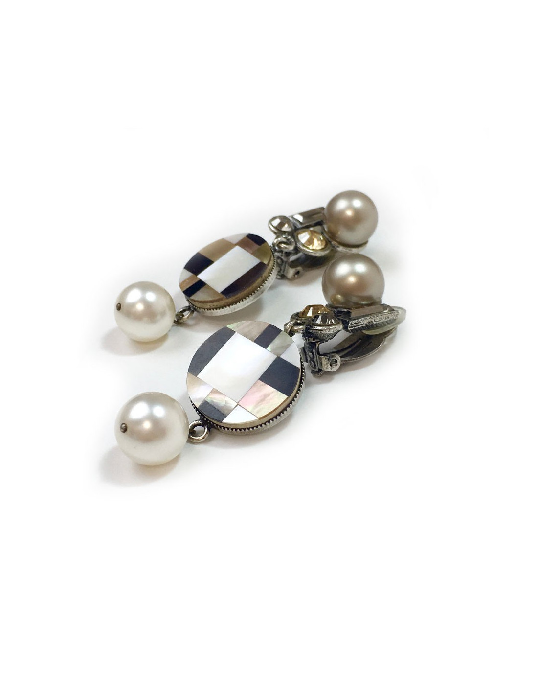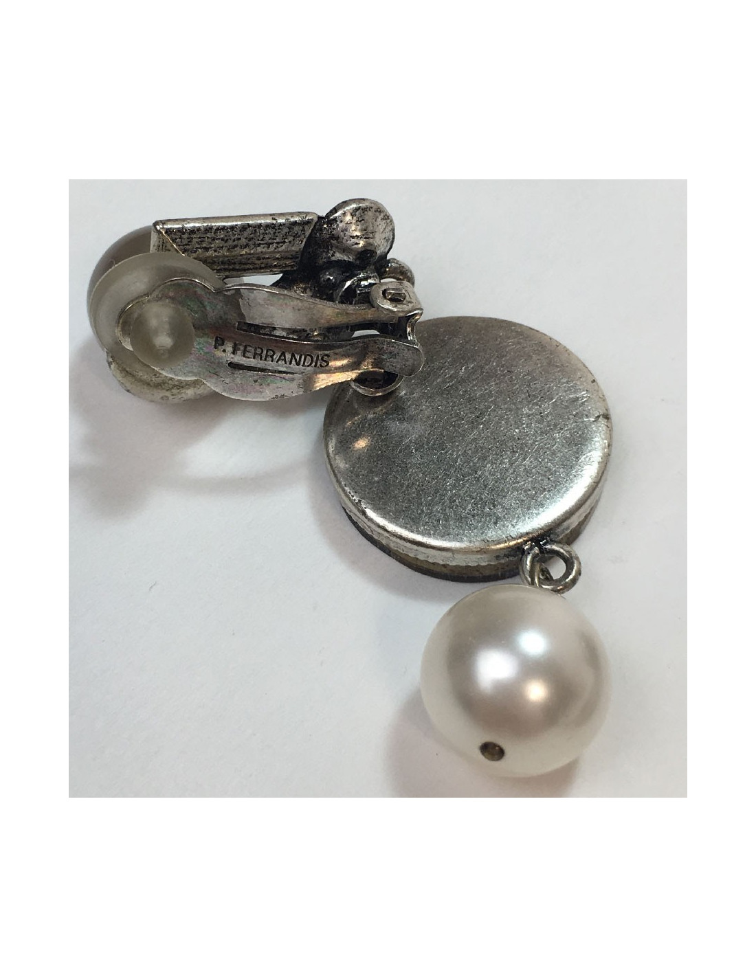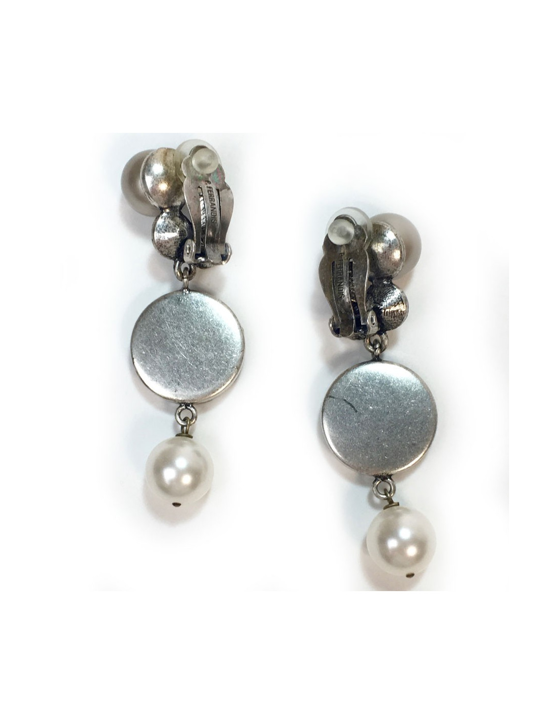 Clips pendants Philippe Ferrandis en métal argenté, perles nacrées et strass