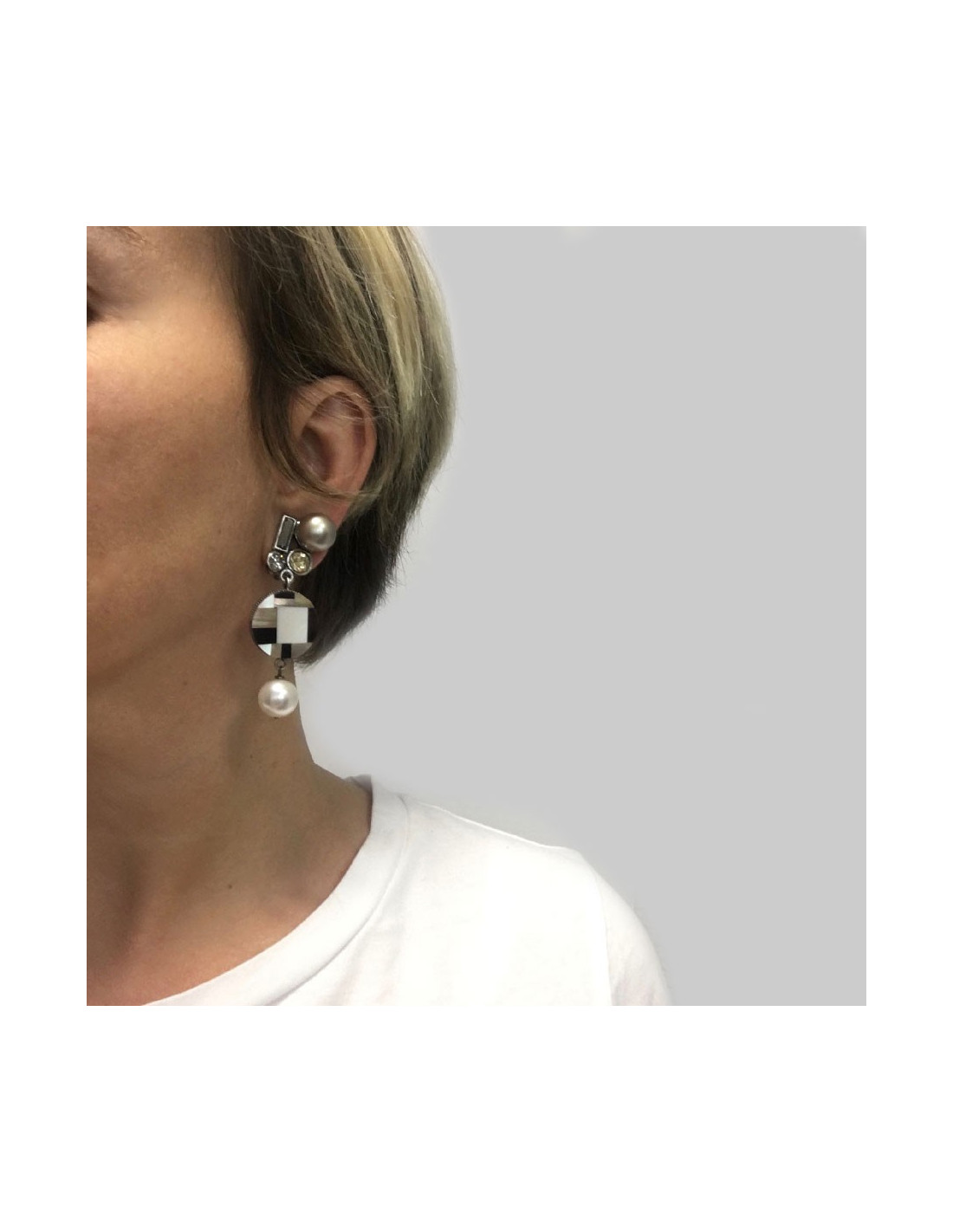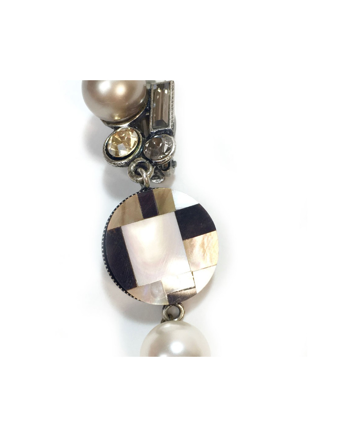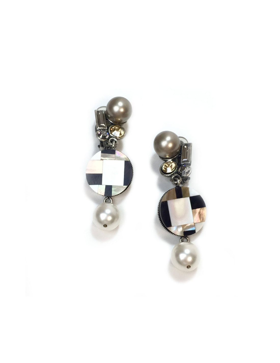 Clips pendants Philippe Ferrandis en métal argenté, perles nacrées et strass
