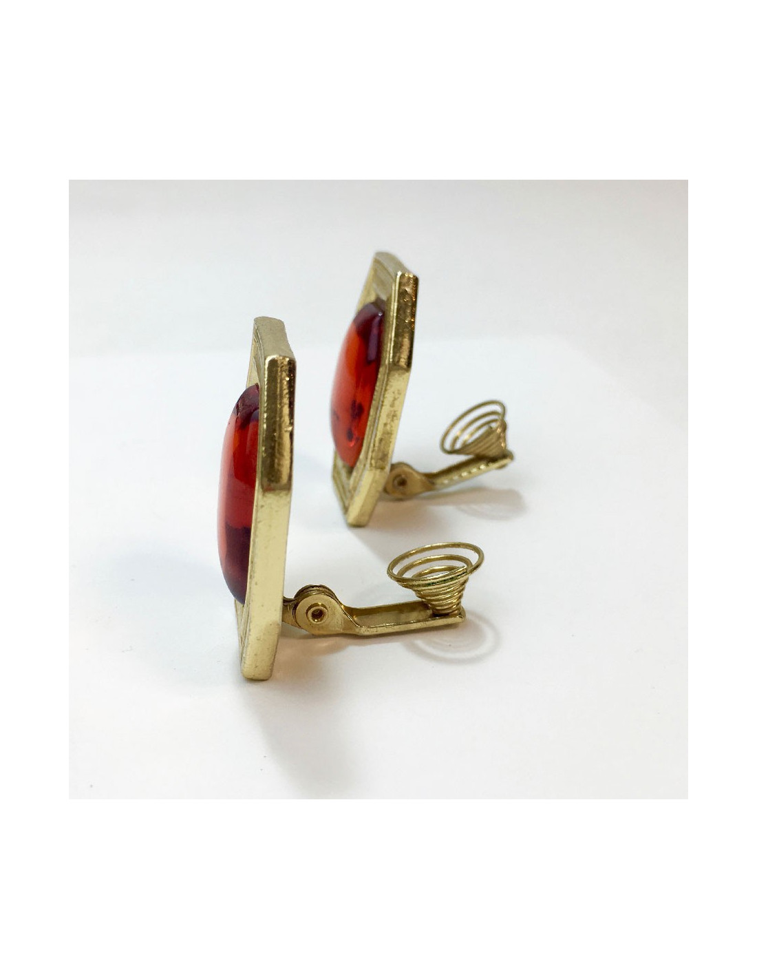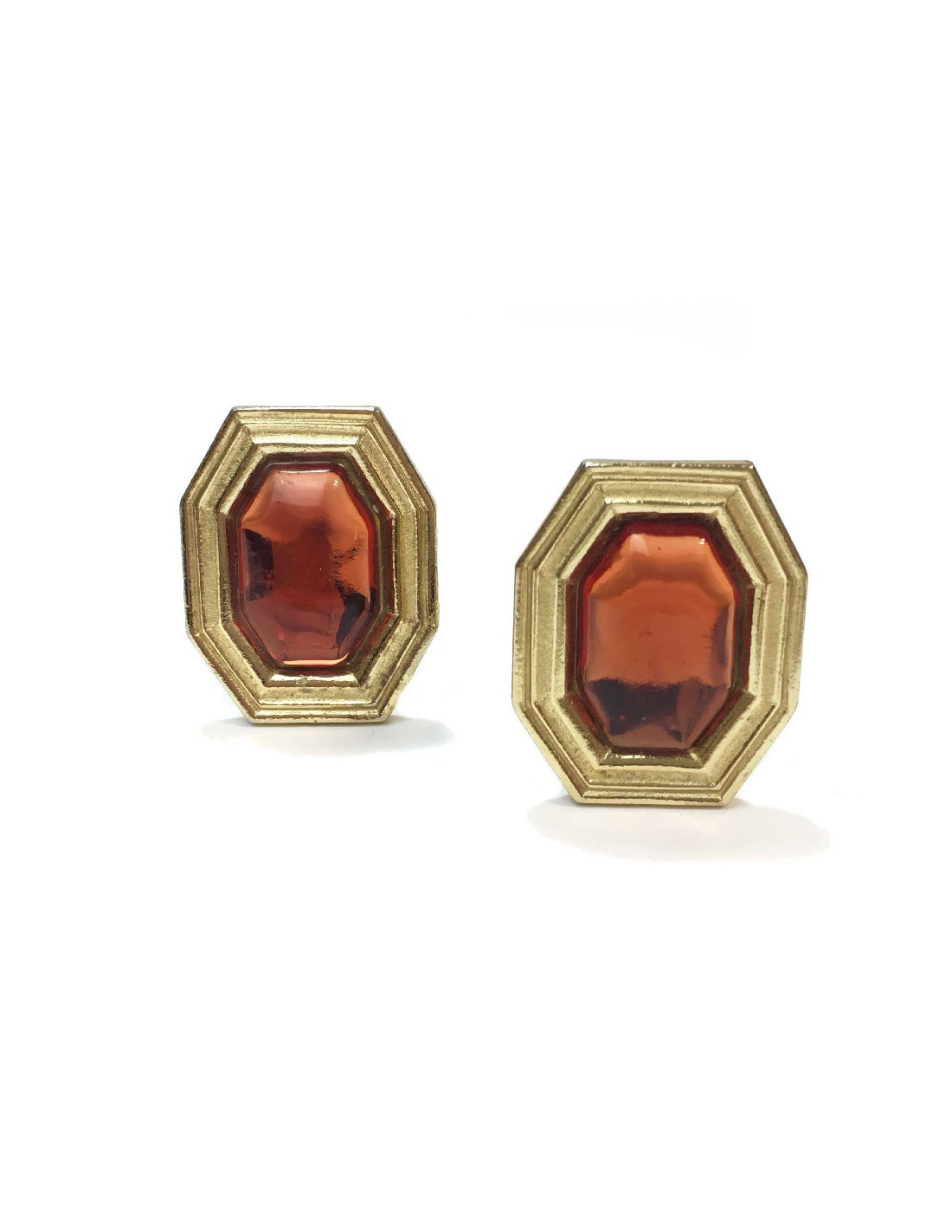 Boucles d'oreille clips YSL Yves Saint Laurent vintage en métal doré et résine orangée.