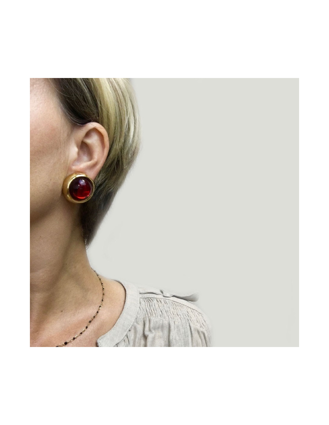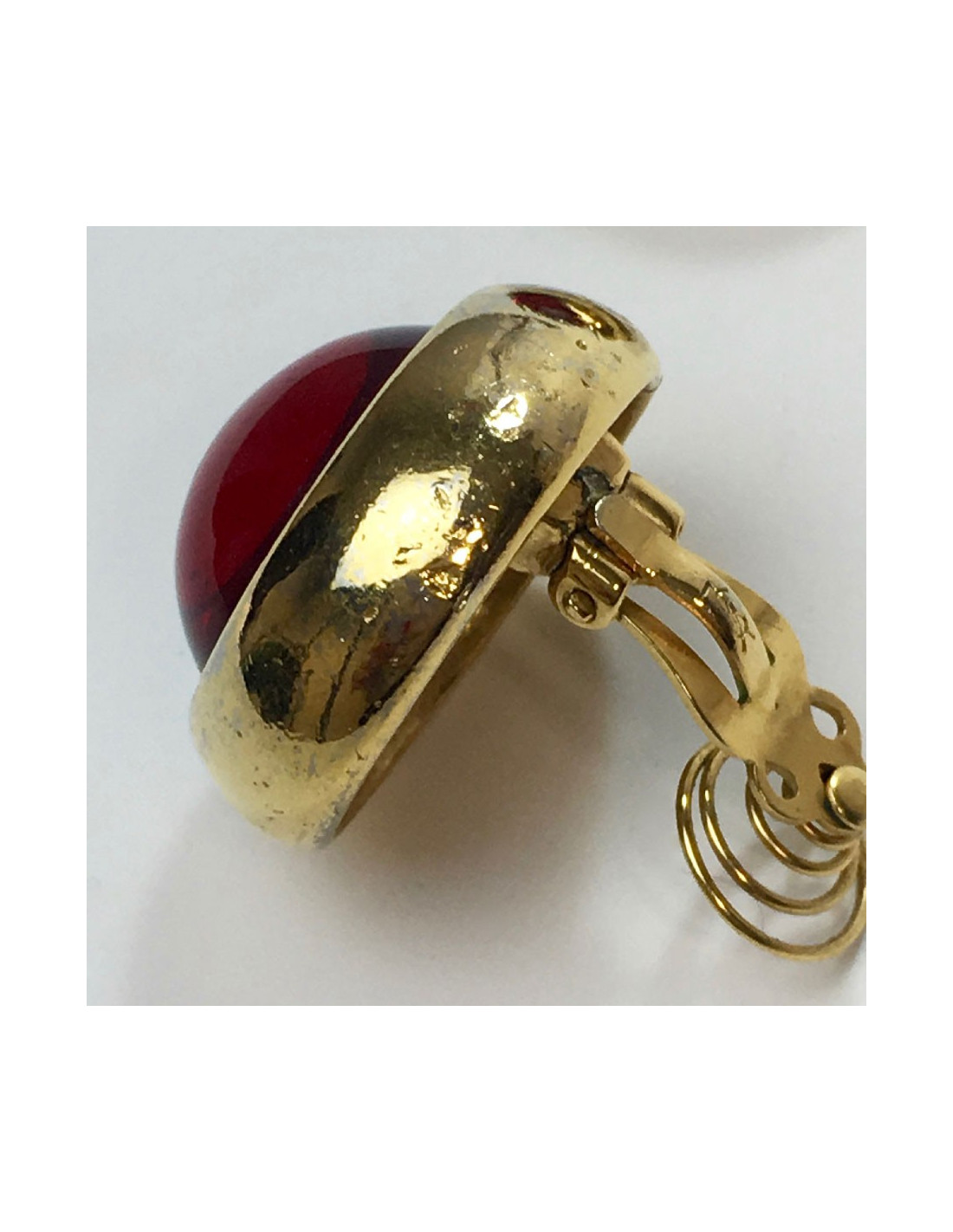 Boucles d'oreille clips YSL Yves Saint Laurent en métal doré et pierre fantaisie rouge au centre.