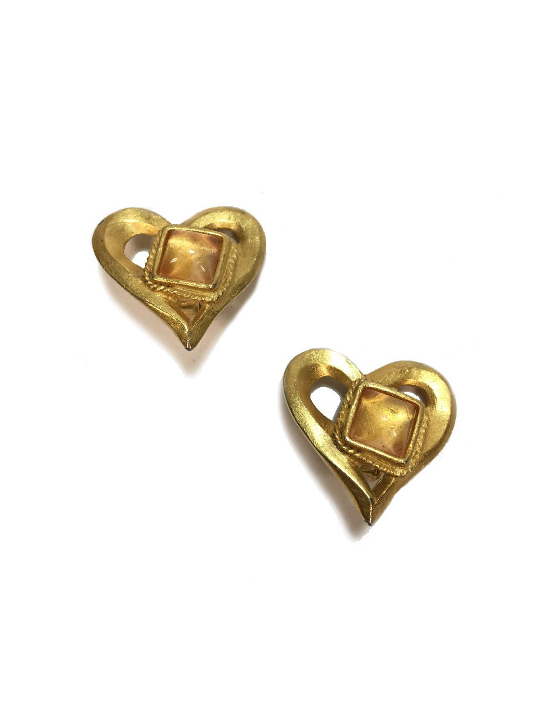 Boucles d'oreille clips Christian Lacroix vintage. Coeur en métal doré or mat serti d'une pierre fantaisie de couleur ambre.
