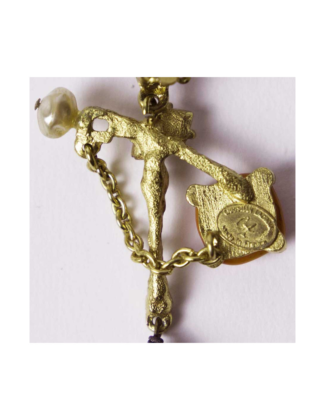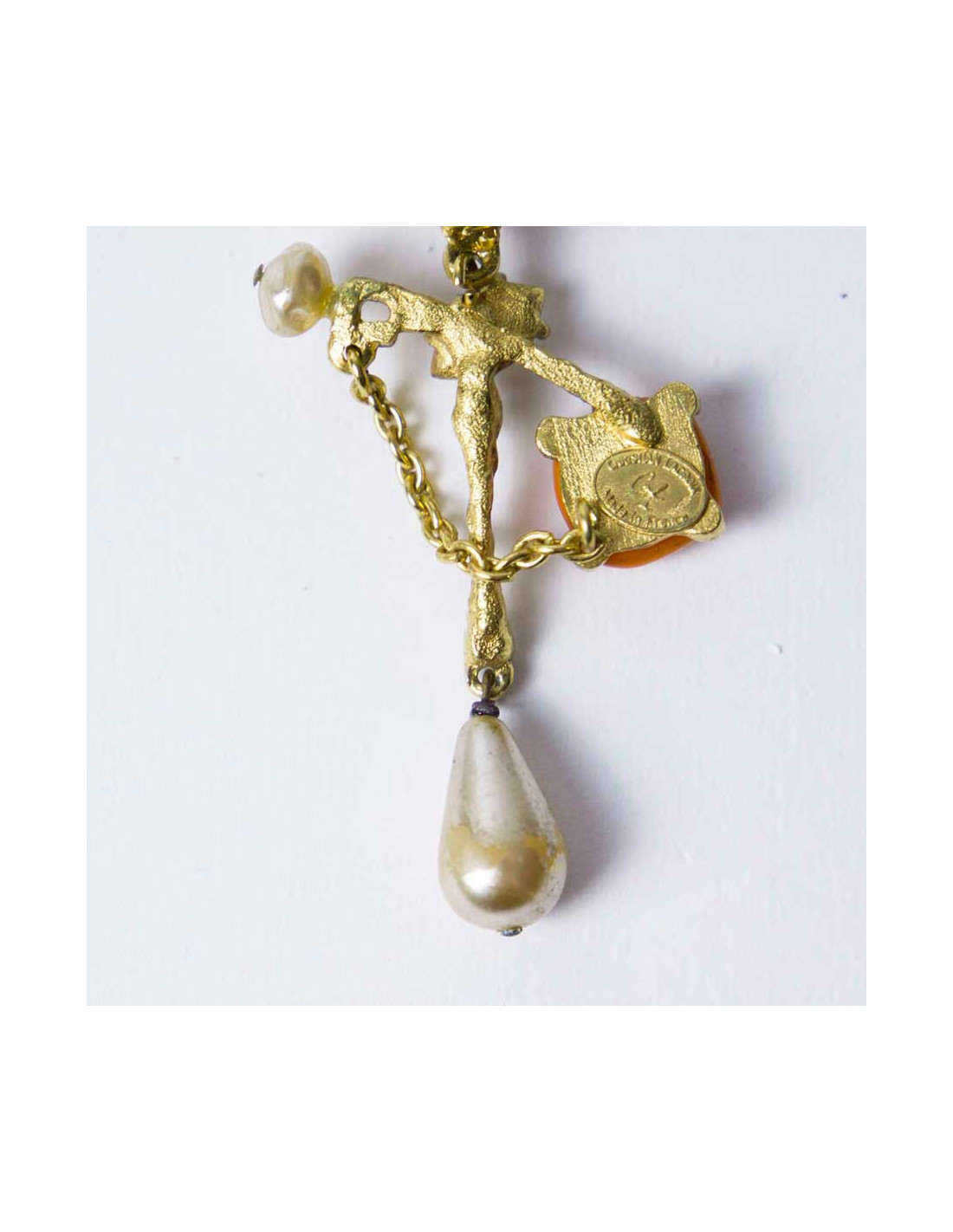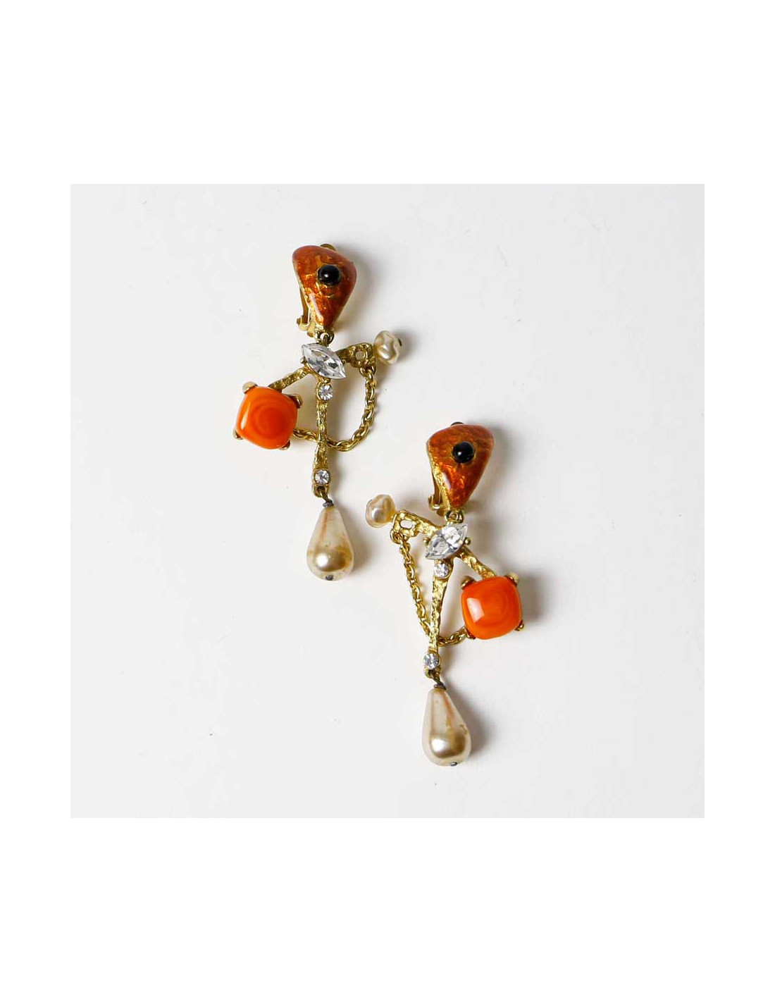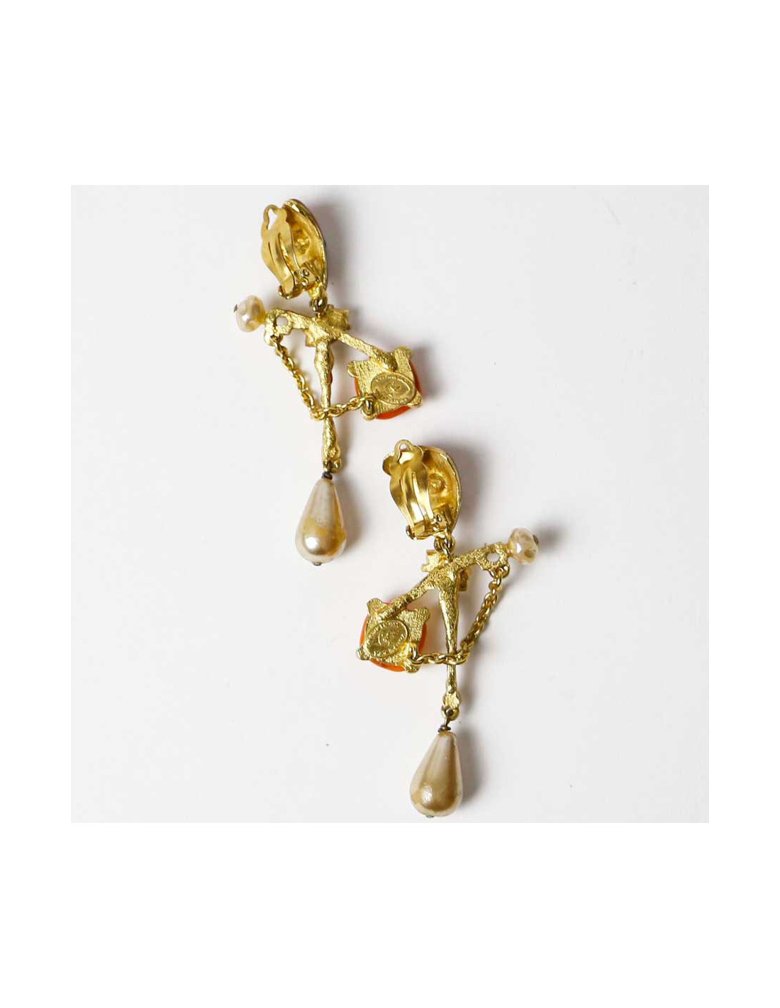 Couture, boucles d’oreilles clips Christian Lacroix en métal doré, strass, résine orange et perle nacrées en goutte (la nacre est partie sur plusieurs endroits des perles)