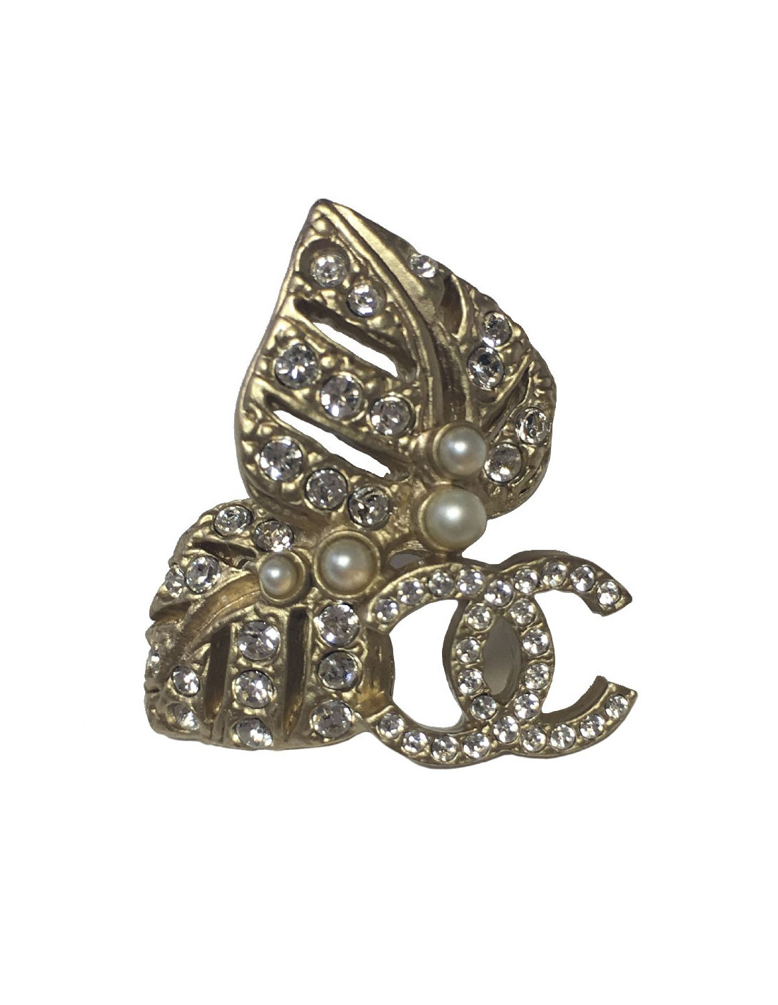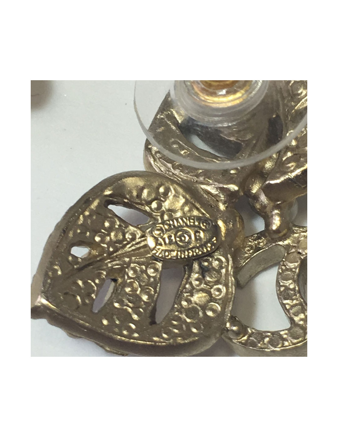 Boucles d'oreille clous Chanel feuilles et CC en métal doré mat serties de strass blancs et de petites perles nacrées.