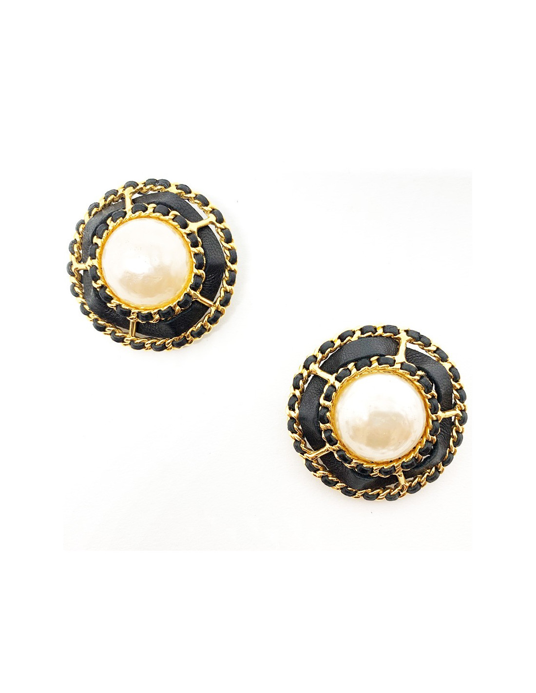 Ultra vintage : Bijoux collector. Les boucles d'oreille sont de la Maison CHANEL. Elles sont vintage et représentent l'essence même de la marque. Une boule nacrée encerclée du traditionnel assemblage chaîne dorée et cuir noir. Pour un look COCO CHANEL intemporel et en toutes occasions.
