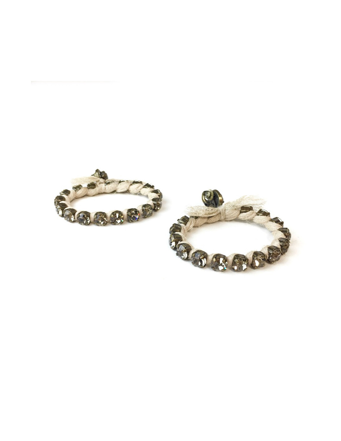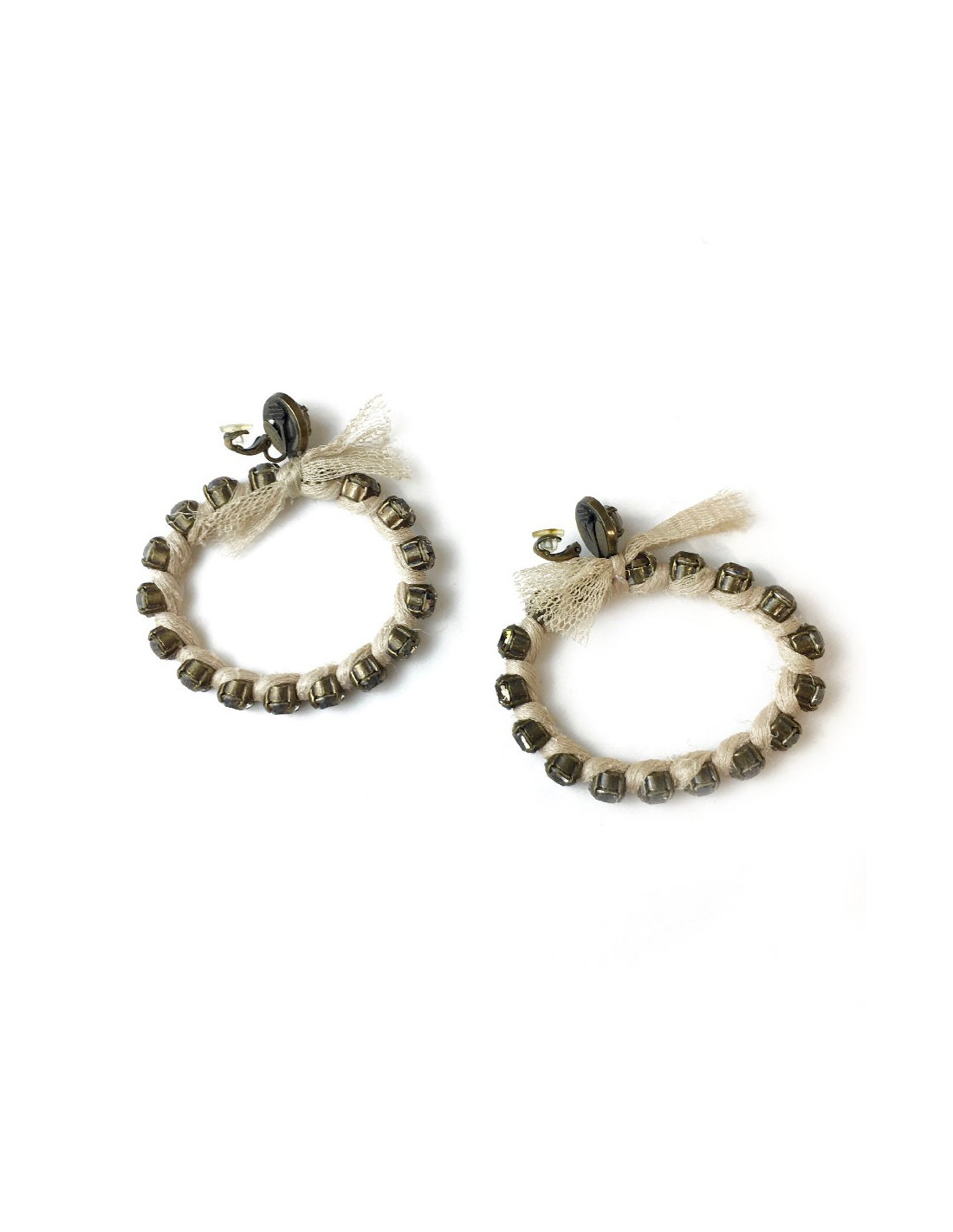 Boucles d'oreille clips créoles Lanvin par Alber Elbaz en métal cuivré surmonté de strass, enroulé d'un ruban en coton ajouré beige.