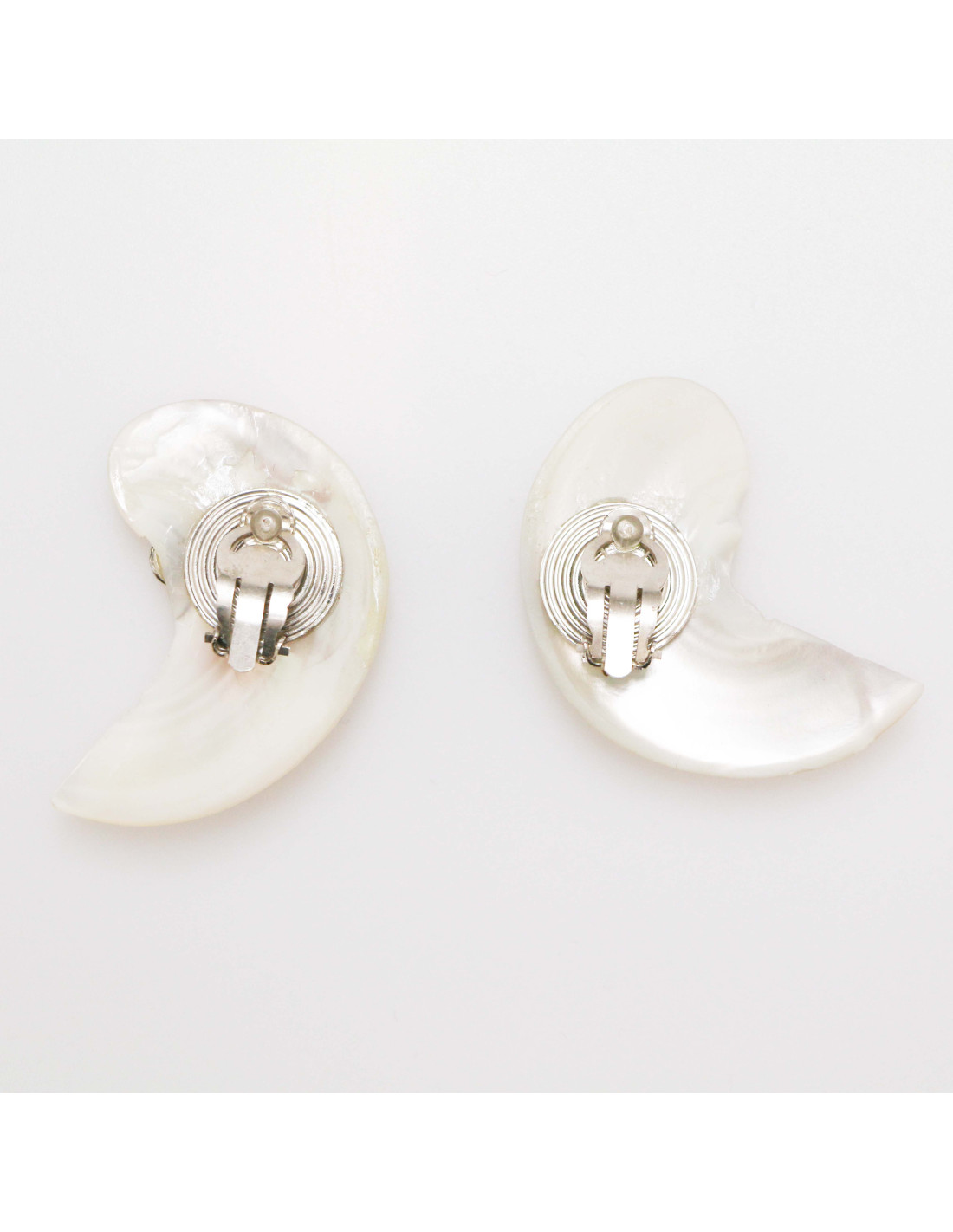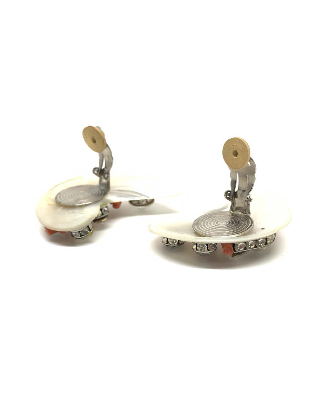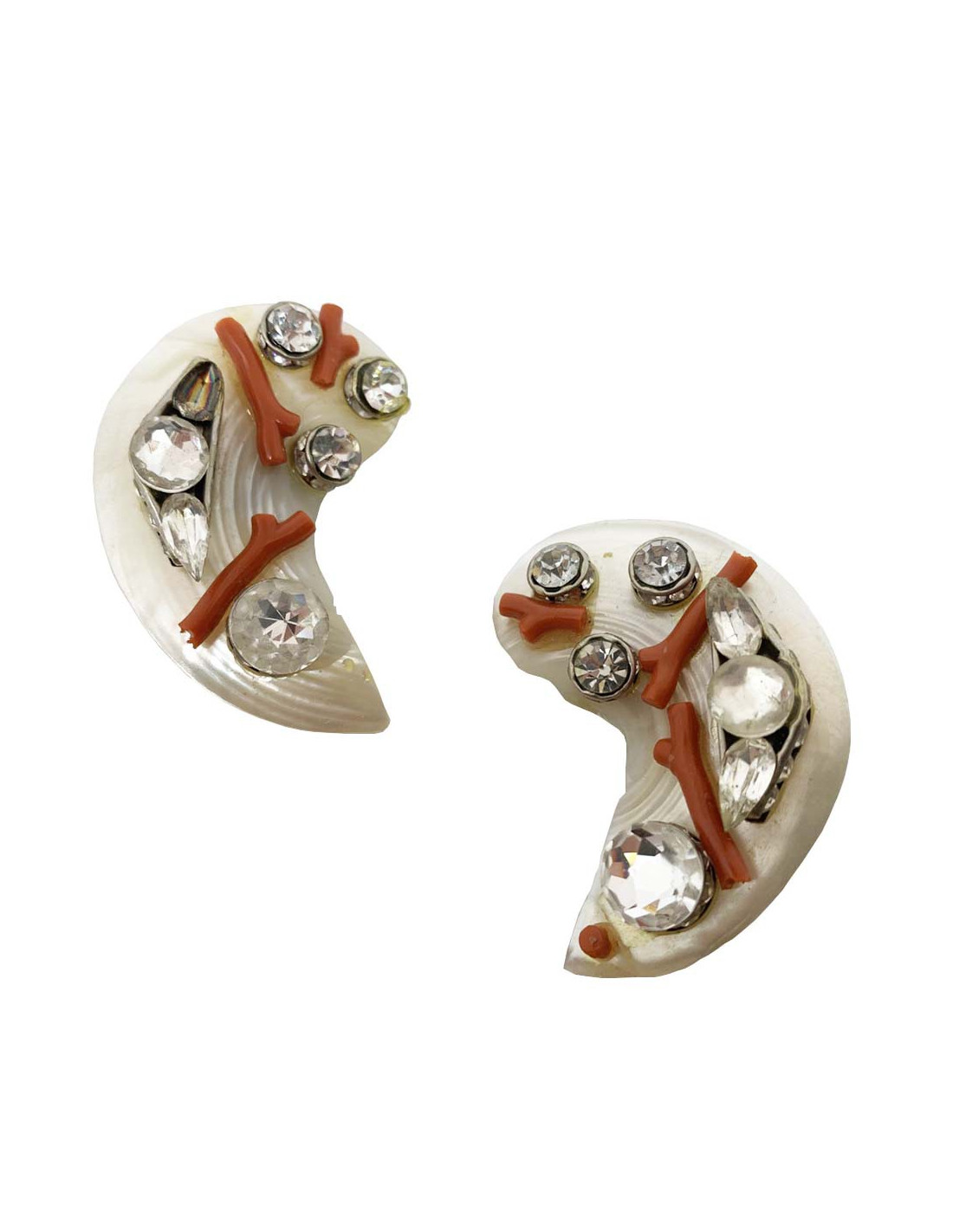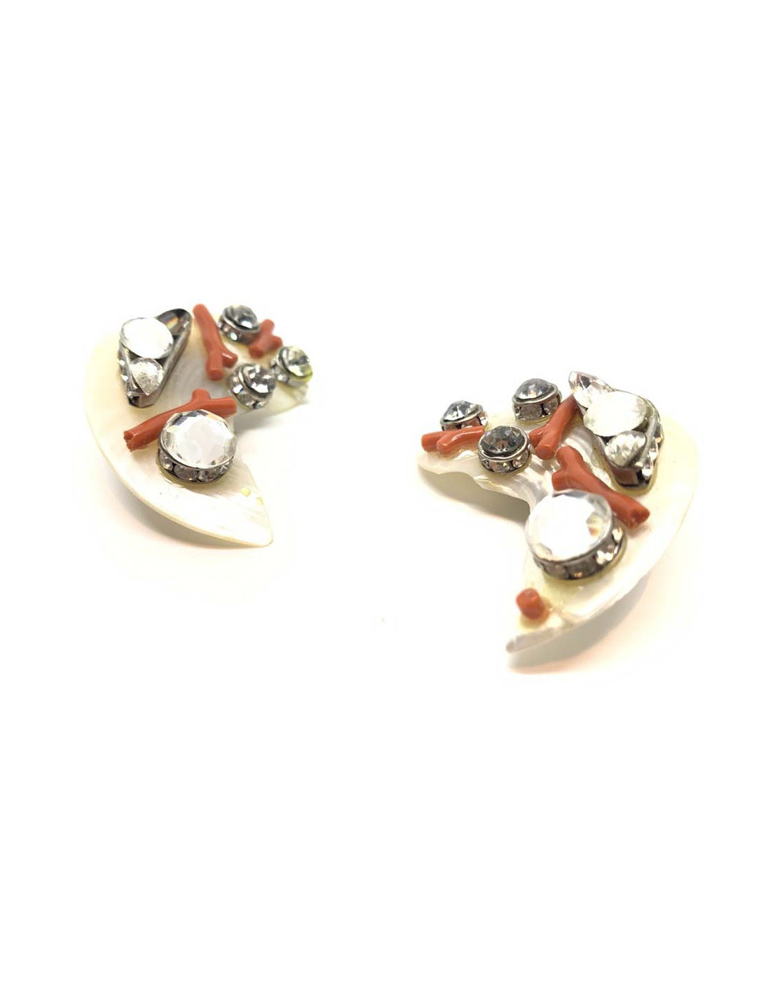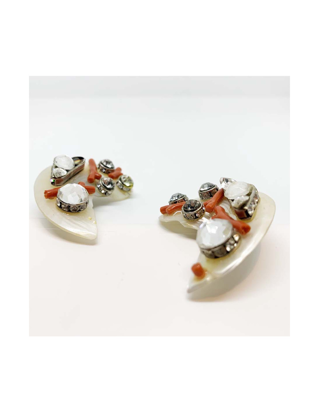Très originales. Les boucles d'oreille ne sont pas signées. Elles sont en forme de demi coquillage et faites de nacre. Chacune est composée de strass de différentes tailles, ainsi que de motifs de branches de corail. Idéales pour vos tenues de plage!