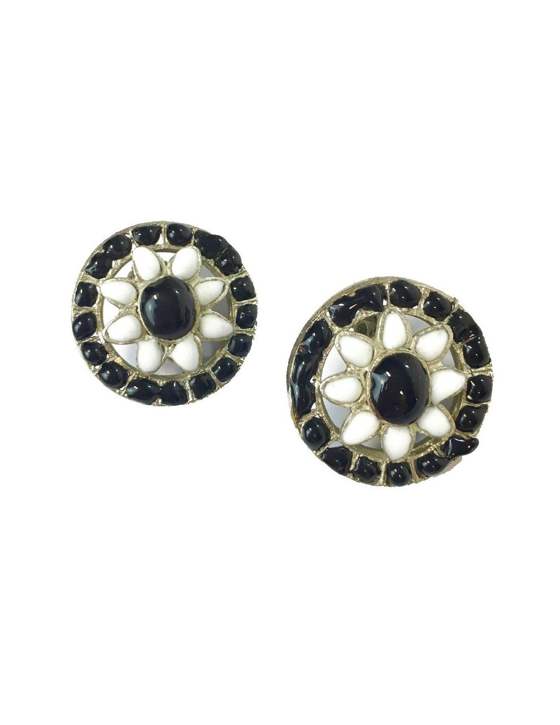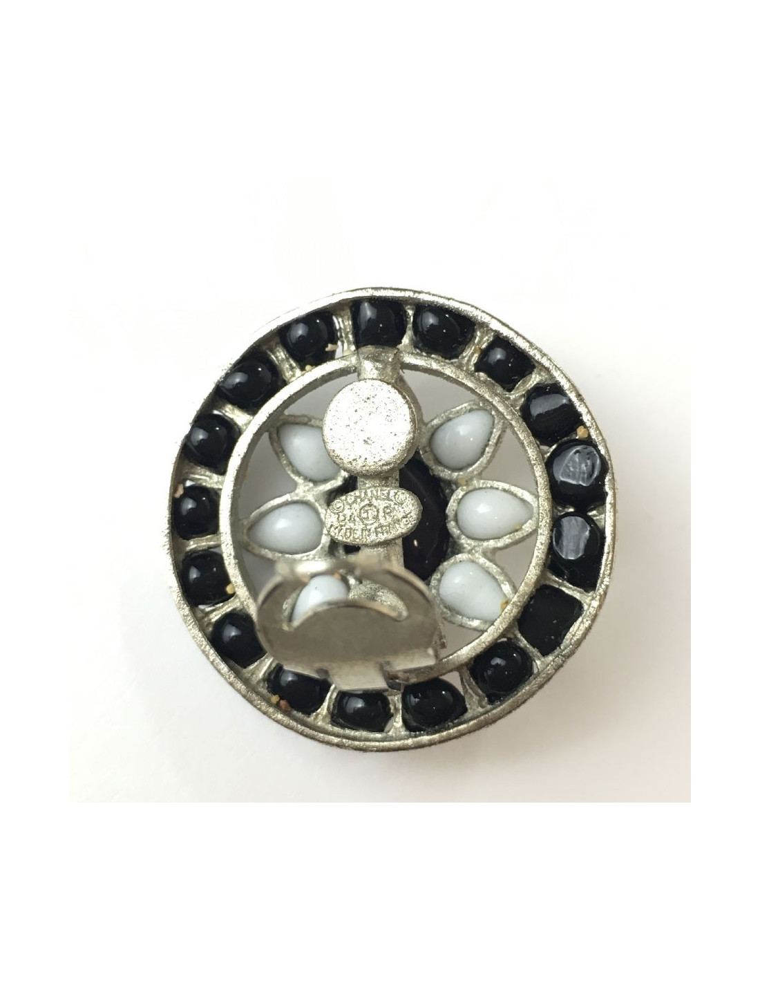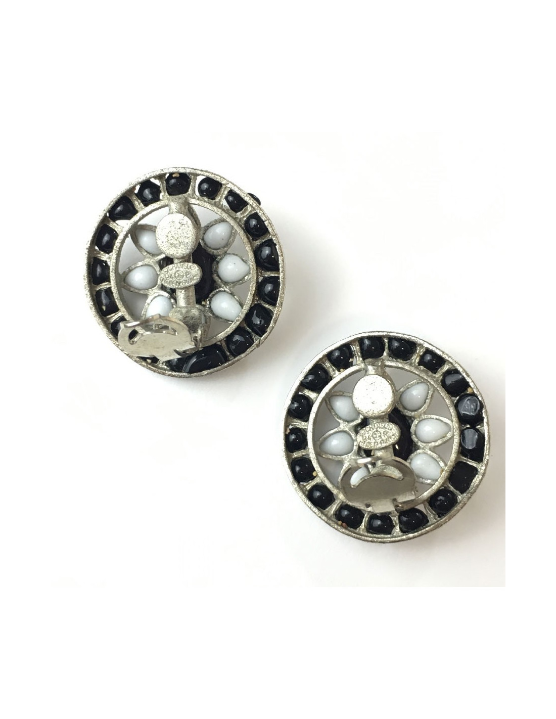 Boucles d'oreille clips Chanel vintage en métal argenté et pâte de verre noire et blanche.