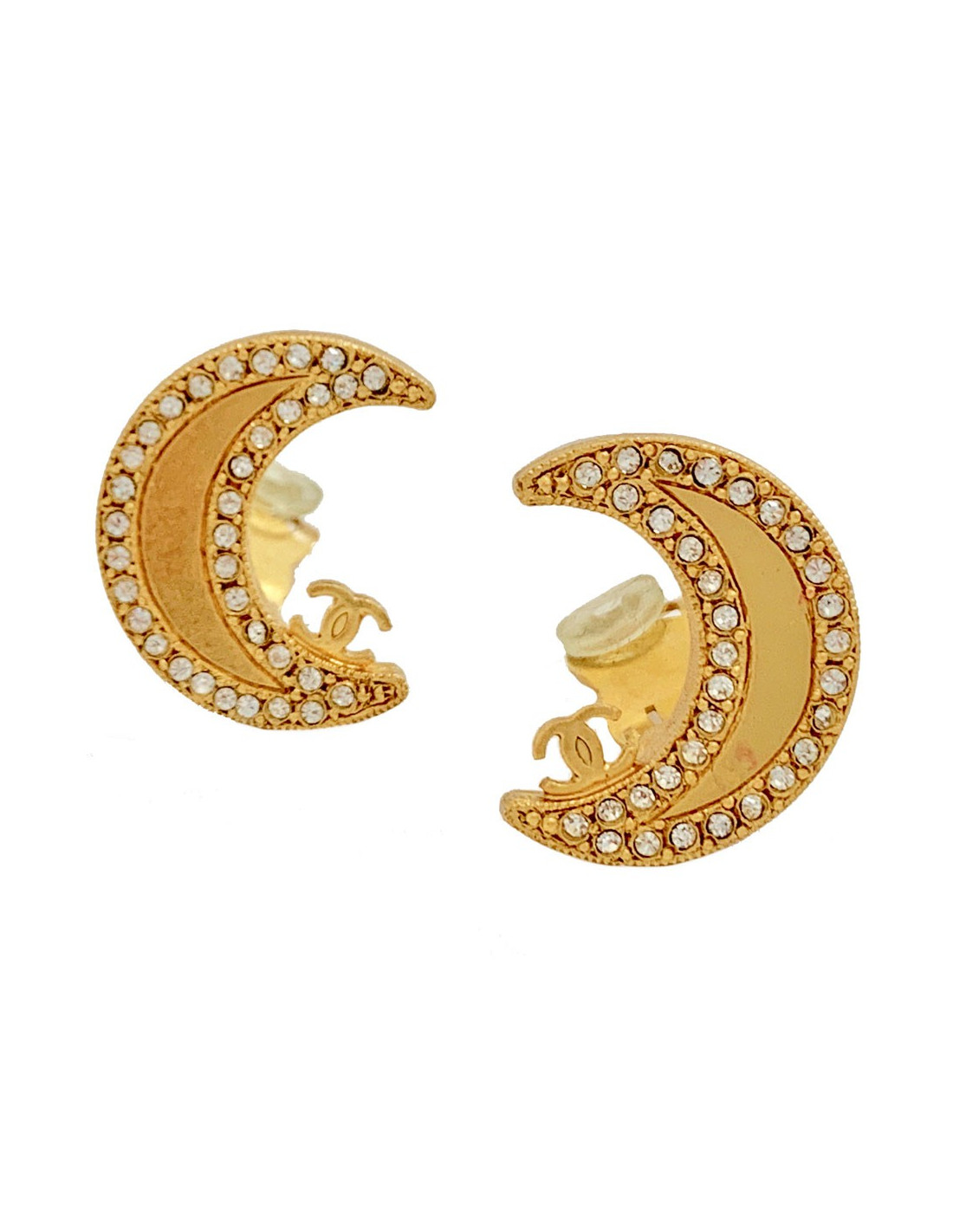Belle paire de clips CHANEL en forme de croissant de lune en métal doré or mat. La paire est sertir de strass sur son ensemble. Un petit CC se situe sur le bas du croissant.