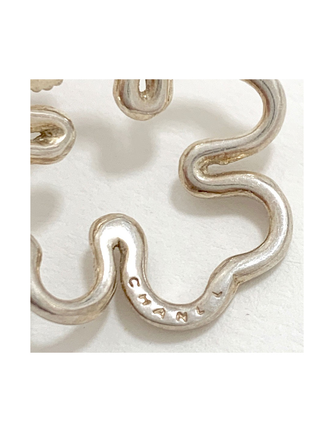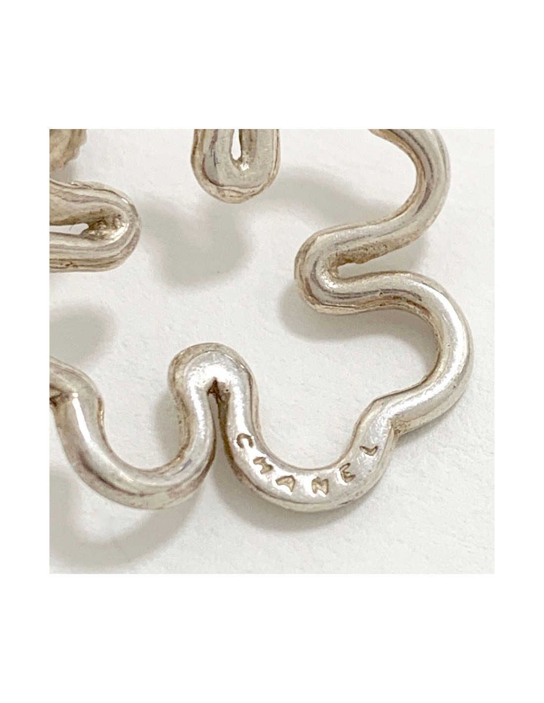 Jolie paire de boucle d'oreille CHANEL argent. En forme de trèfles, elles sont fines et légères à porter. Le poinçon Argent se situe sur le fermoir. La marque CHANEL est gravée à la main sur chaque boucle sur le devant (voir photo).