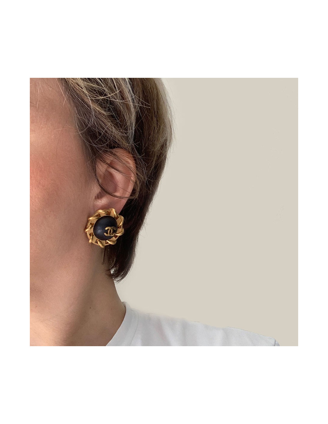 Avis aux collectionneurs et fashionistas! Superbes boucles d'oreille clips CHANEL. Clips ronds en métal doré et cuir noir au centre. Un CC doré est apposé sur le cuir. Ils sont très légers à porter et tiennent très bien sur le lobe de l'oreille.