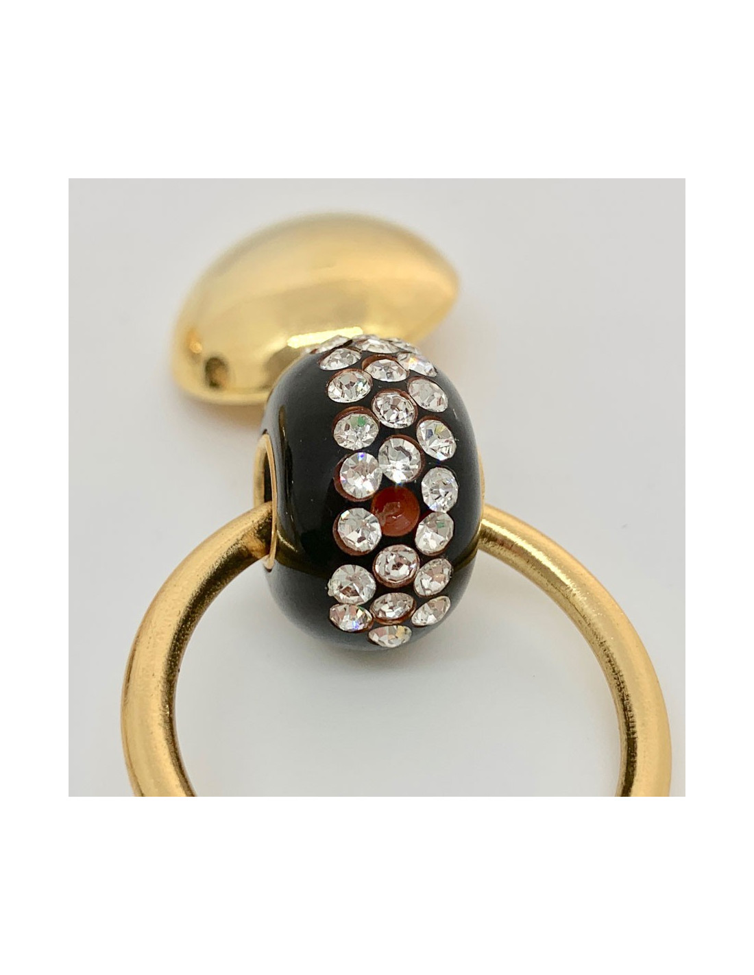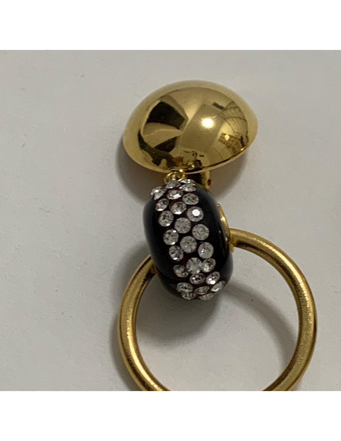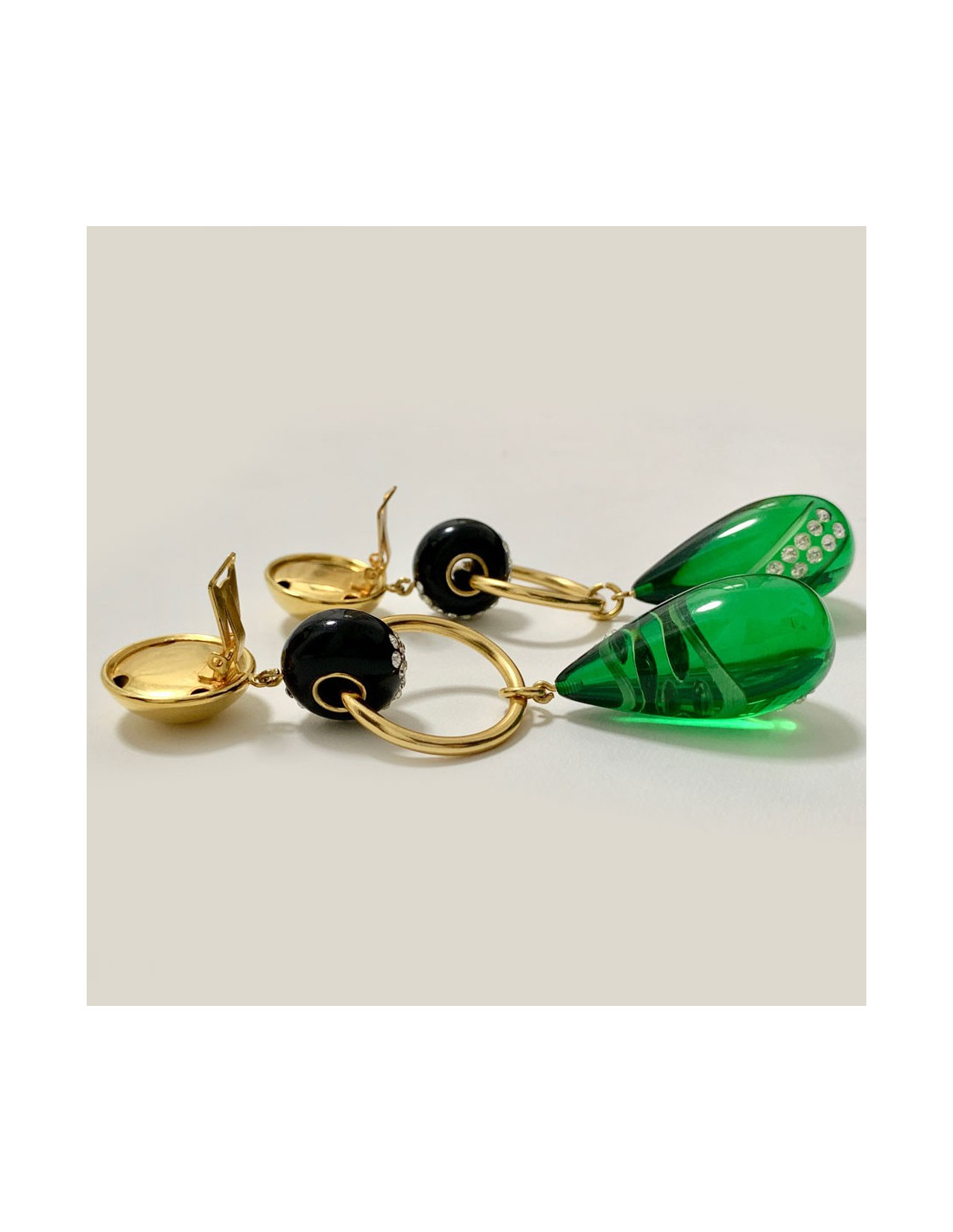 Belle paire de boucles d'oreille clips pendants en métal doré, perle goutte en résine verte sertie de strass, boule en résine noire sertie également de strass. Ces boucles d'oreille sont non signées.