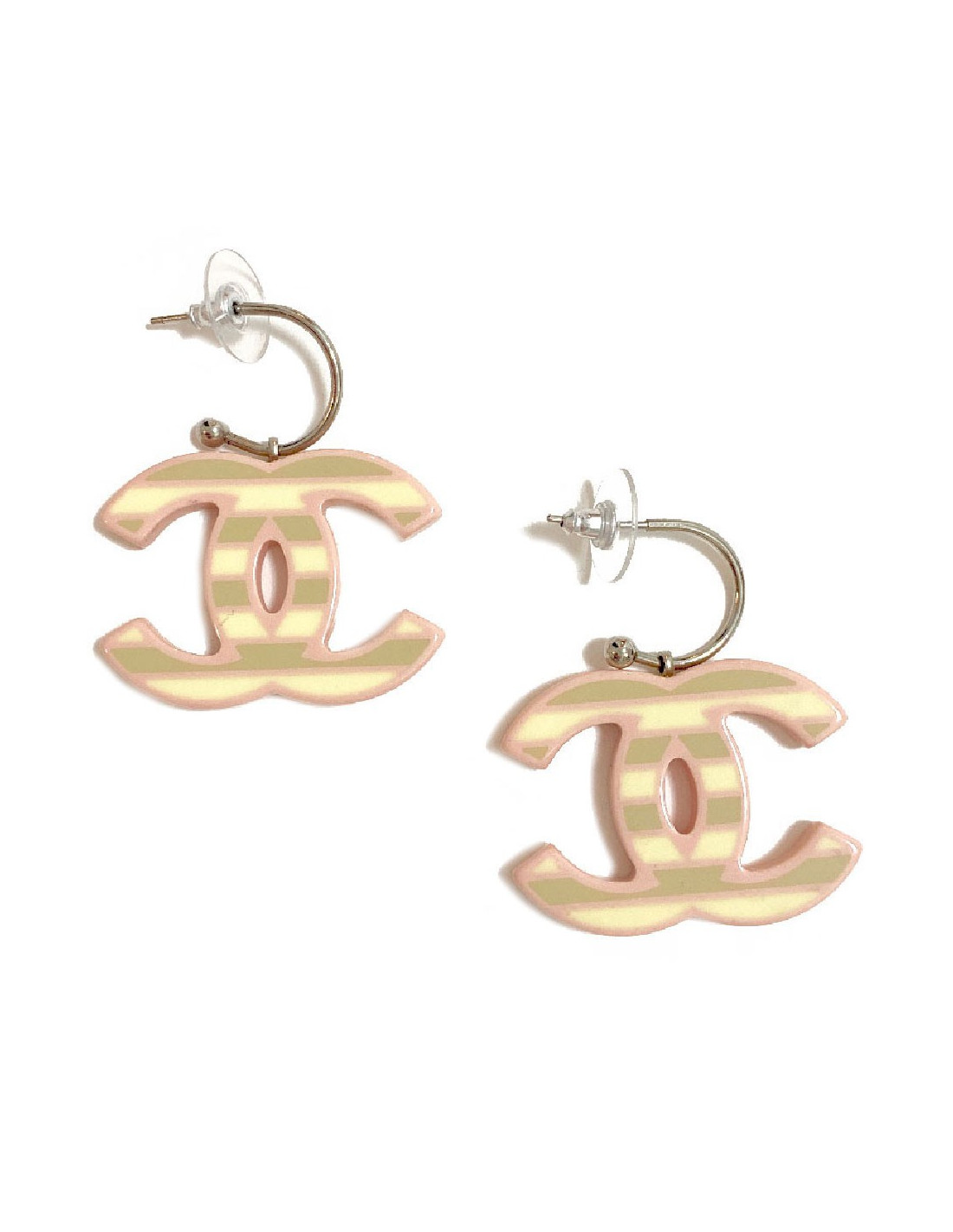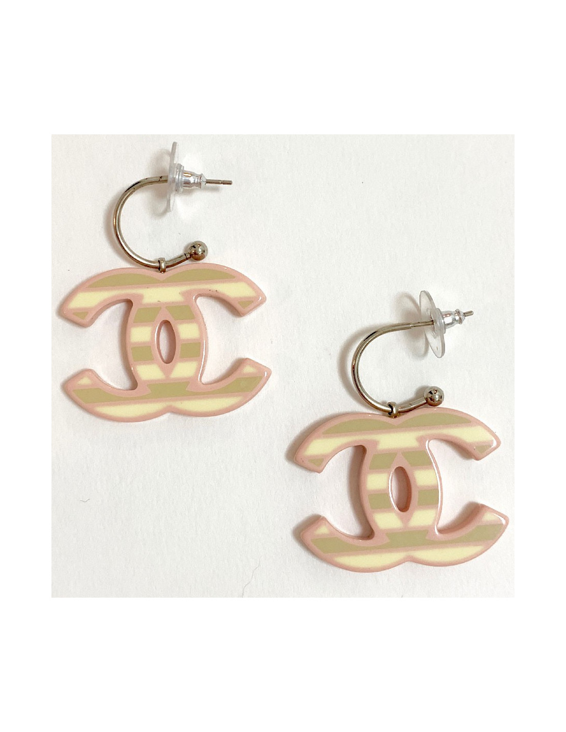 Jolie paire de boucles d'oreille clous CC de la maison Chanel, pendant en résine rose rayé de beige clair et de beige foncé.