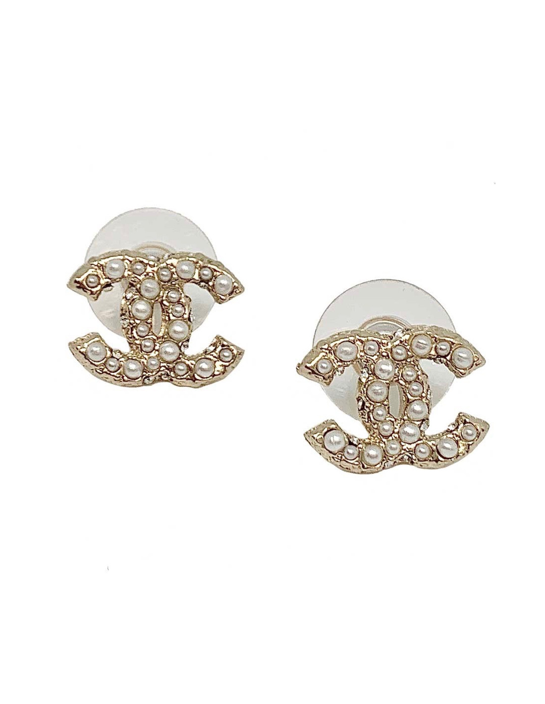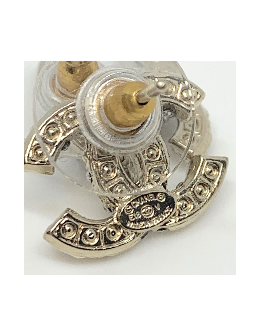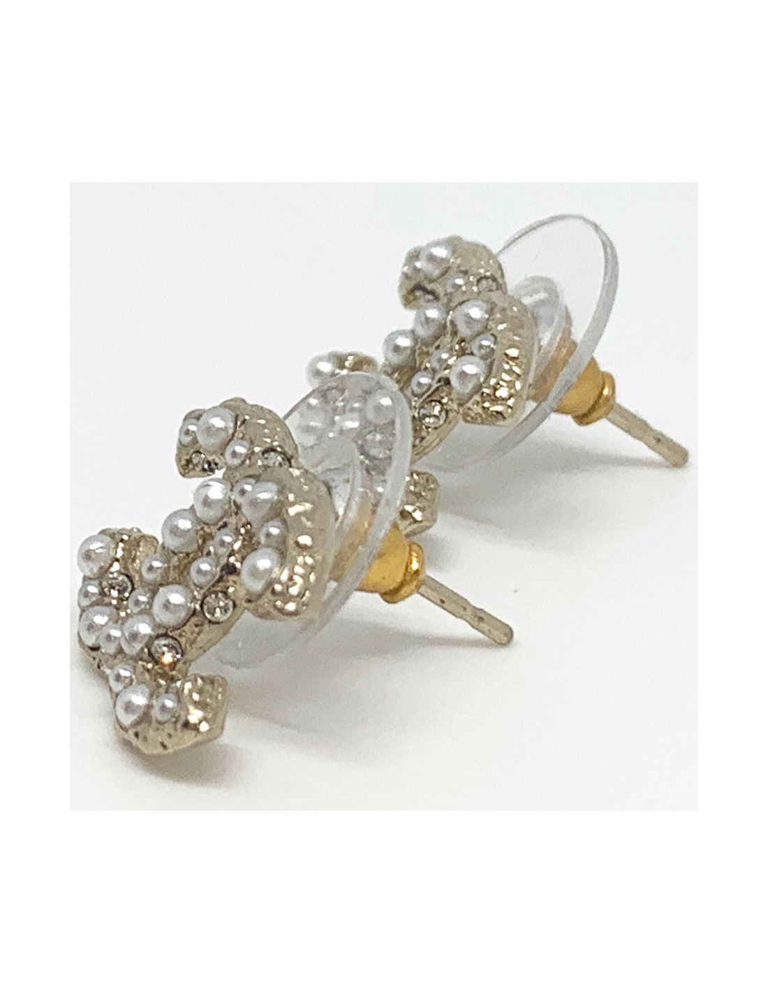 Elégants et raffinés! Clous de la maison CHANEL, CC, en métal doré or pâle, sertis de strass et perles nacrées.