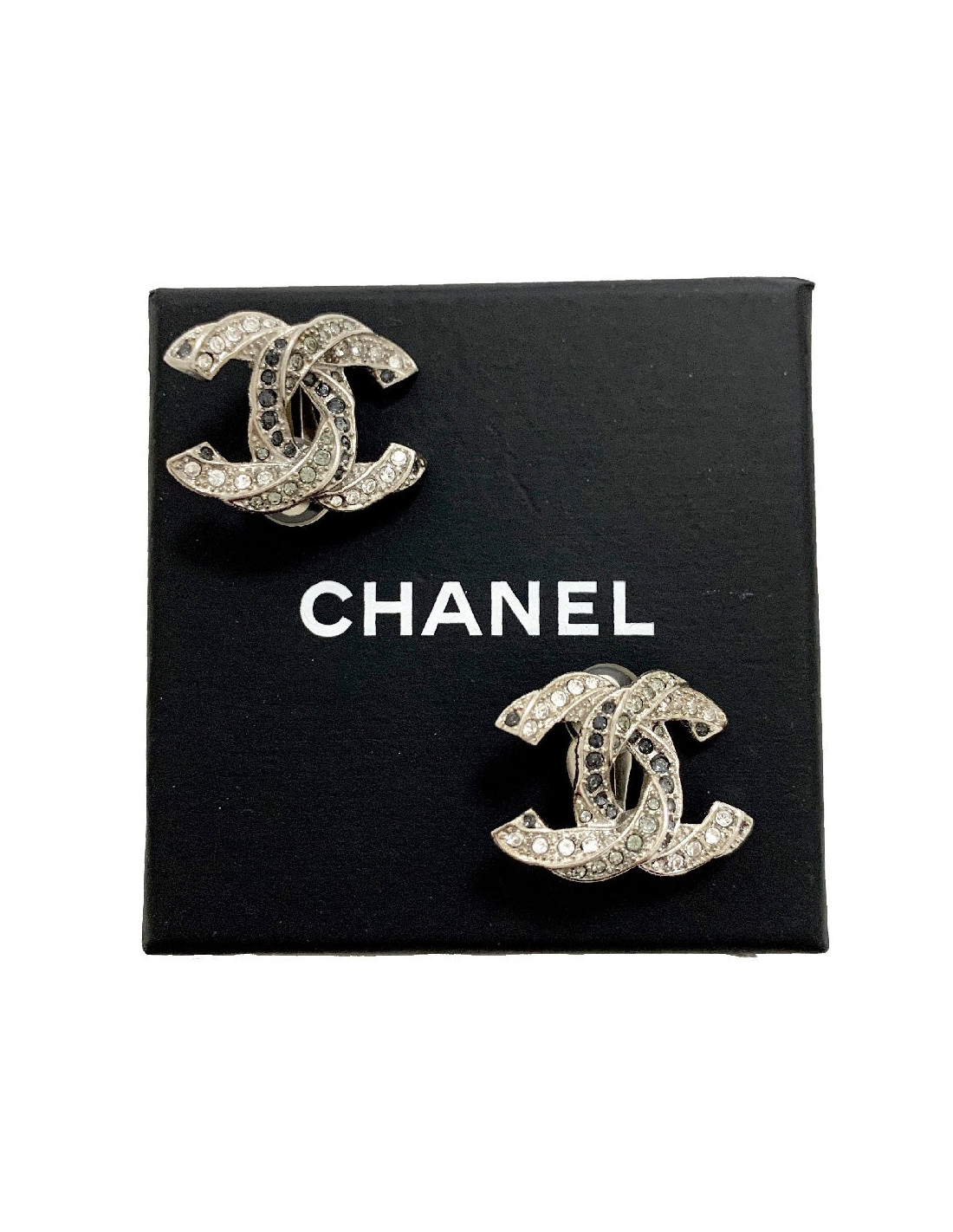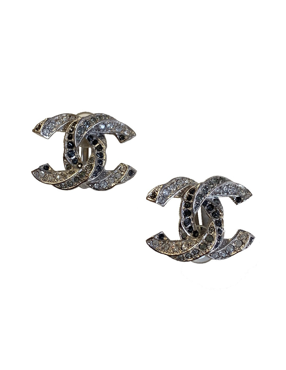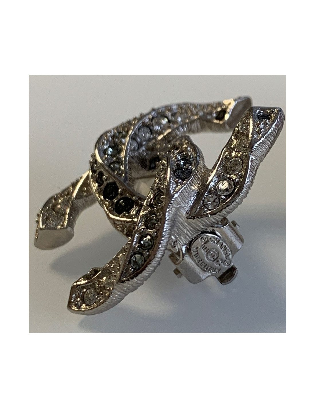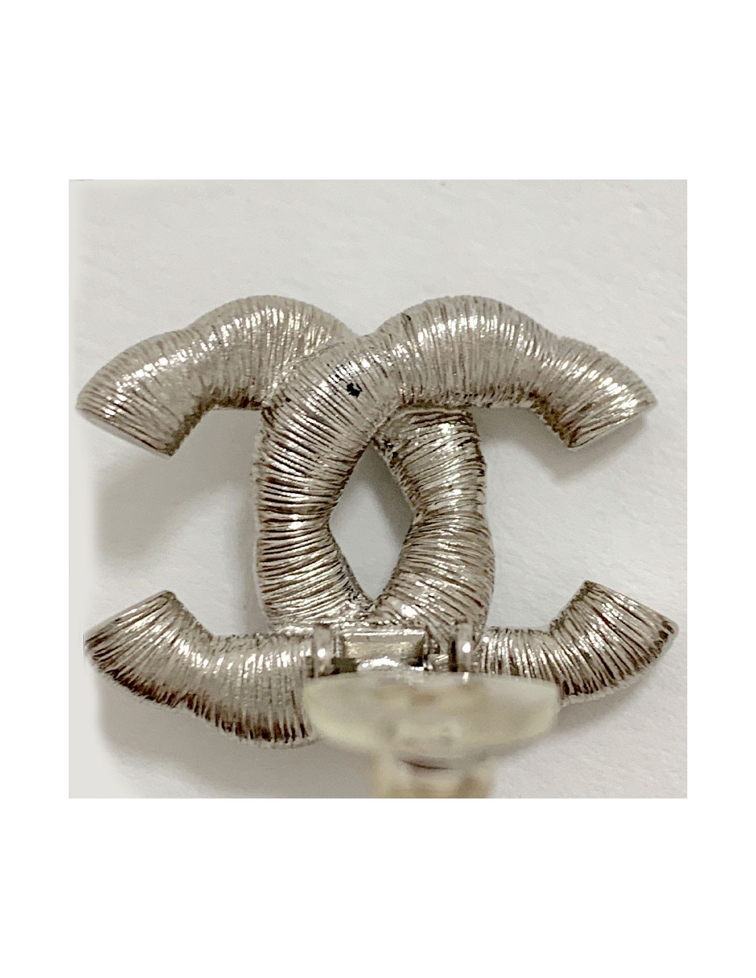Belle paire de clip CHANEL CC en métal argenté, sertis de strass blancs et noirs. Il y a un bel effet torsadé du métal qui confère à ces clips une originalité.