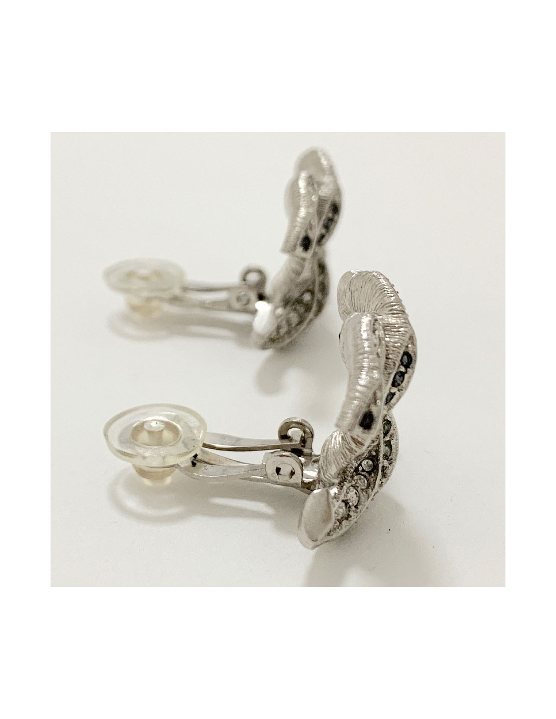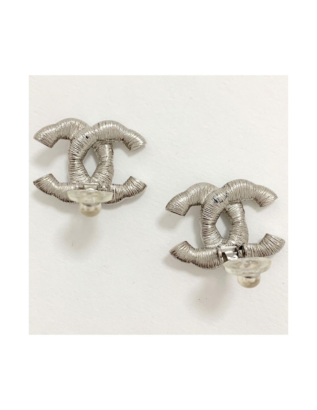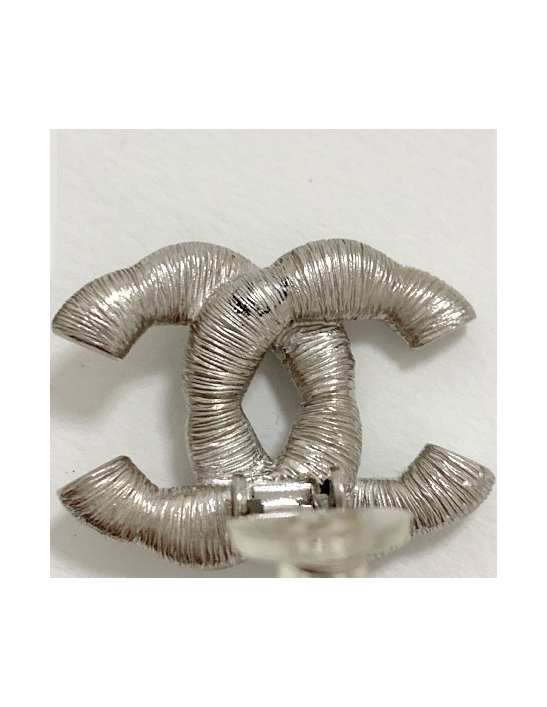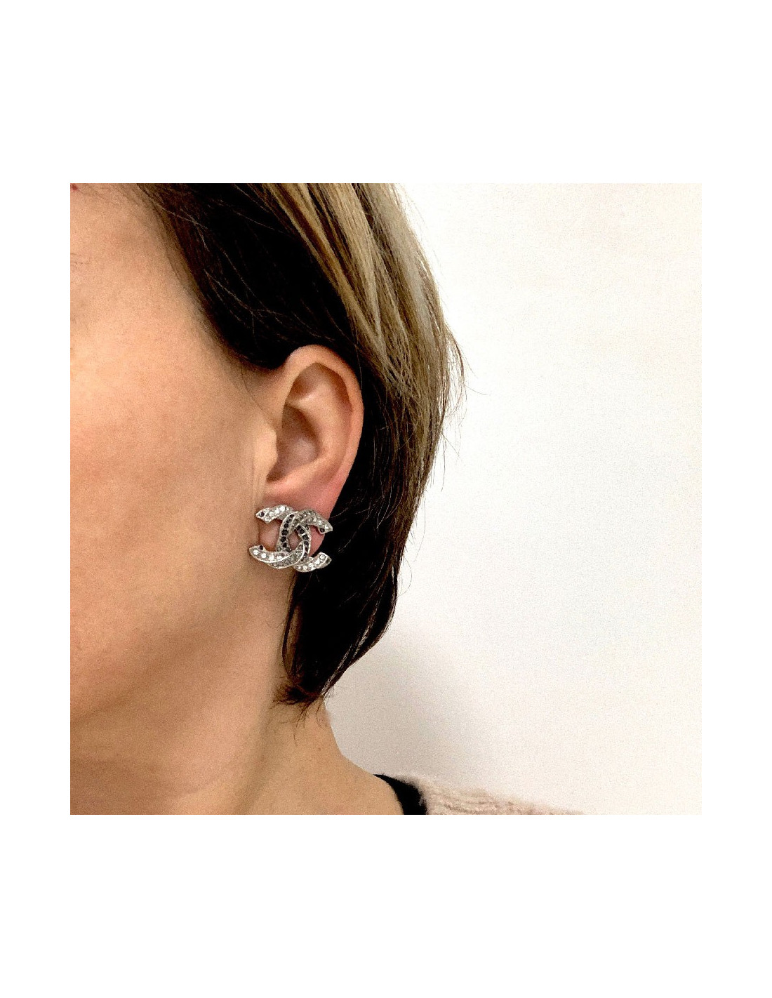 Belle paire de clip CHANEL CC en métal argenté, sertis de strass blancs et noirs. Il y a un bel effet torsadé du métal qui confère à ces clips une originalité.