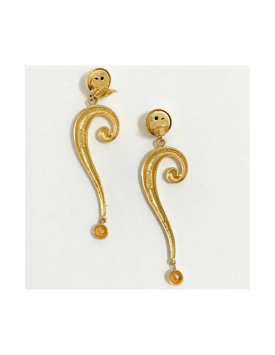 Boucles d'oreille clips très légères de la Maison MOSCHINO. Elles sont en métal doré. Le clip tient bien aux oreilles.