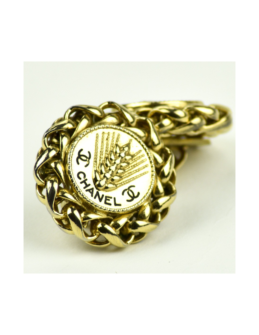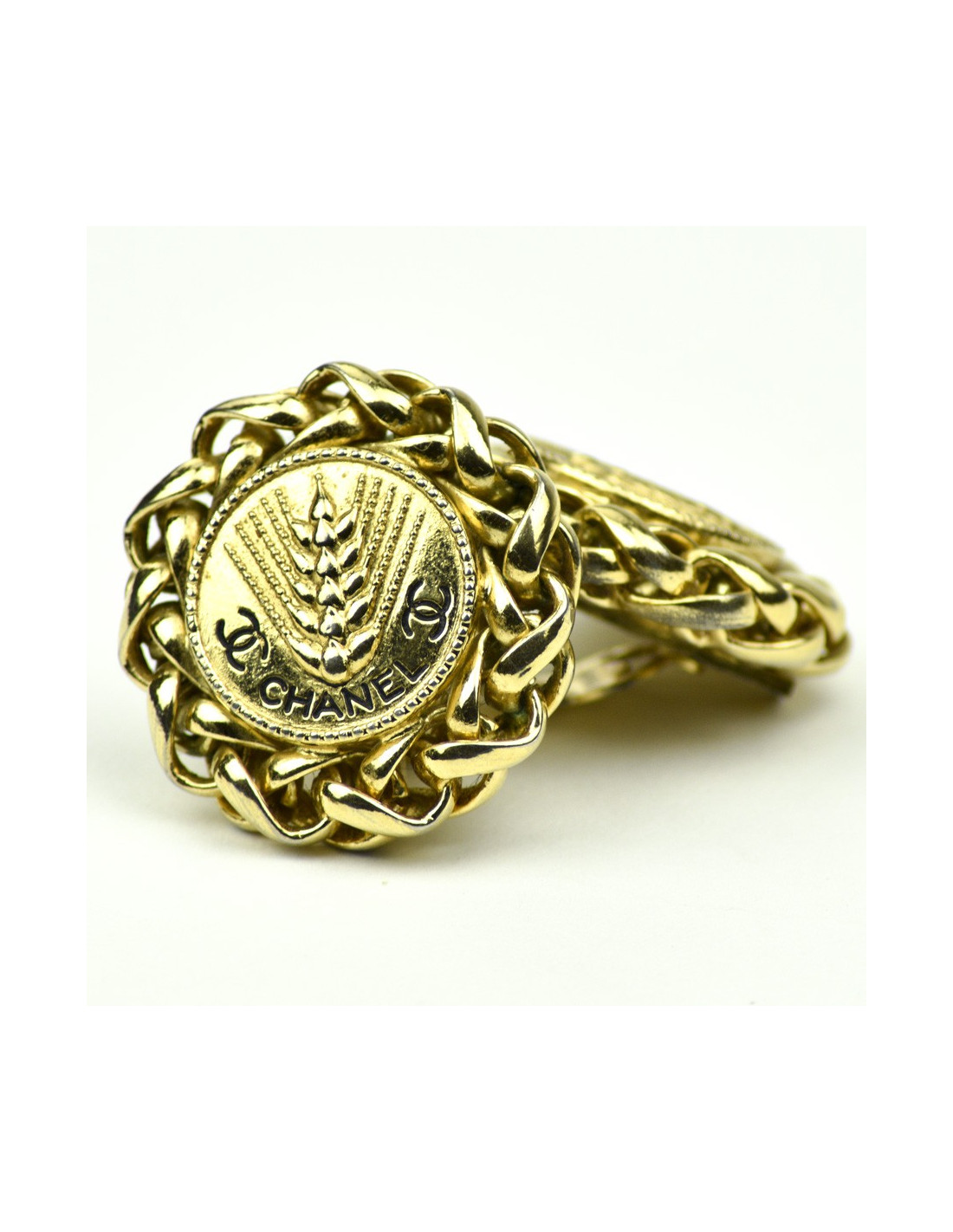 Superbes boucles d'oreille clips Chanel rondes en métal doré avec en leur centre un motif "épi de blé" ainsi que la mention de la marque CHANEL CC.