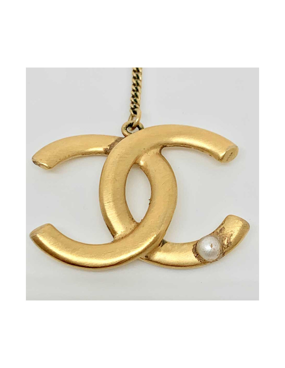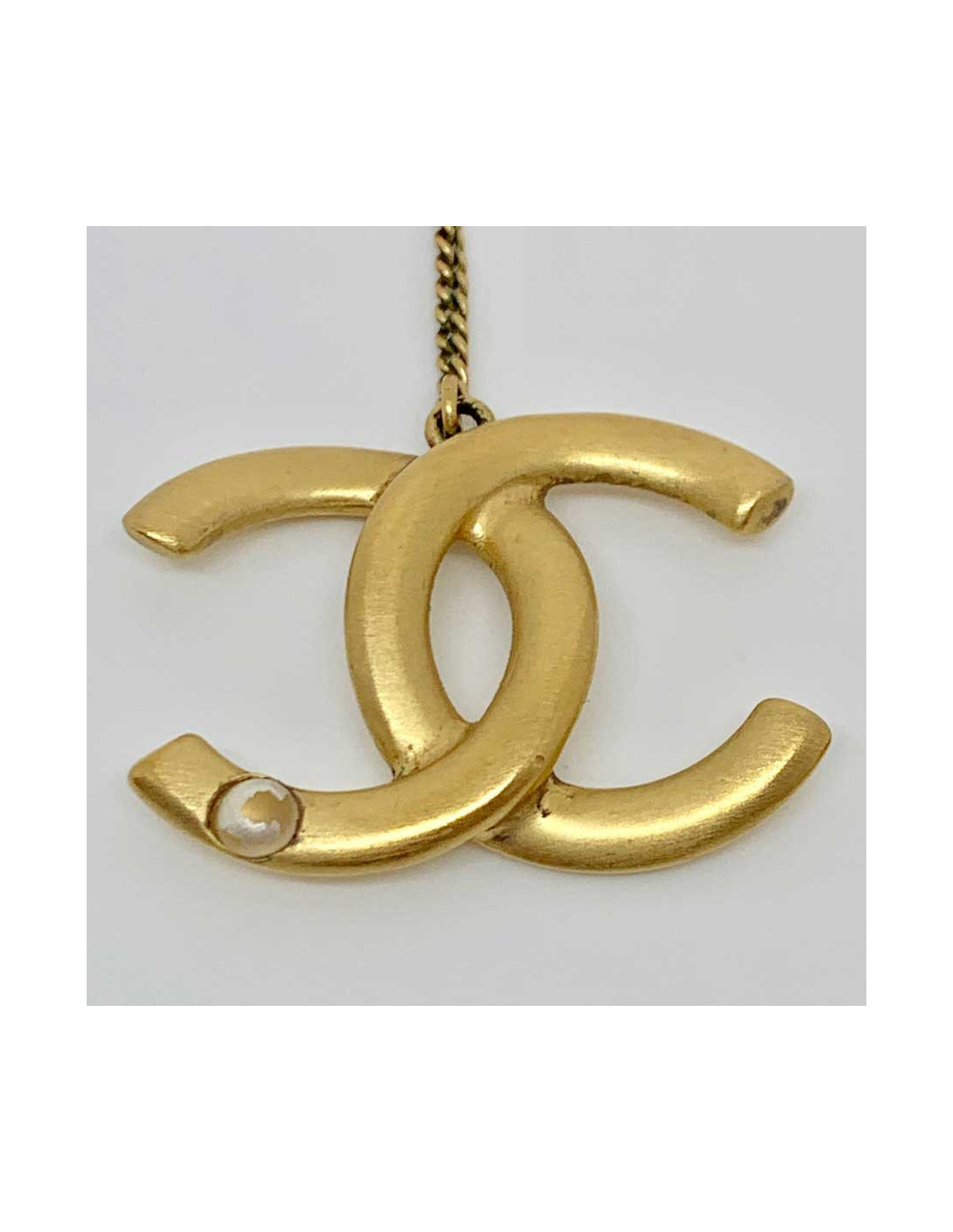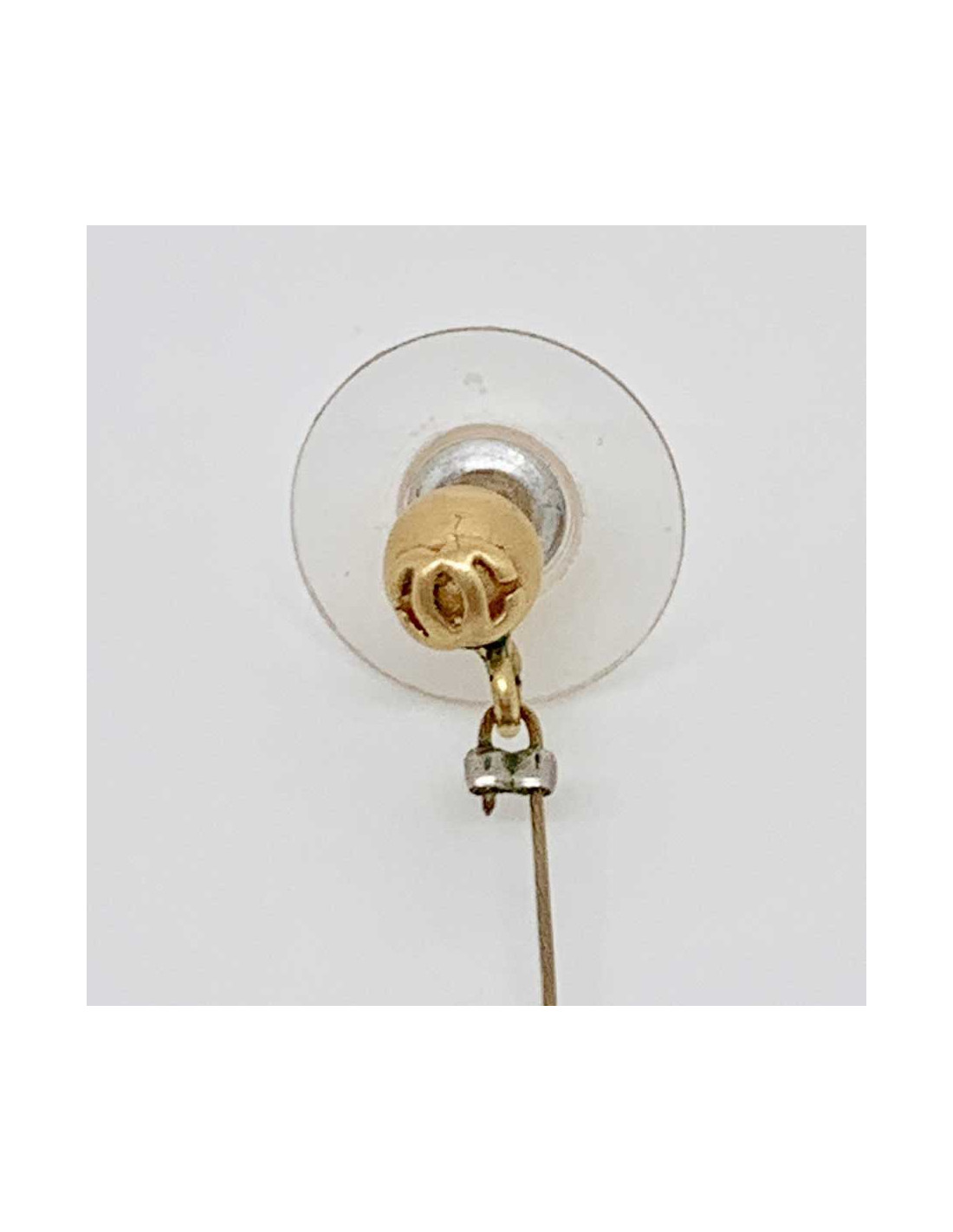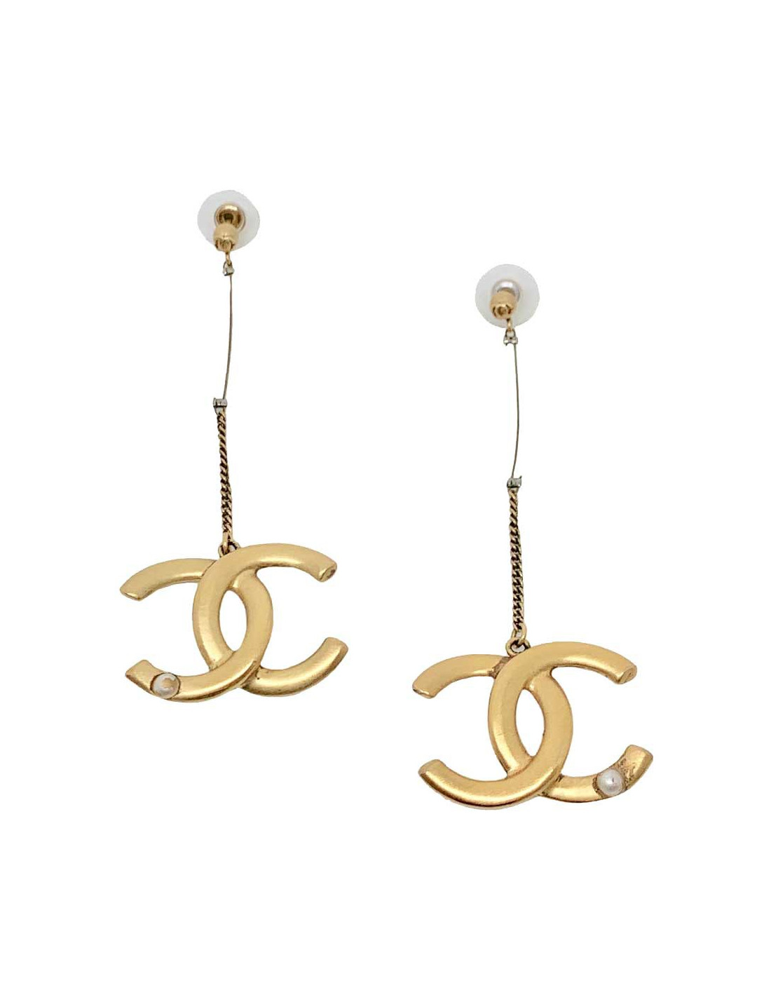 Originale paire de boucles d'oreille clous CHANEL. C'est un CC pendant retenu par une petite chaine et un fin câble en métal doré. La couleur est or mat. Sur chaque CC une perle fantaisie nacrée est apposée.