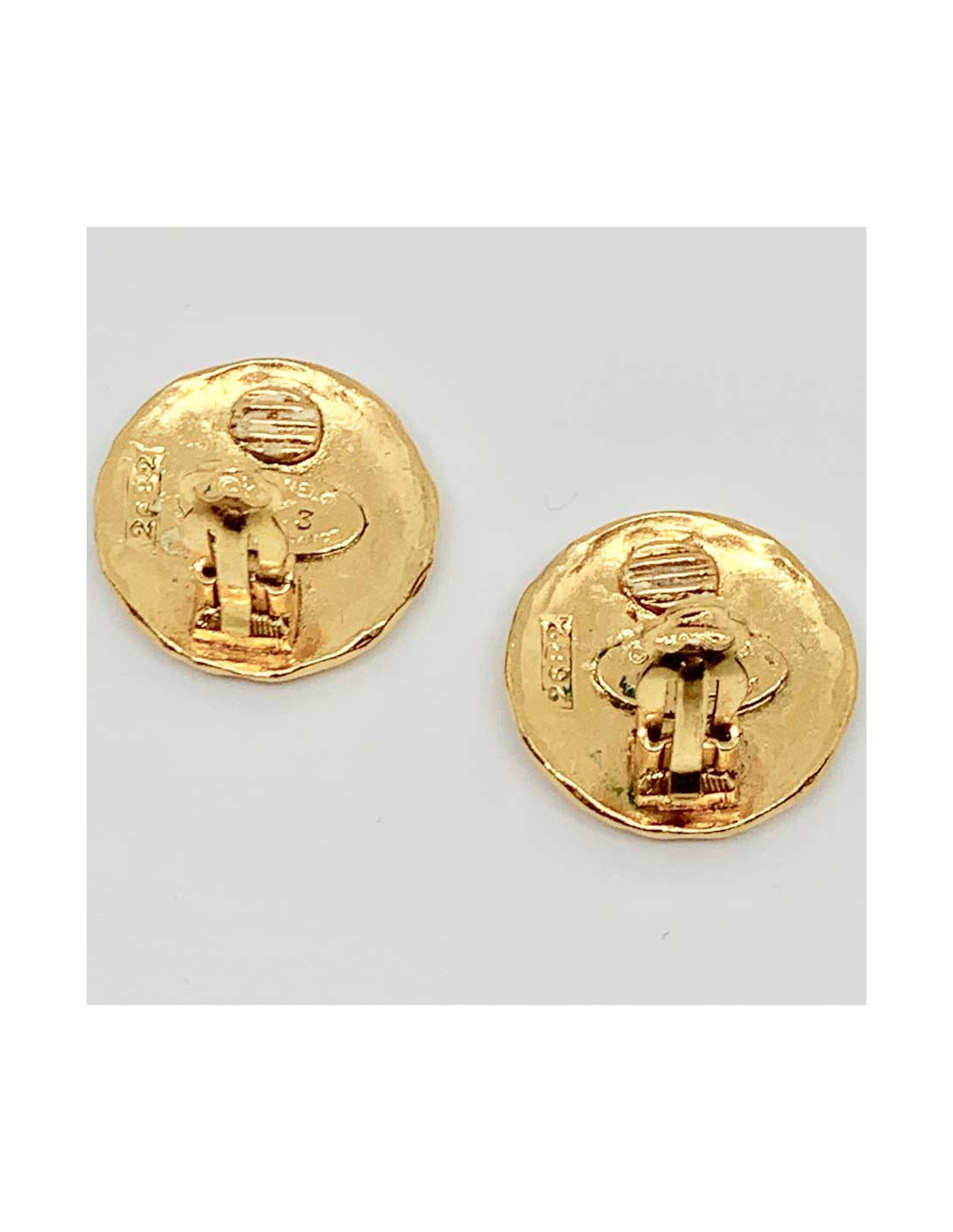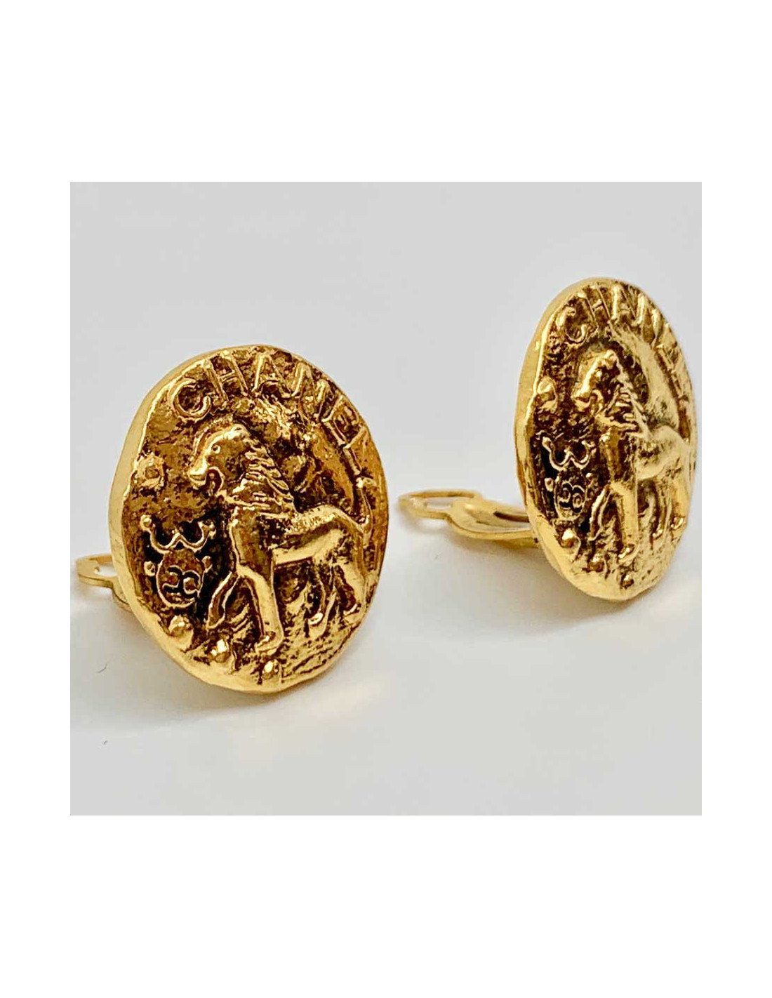 Très belle paire de boucles d'oreille CHANEL des années 80. Clip rond de la taille d'une pièce de monnaie en métal doré représentant un lion (un des symboles de la marque) de profil et en relief. Le métal a un effet martelé.