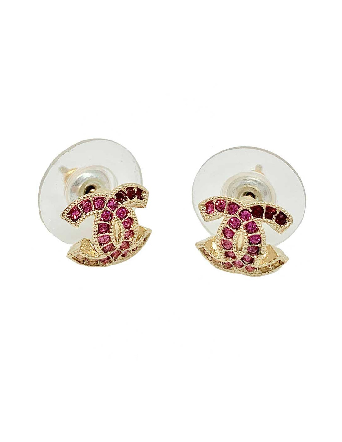 Clous CC de petite taille de la Maison CHANEL. Elégants et raffinés ils sont entièrement sertis de strass allant du rose très clair au grenat tel un effet tye and die.