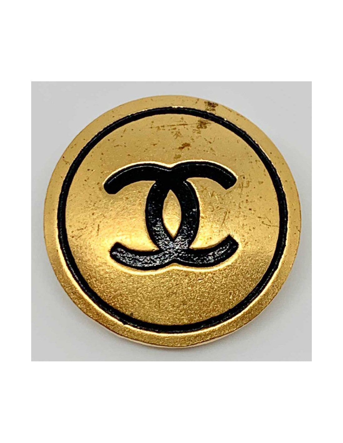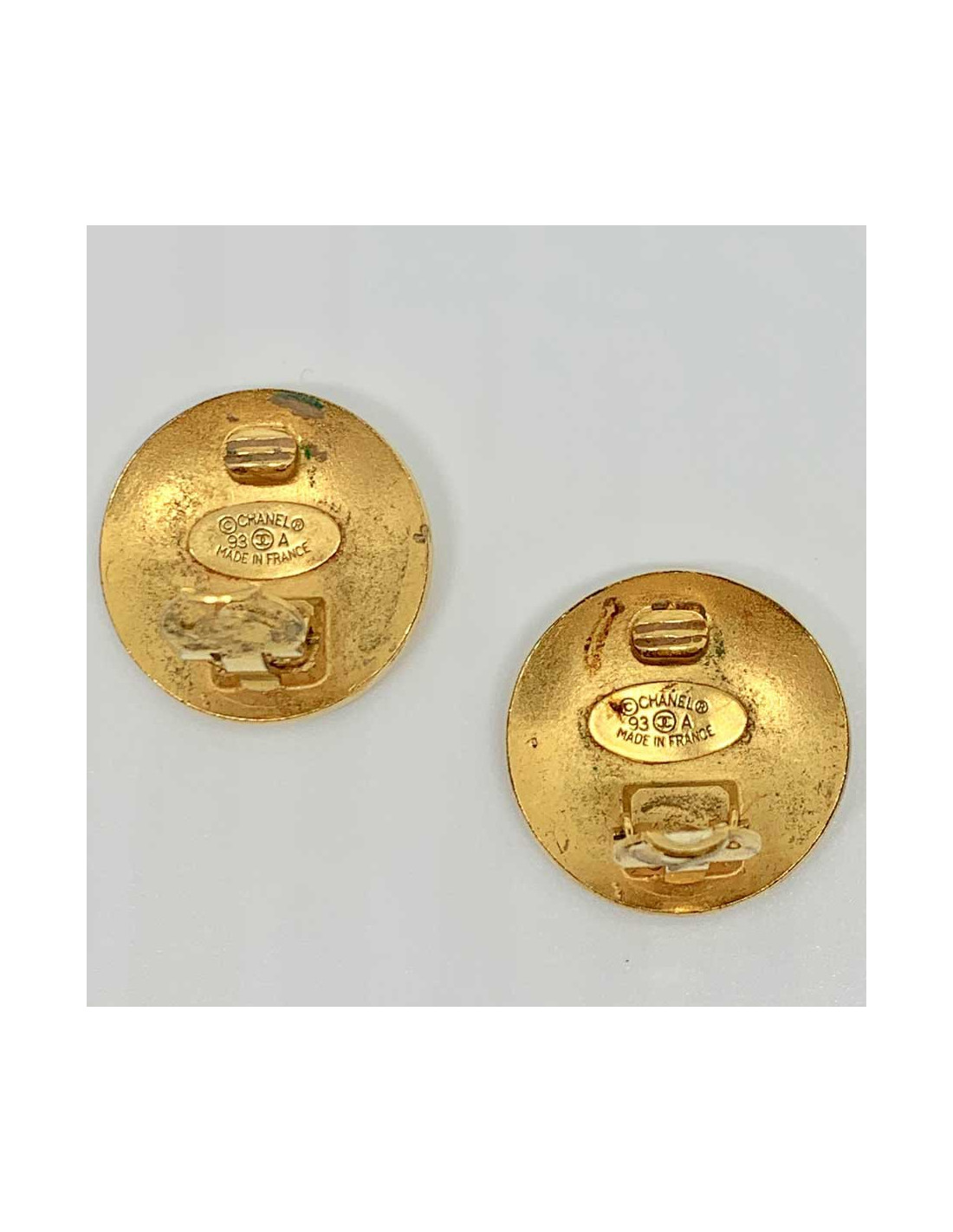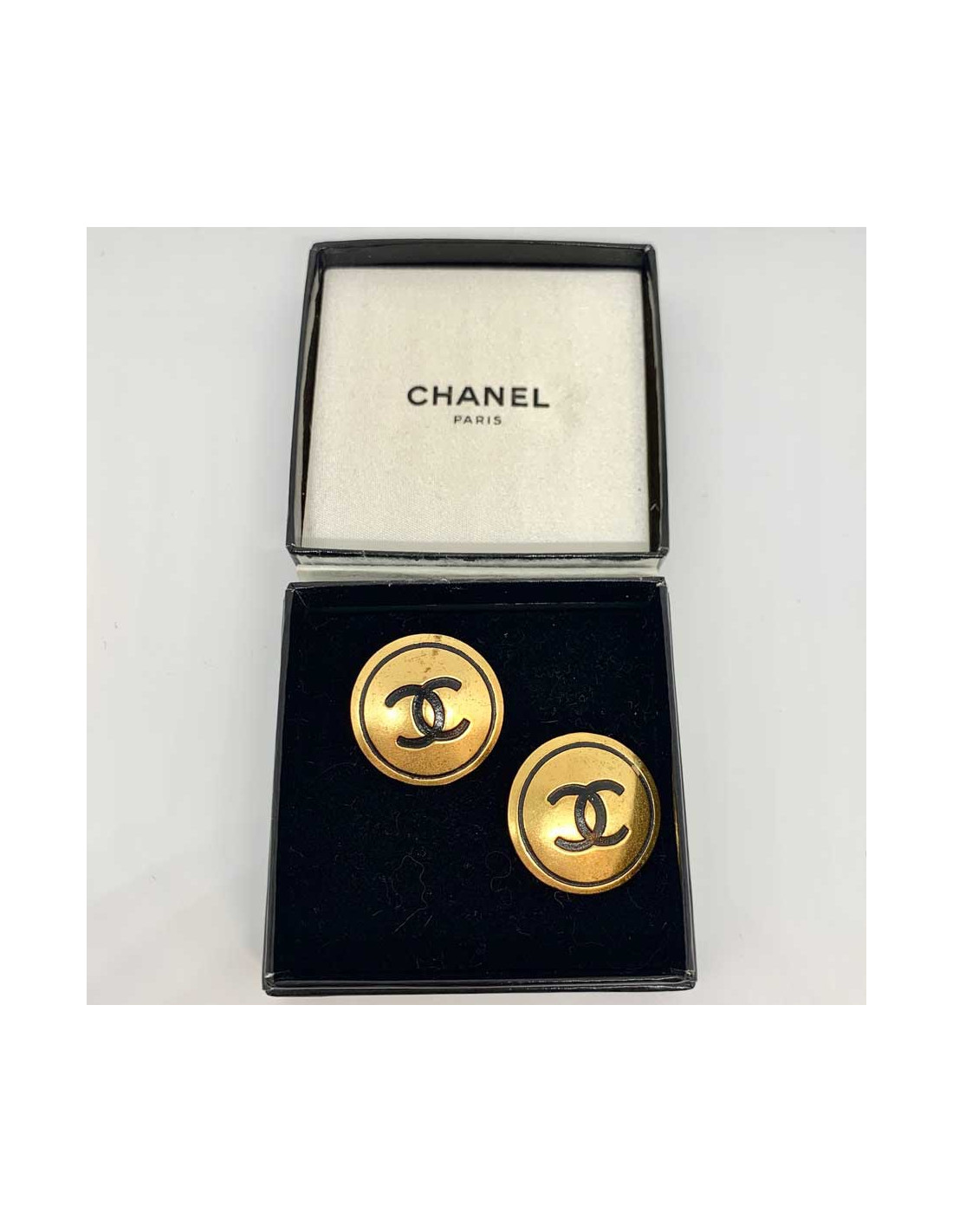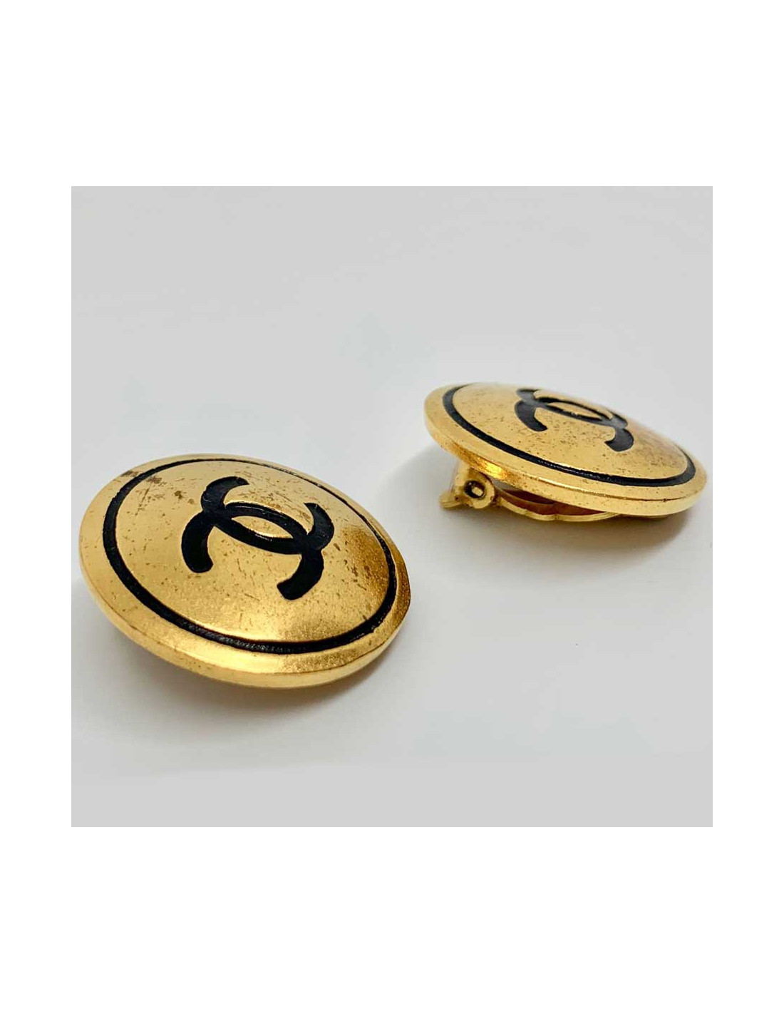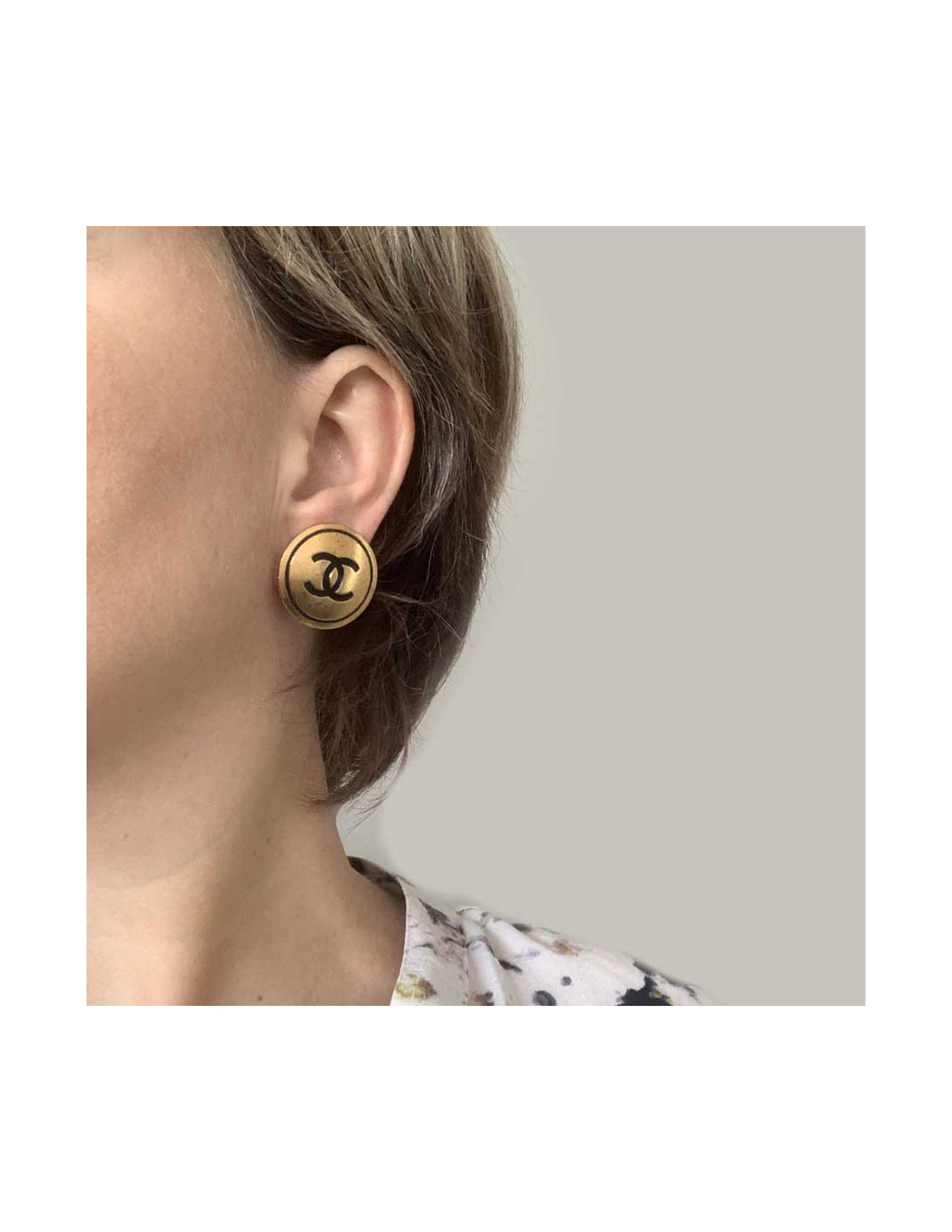 Paire de boucles d'oreille clips ronds de la Maison CHANEL en métal doré. Le CC est gravé et peint en noir au centre. Un contour en noir souligne également la boucle d'oreille.