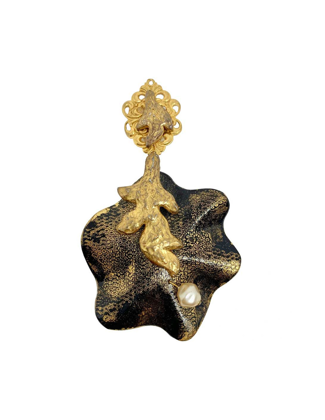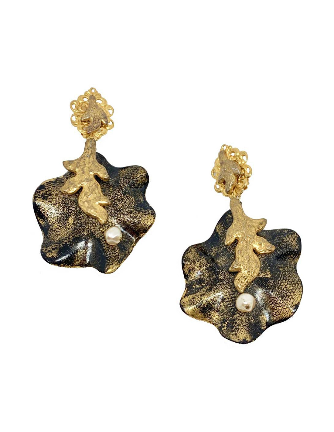 Très belle paire de clips non signés mais attribués à la marque Yves Saint Laurent (paire de défilé). Boucles d'oreille représentant un feuillage dans des teintes de bronze, or, surmontées d'une perle nacrée. La couleur bronze apporte un effet cuir des plus esthétiques. Ces bijoux sont vintage.