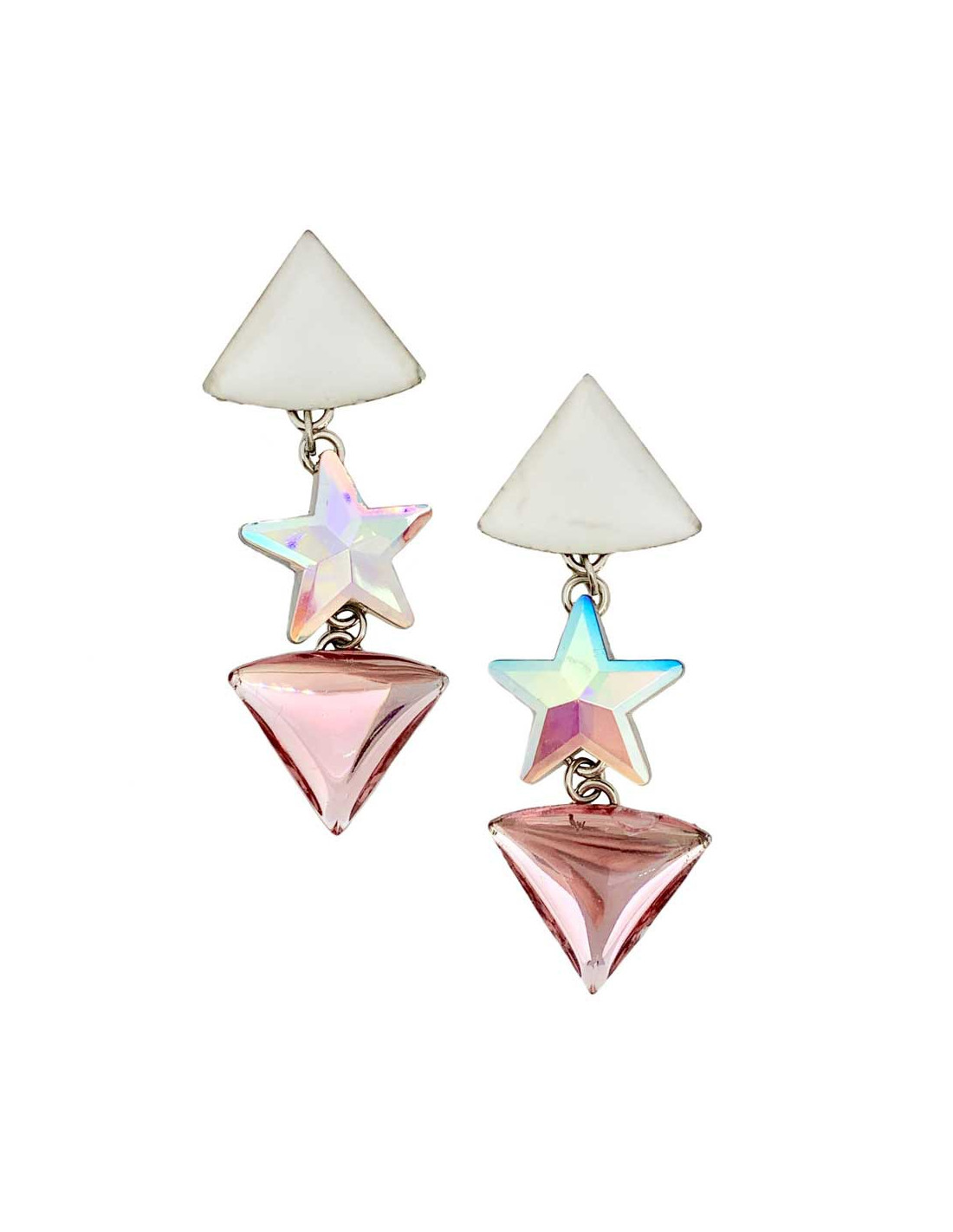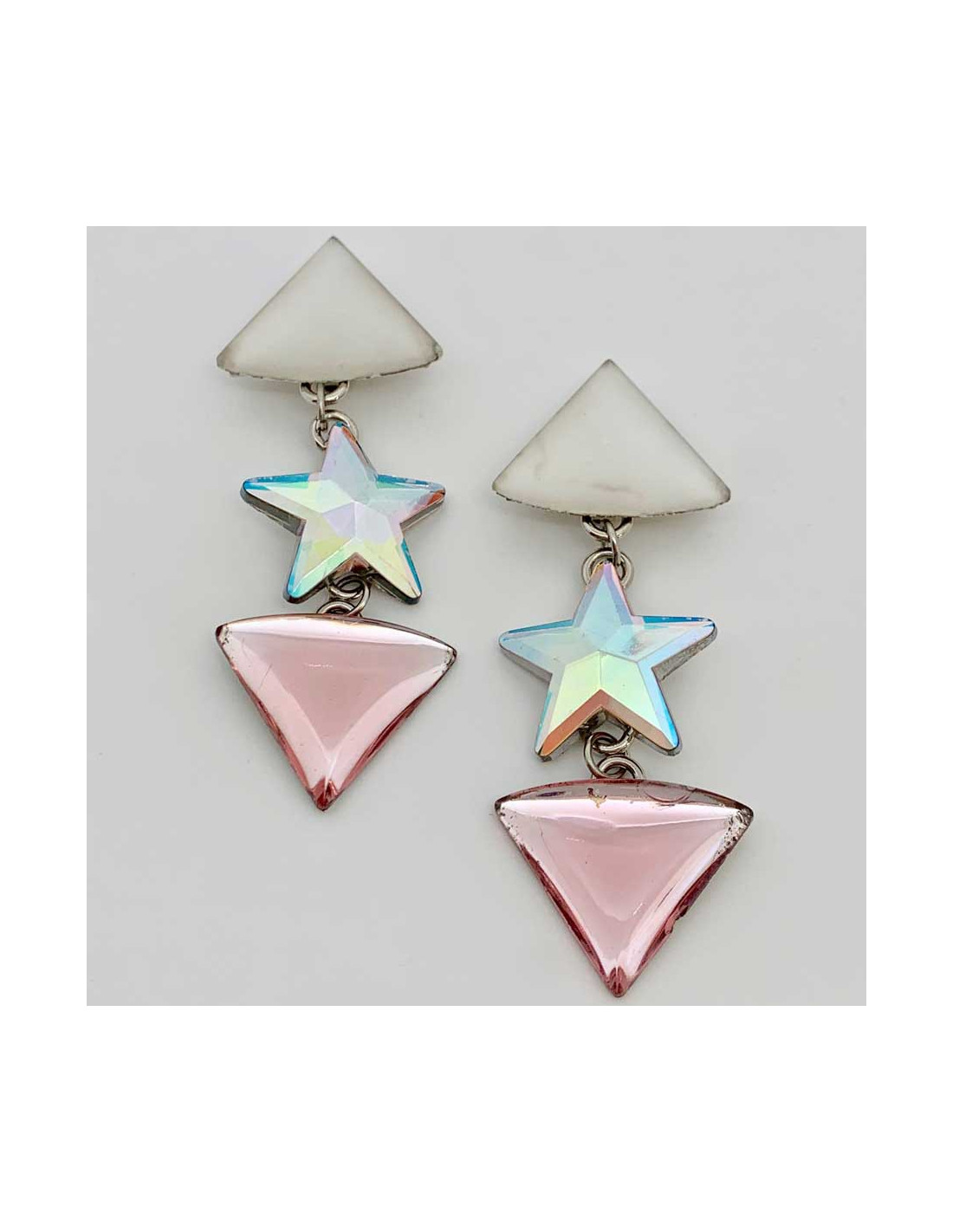 Grand retour des années 90! Originales et fashion! Clips pendants fantaisie représentant des triangles et une étoile en résine blanc mat, rose pâle. L'étoile a un effet miroir arc en ciel.