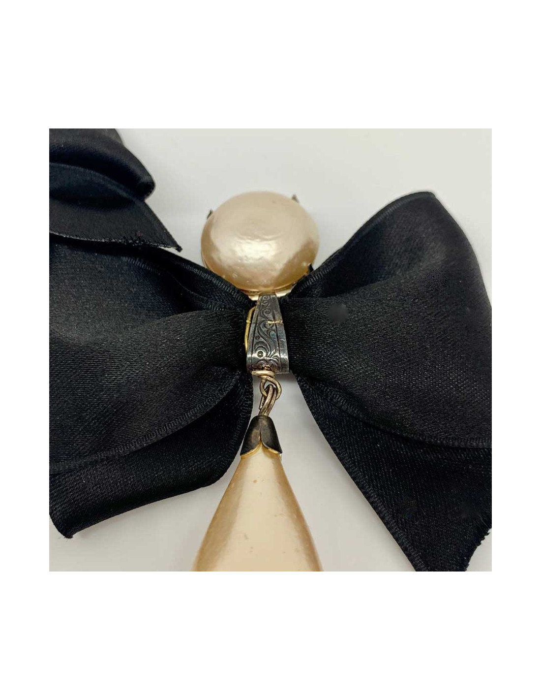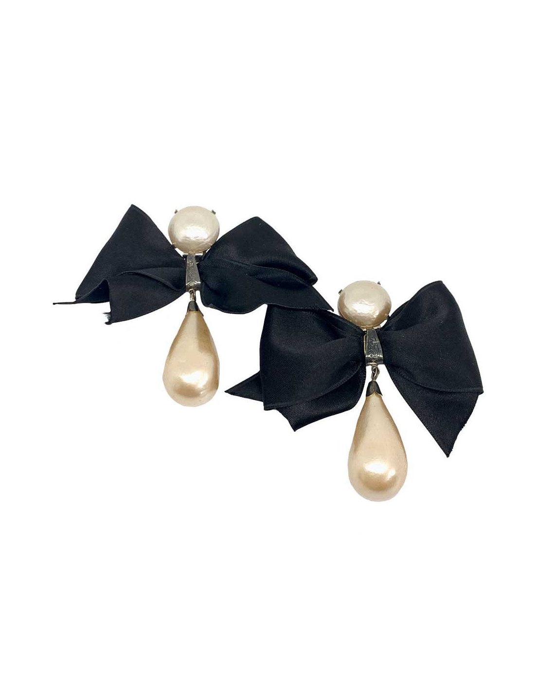 Look CHANEL pour ce bijou vintage non signé. Clip composé d'une perle ronde nacrée d'un noeud en satin noir et d'une perle nacrée en forme de poire.