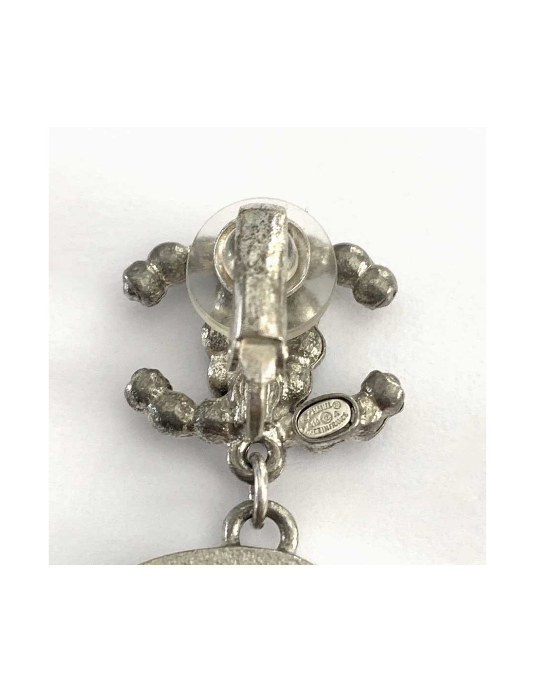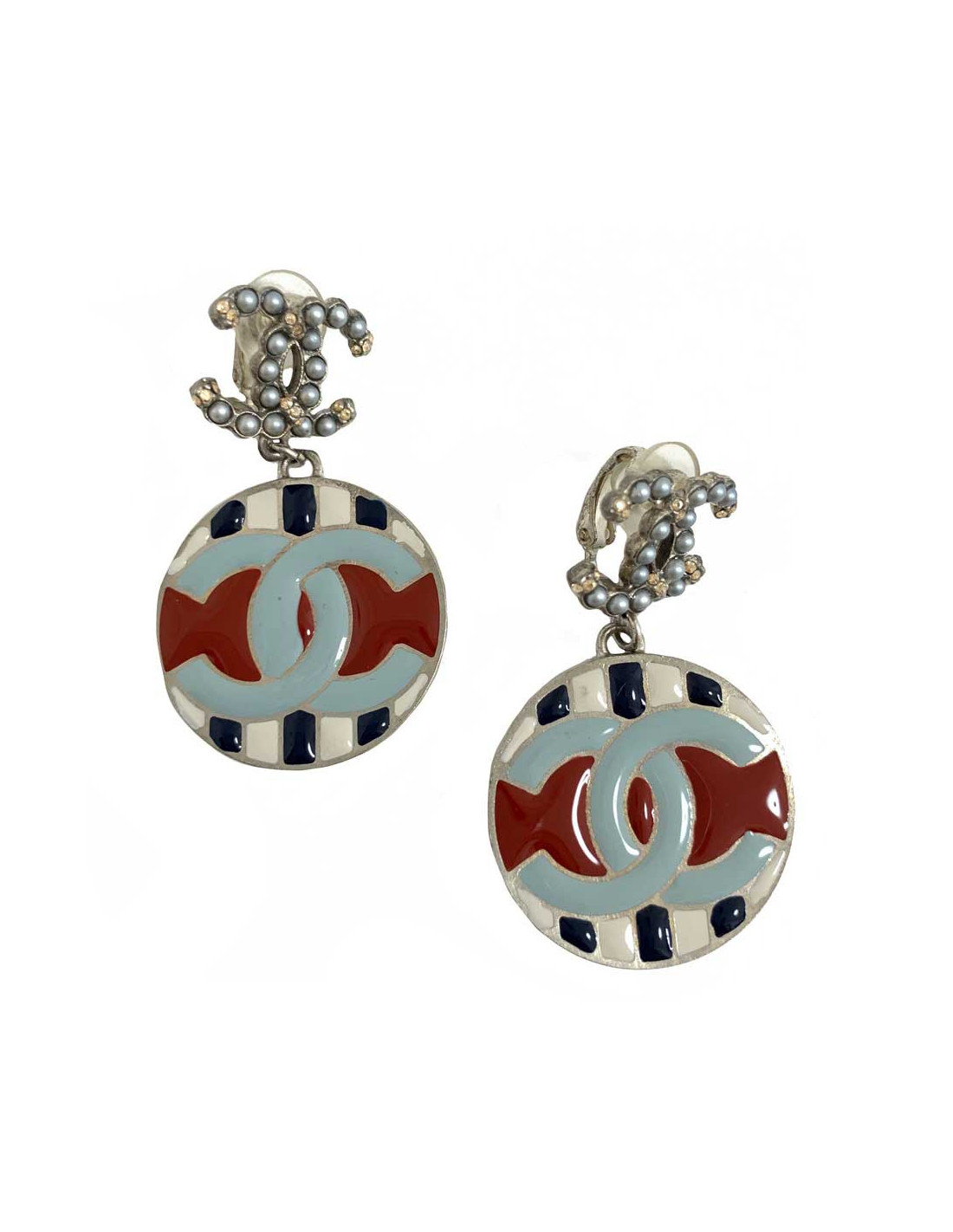 Les boucles d'oreille sont des clips de la Maison CHANEL. Un CC perlé gris au niveau du fermoir sur lequel pend une plaque ronde en métal recouvert d'émail bleu, rouge et blanc. Un CC de taille importante est au centre.