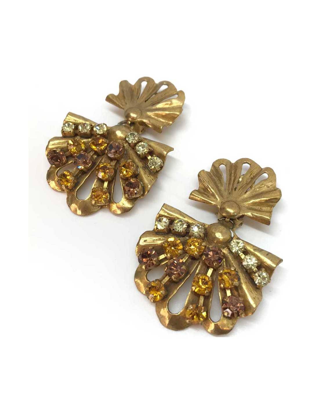 Ces boucles d'oreille sont des clips en forme d’éventails inversés issus de la Maison ROCHAS en métal doré qui comportent des strass dans les couleurs jaunes, rose et orange. 6 strass jaunes clairs, 6 strass oranges, 4 strass rosés sur chacun des clips.