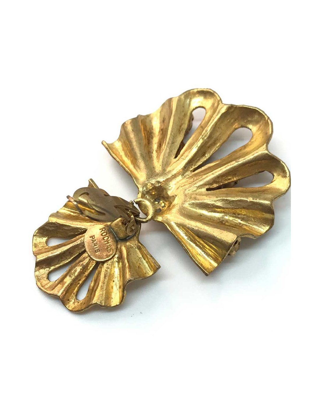 Les clips sont vintage et en bon état. Le métal doré s'est effacé par endroits mais les clips restent pour du vintage en bon état. Aucun strass ne manquant à la paire. Présence de la pastille ROCHAS Paris.