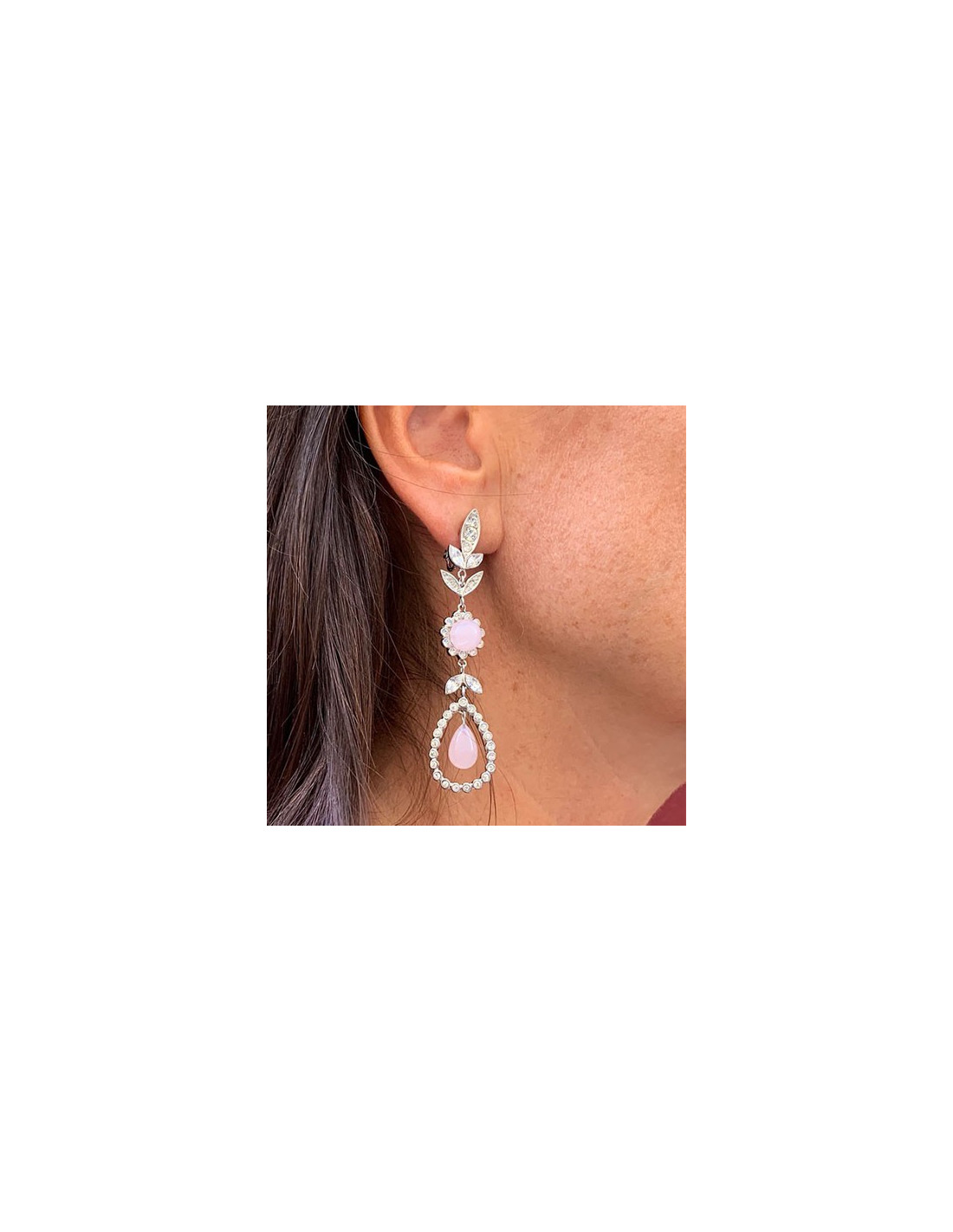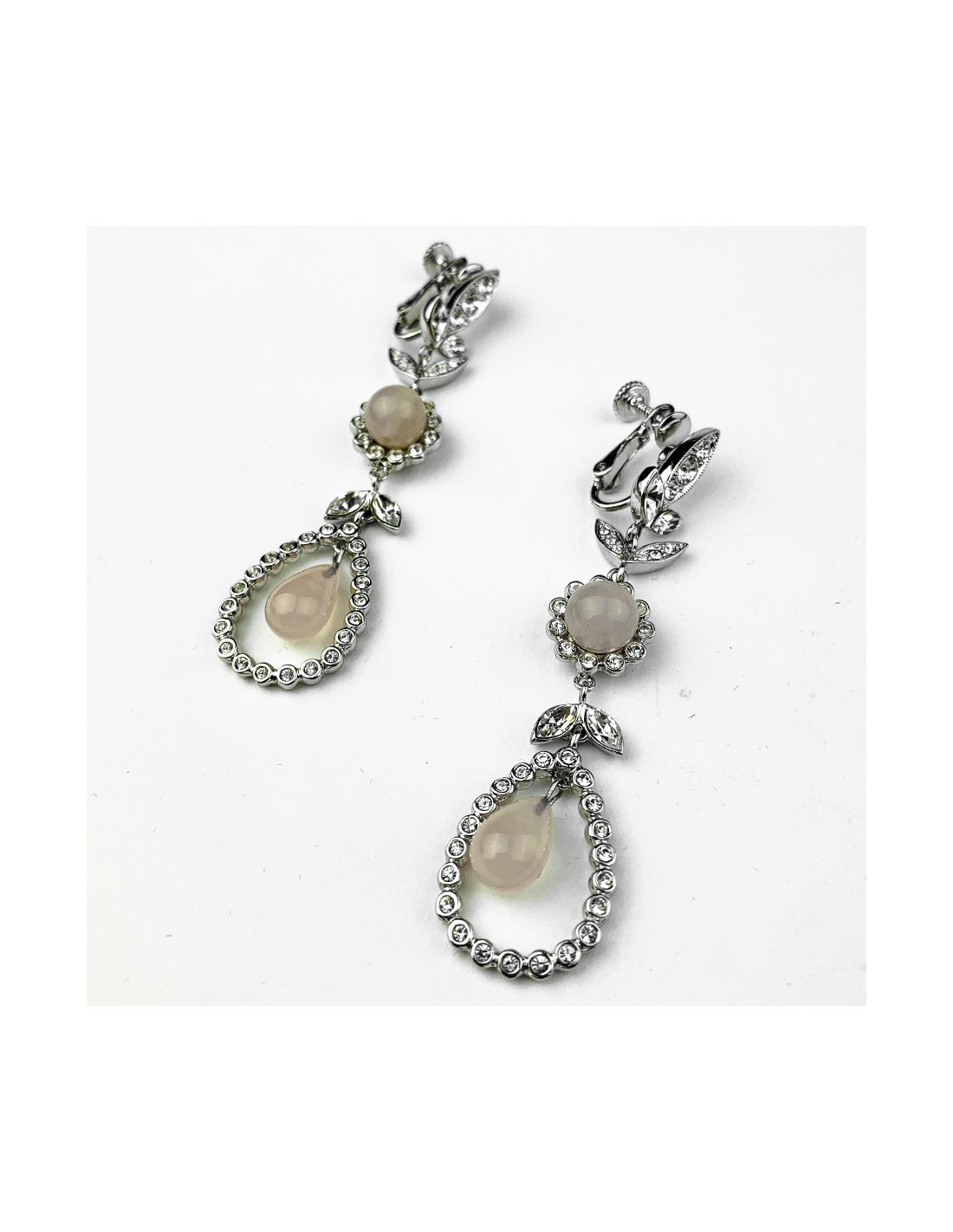 Les boucles d'oreille sont des clips de la Maison Christian Dior. Elles représentent des feuilles en strass au niveau du fermoir qui laissent pendre une petite boule rose sertie de strass sur tout son contour, telle une marguerite. Elles se terminent enfin sur une autre pierre rose taillée en forme de goutte.